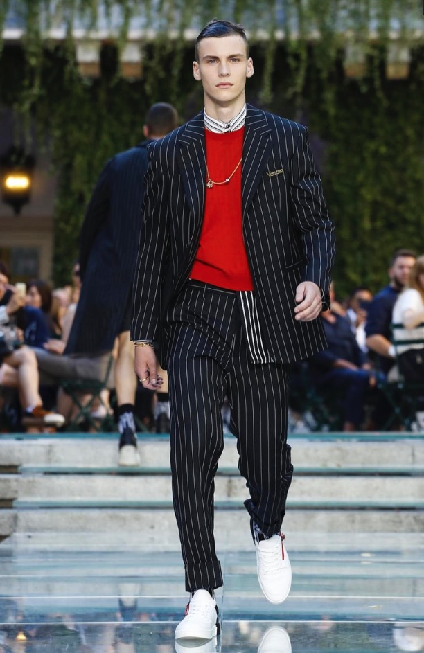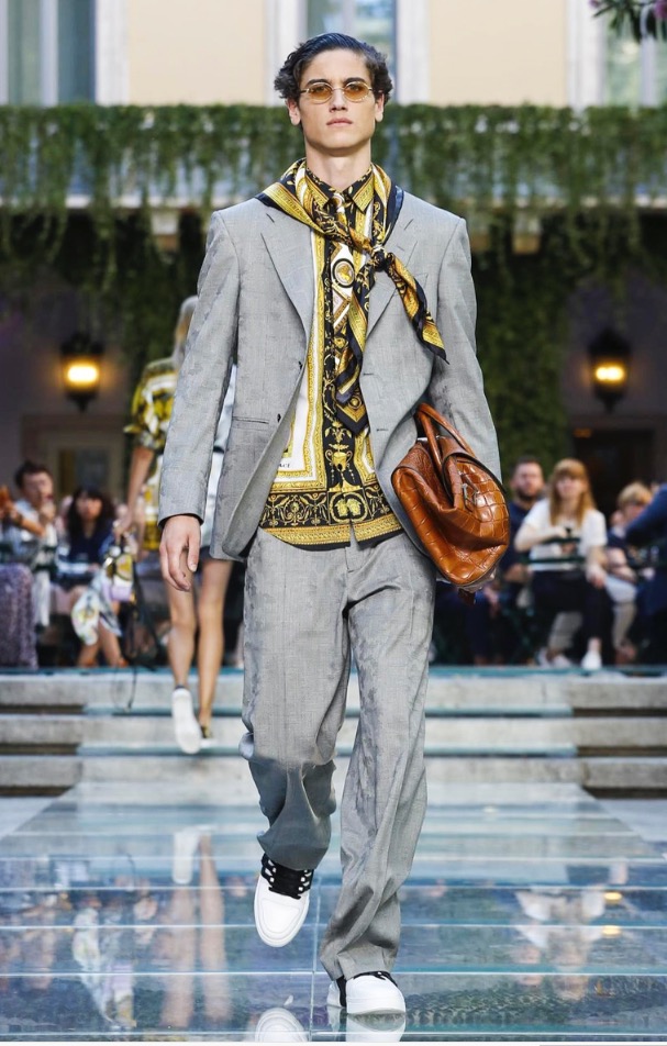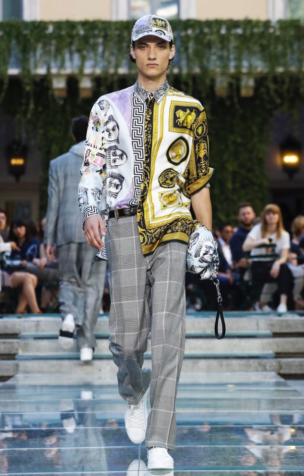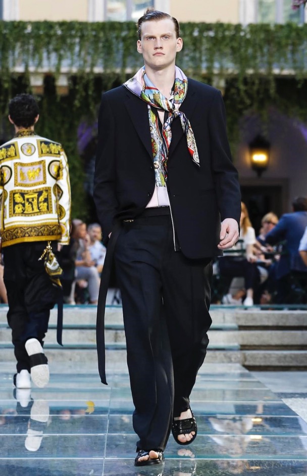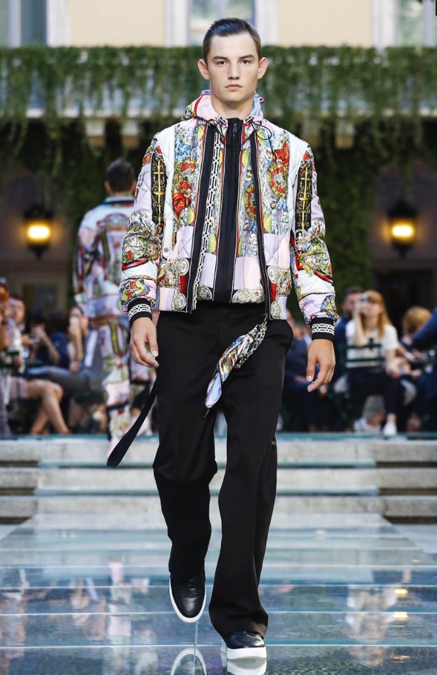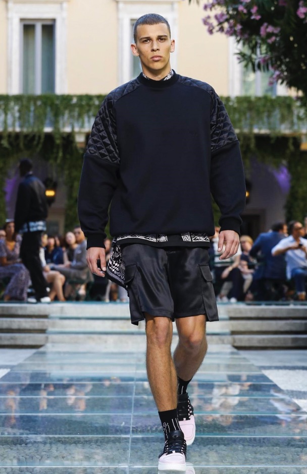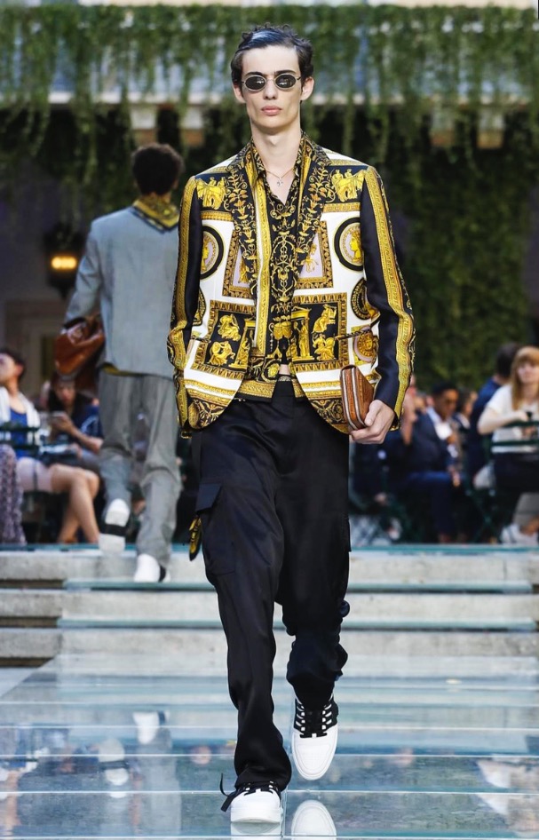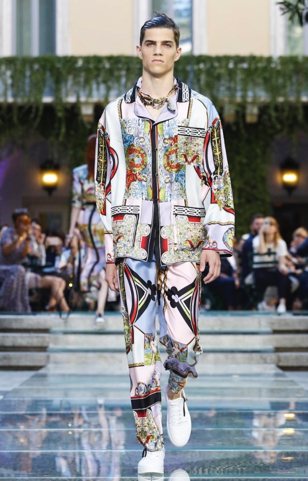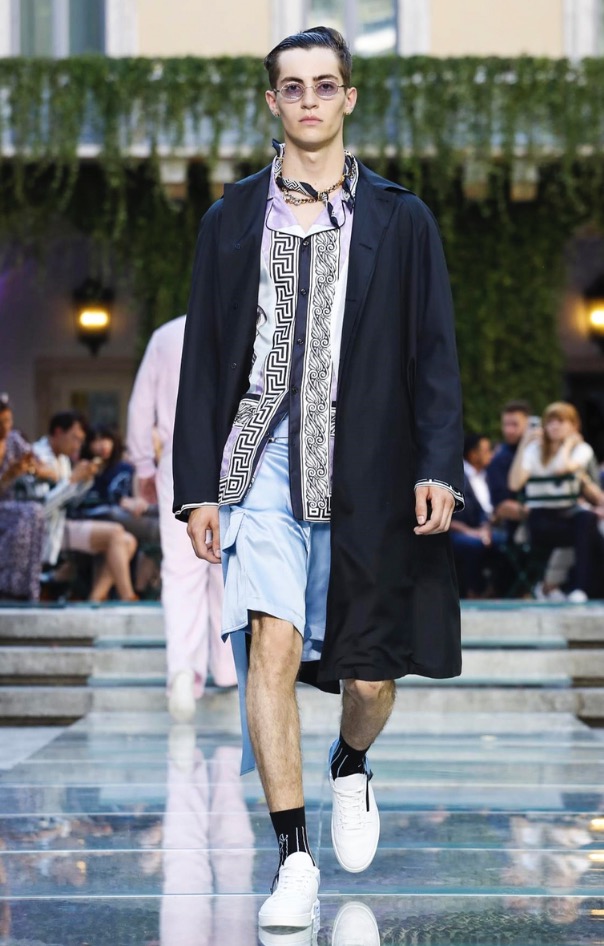 Donatella favorite look in years is worn by Zach Cox, the classic #Versace logo looks totally new, embroidered in white stitches on a pale pink T-shirt. And also in pale blue.