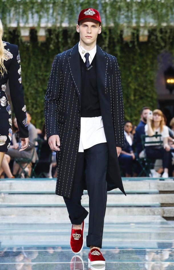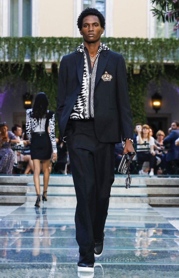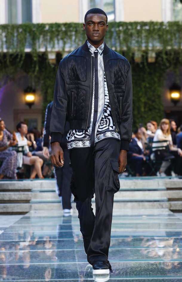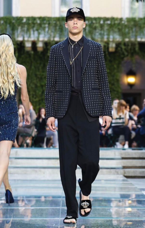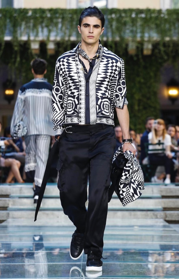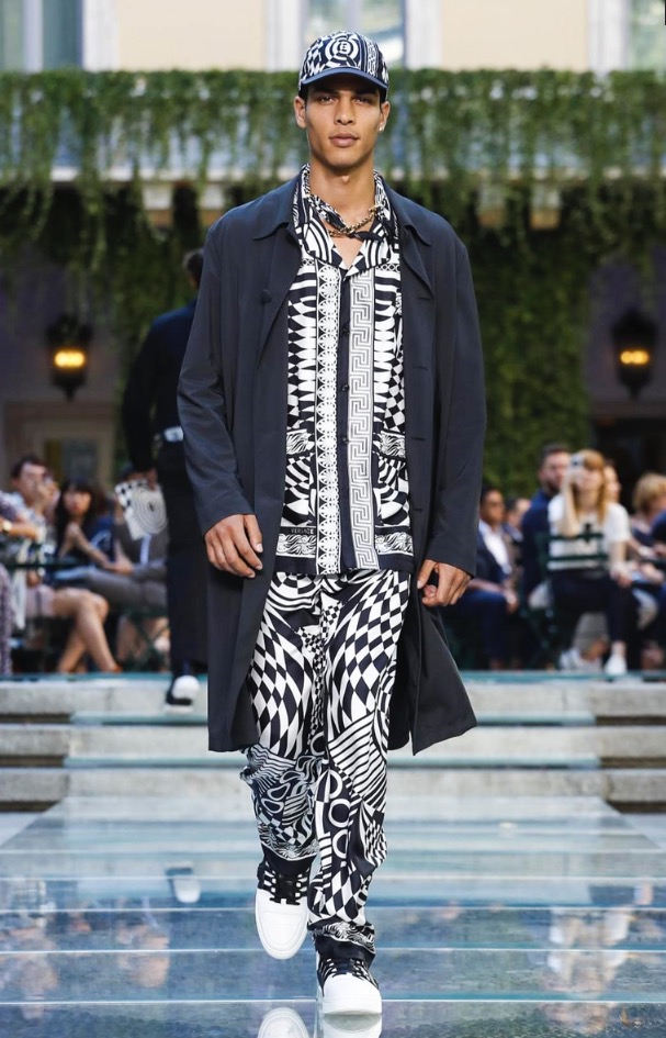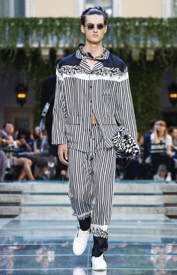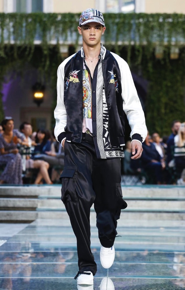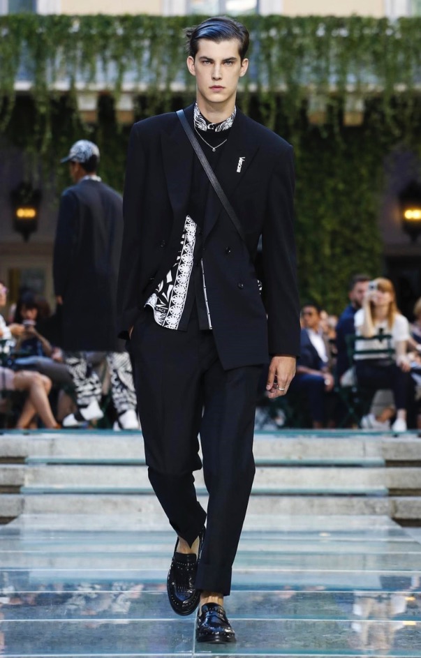 Donatella favorite look in years is worn by Zach Cox, the classic #Versace logo looks totally new, embroidered in white stitches on a pale pink T-shirt. And also in pale blue.