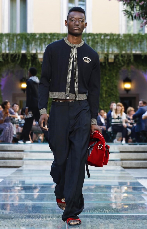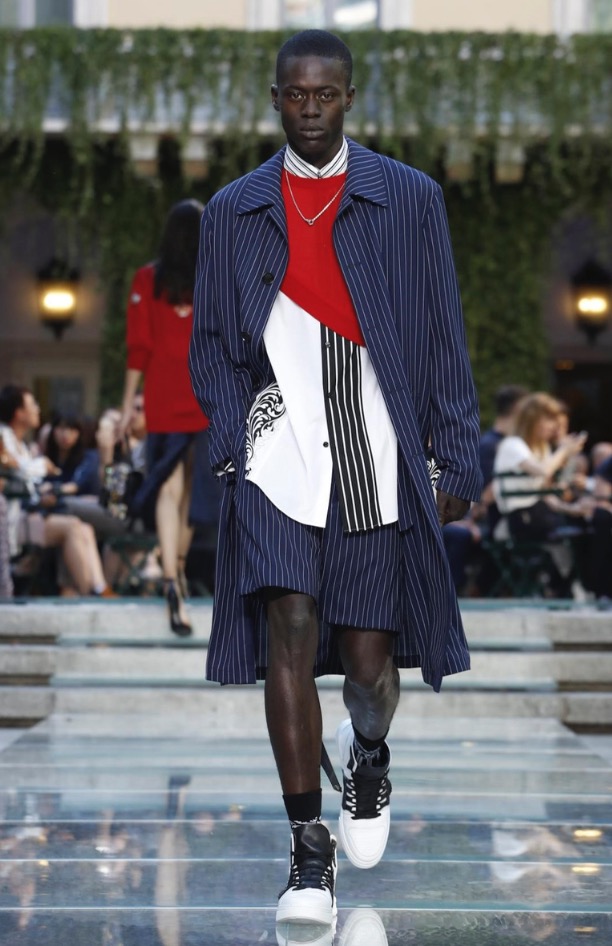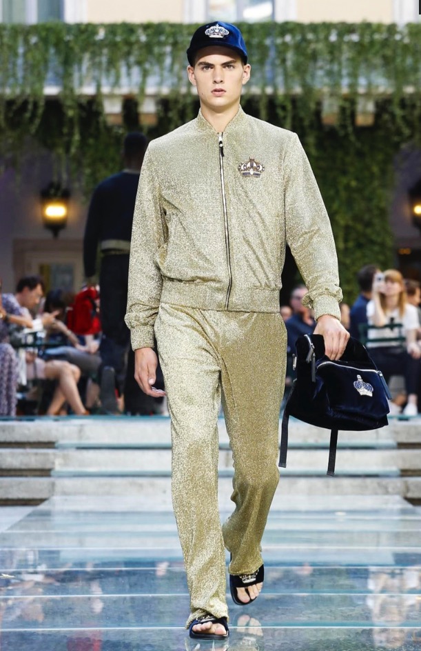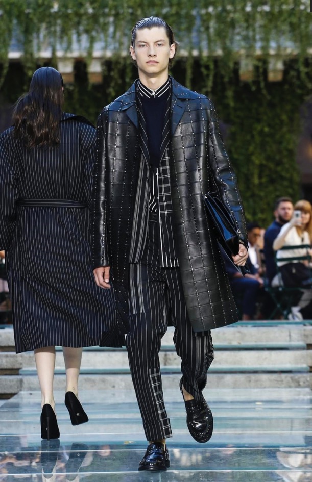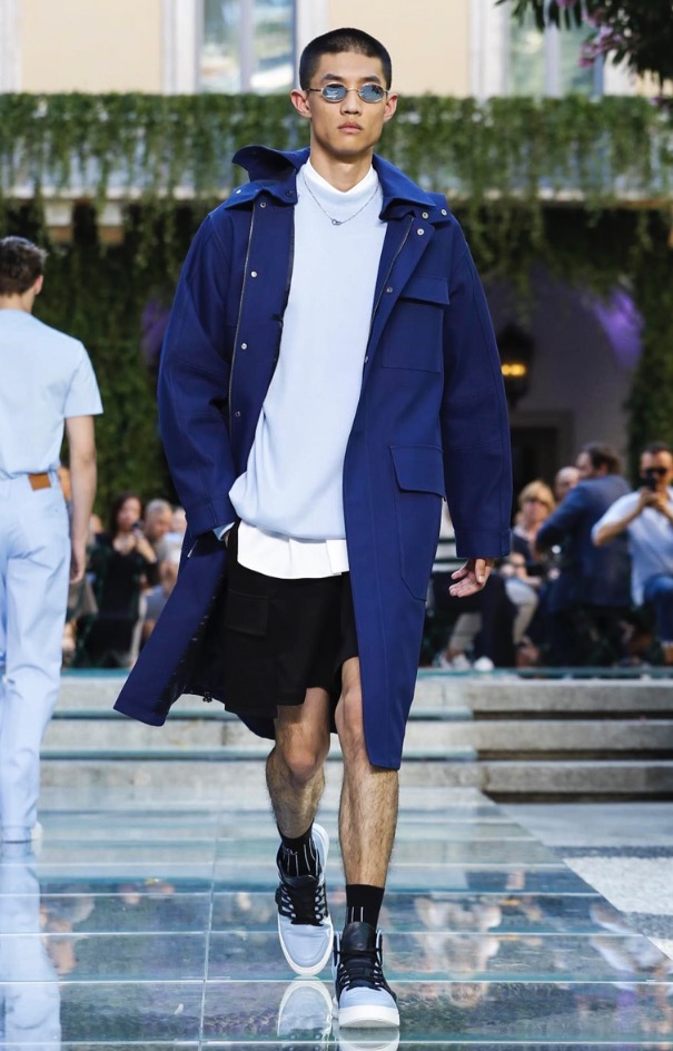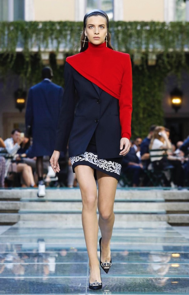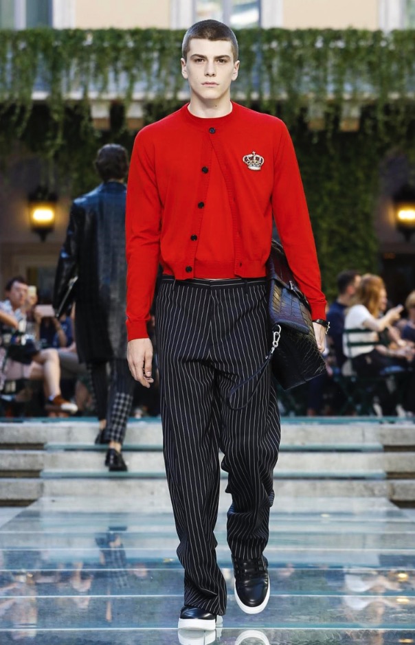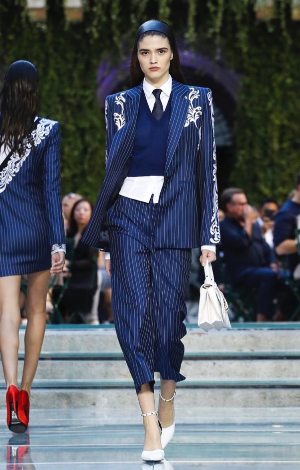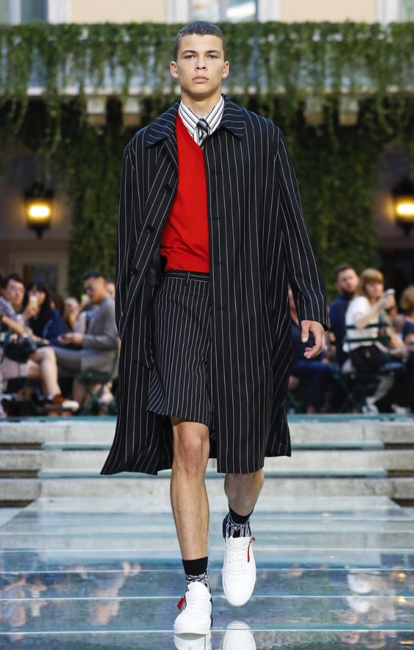 Donatella favorite look in years is worn by Zach Cox, the classic #Versace logo looks totally new, embroidered in white stitches on a pale pink T-shirt. And also in pale blue.