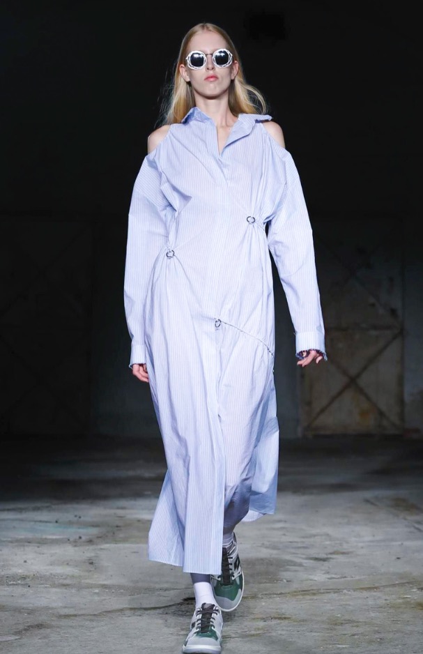 Damir Doma presents genderless fashion show at Via Ferrante Aporti Milano. Including dark garments, layer over layer outfits and a crazy attitude.