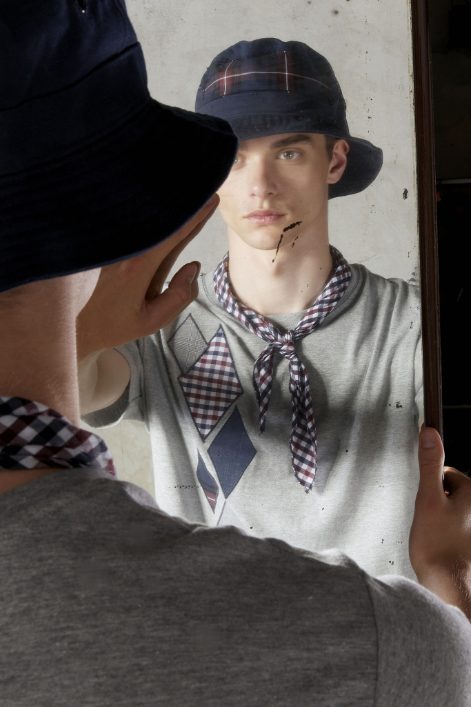 Abstract graphics were used on the backs of parkas and field jackets via the mixing and matching of different fabrics, while macramé lace punctuated a cotton front-pocket jacket with coordinated pants and a micro check shirt with tiny ruffles at the cuffs.