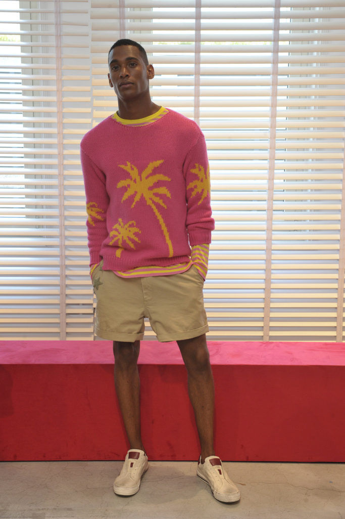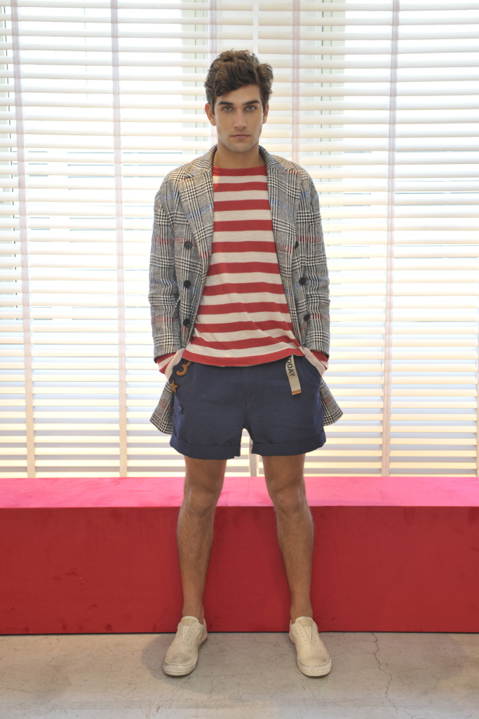 Ermanno Scervino’s man has “more freedom” from next spring, said the Tuscany-based designer. “After women, men, too, have overcome that moment of being shy to dare.” Being free for Scervino meant mixing and matching tailored jackets and British-style trenches with checked shirts and ankle-grazing frayed denim pants. Worn over modern shorts or bermudas, long-sleeve striped jerseys in bright red, yellow or pink peep from under roomy sweaters in cashmere or cotton with palm inlays in the same colors — clearly pointing to a holiday mood, observed Scervino.