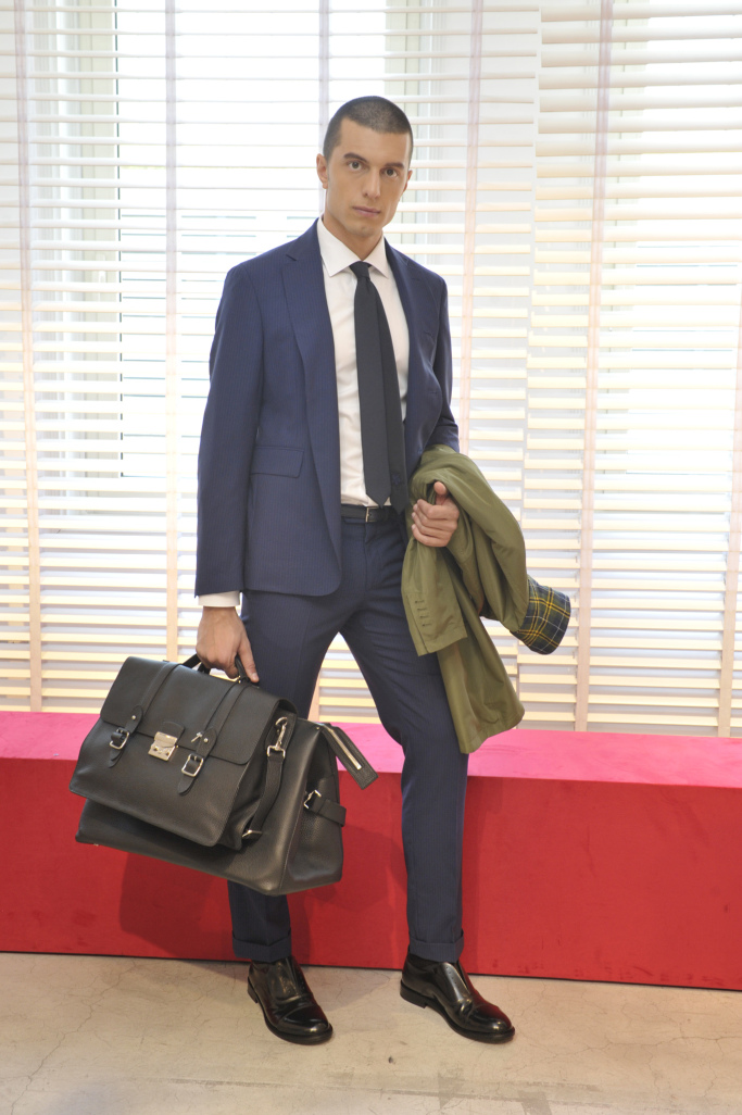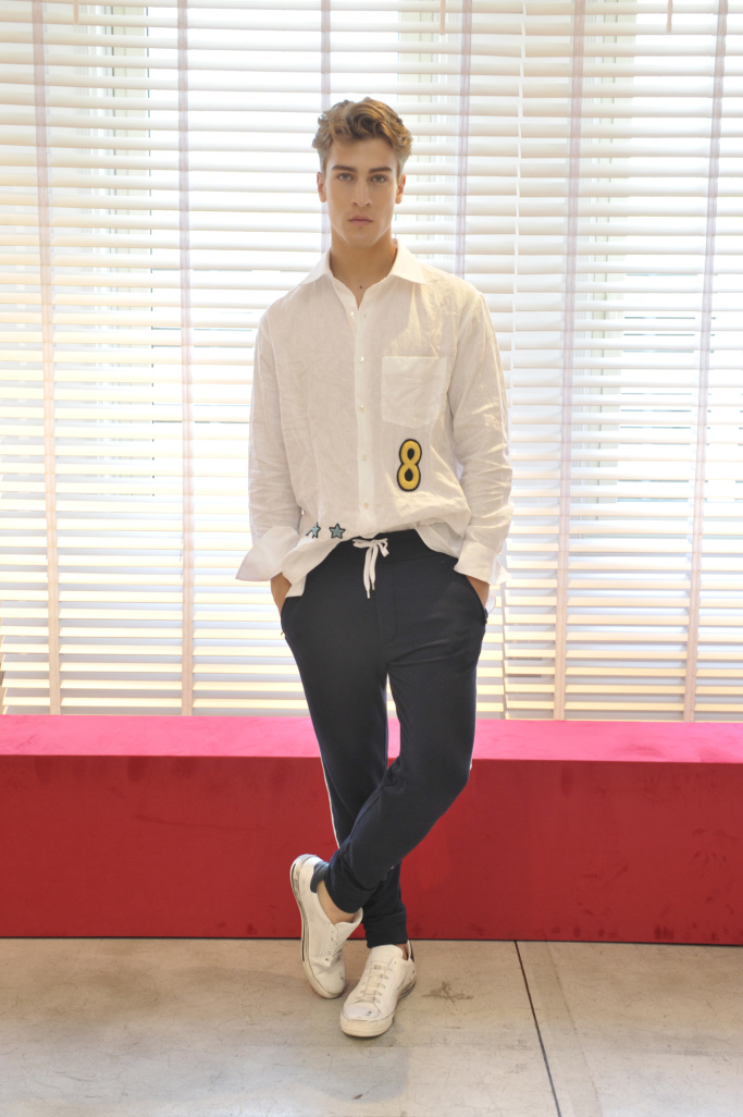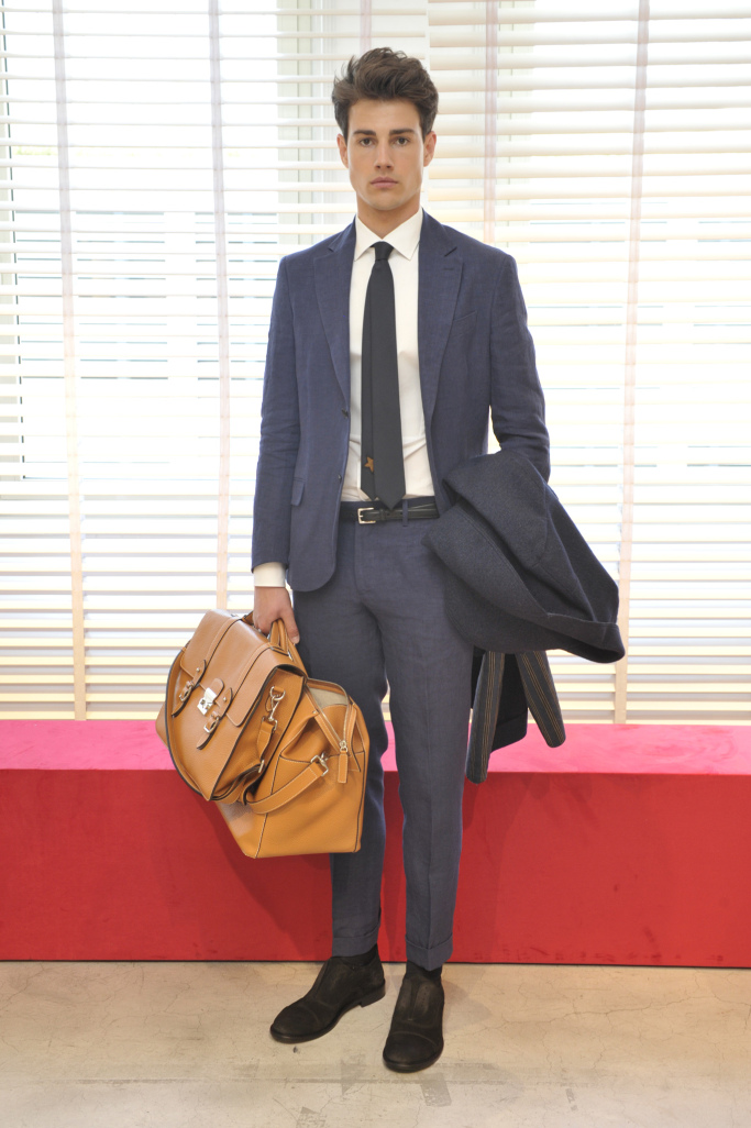 Another key element was the traditional Prince of Wales pattern revved up with strokes of colors. Caftan shirts with pop prints of stars or numbers were casually thrown over jogging pants and sneakers with a used effect. “Today I Love You” and “Just for Today” written over the sneakers expressed the carefree mood of the lineup. Scervino did not forget about his more formal customers, presenting sleek suits and briefcases and totes that any globetrotting executive would be happy to carry on his business trips. “Harmony is what is important,” summed up the designer. Spot on, as the collection had an ease and cohesion that matched his words.