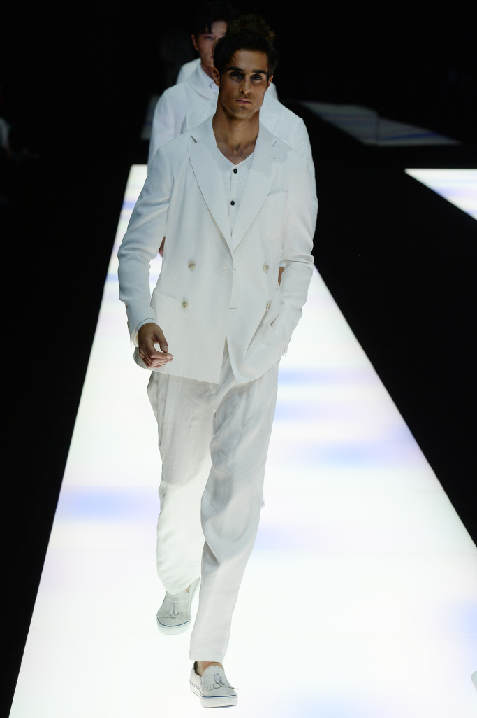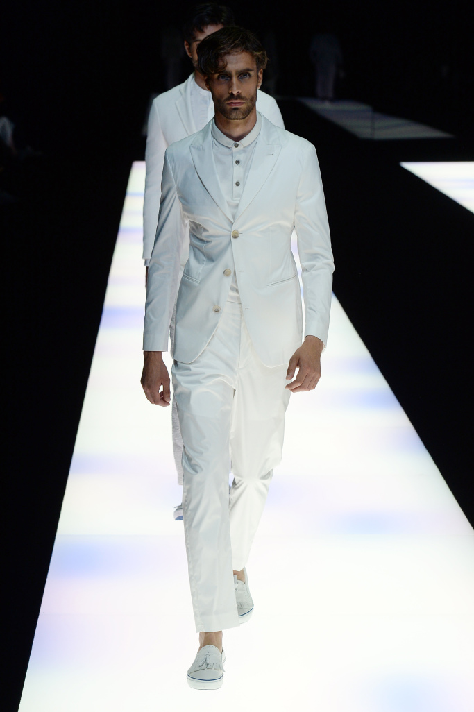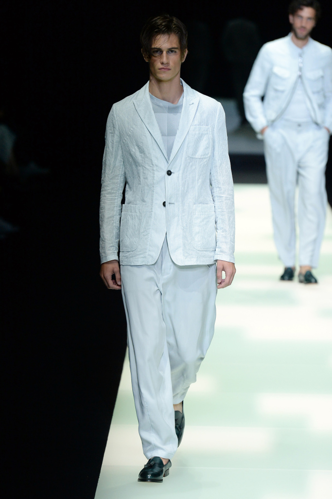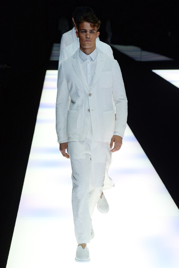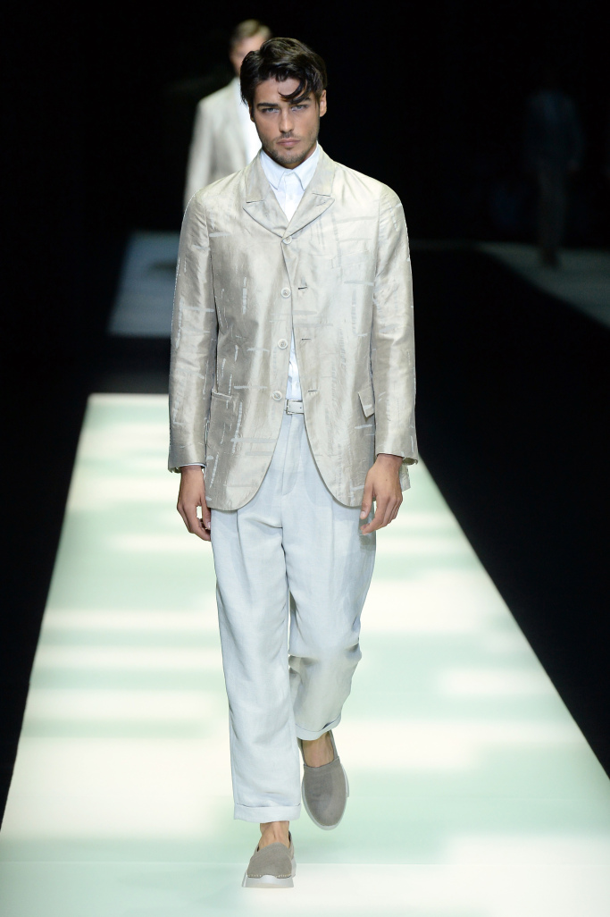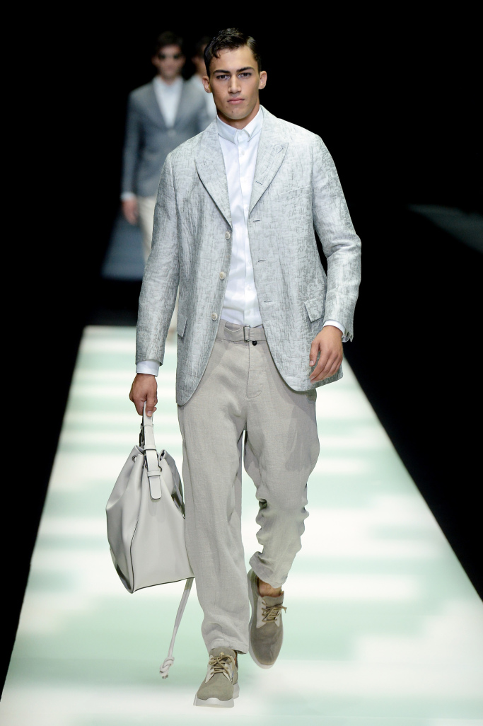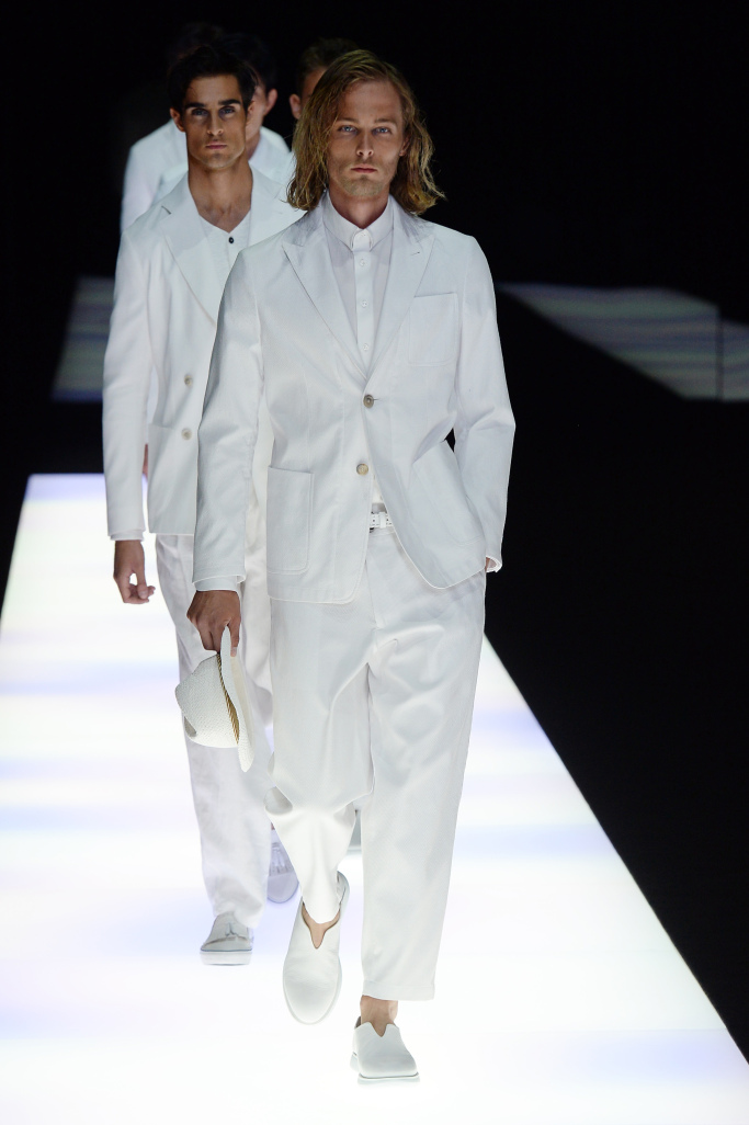 In a season when some of Milan’s biggest names in men’s wear either didn’t take part to opt for coed shows in September, or lost their rhythm and wobbled, Armani stuck to what he knows best — and sent it down the runway over and over again. The show opened with a long and elegant feather light coat in watery gray, and ended with a chic lineup of all-white suits, some of them in seersucker, others with two buttons or three buttons, shawl collars or narrow peaked lapels.
