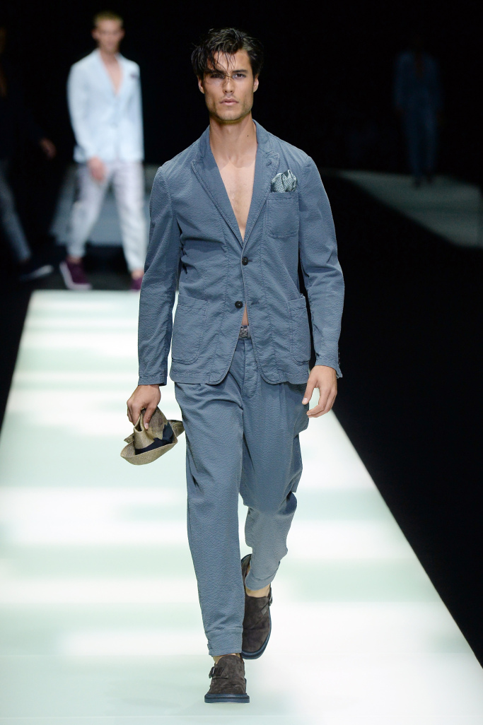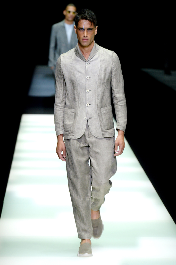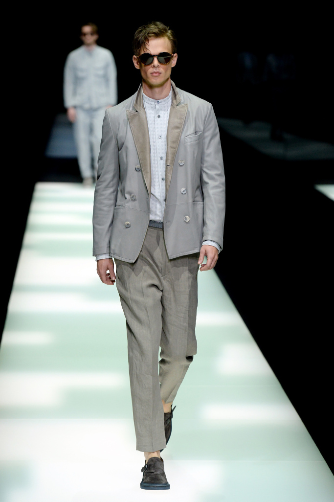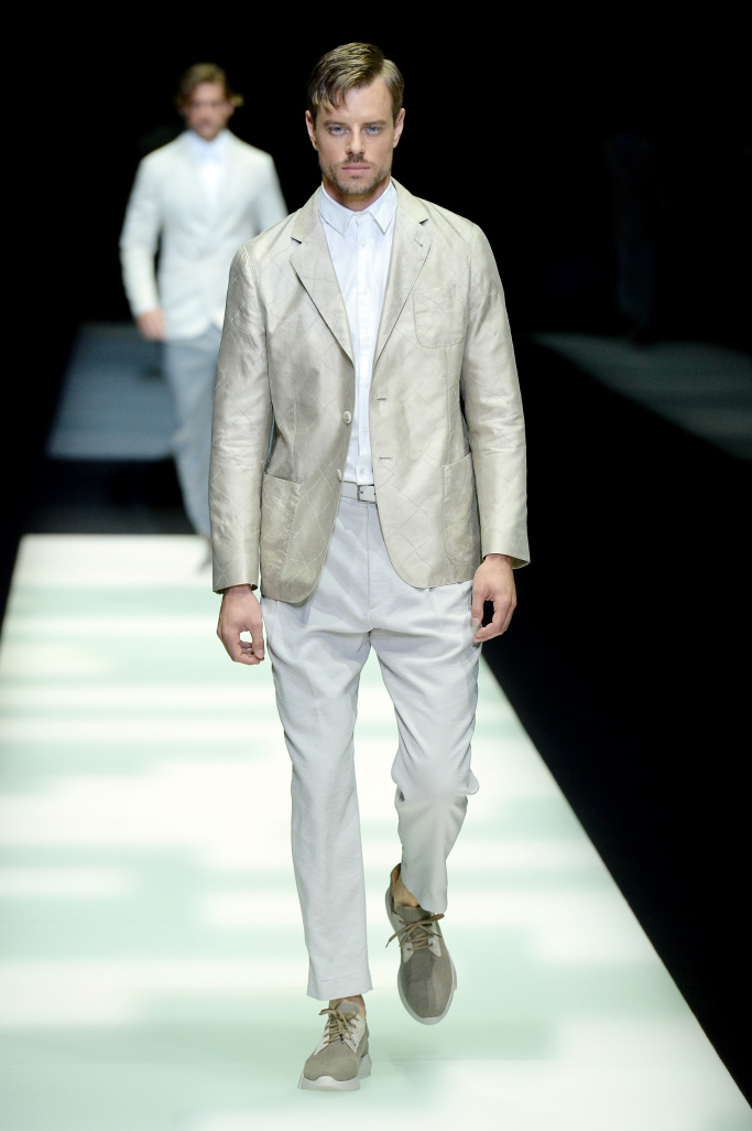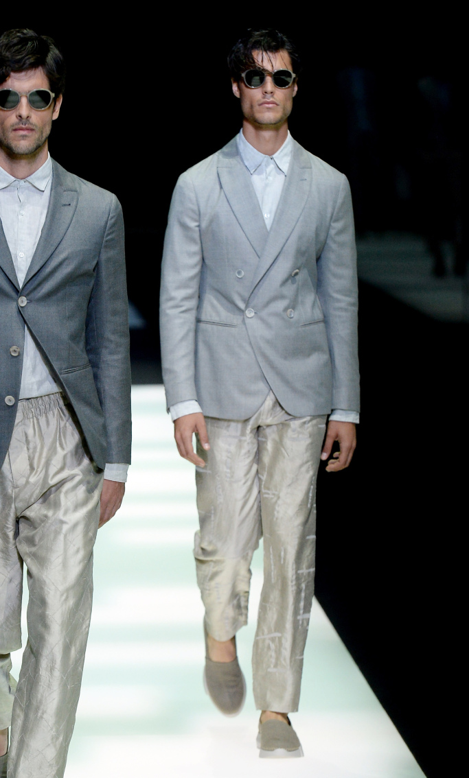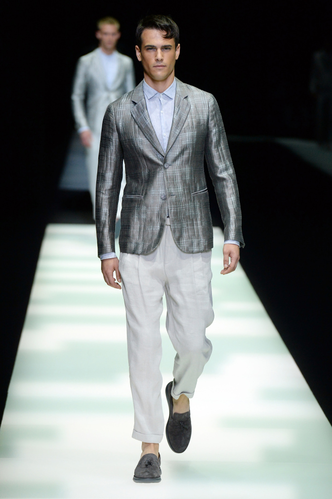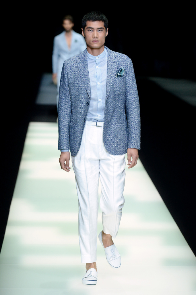 In a season when some of Milan’s biggest names in men’s wear either didn’t take part to opt for coed shows in September, or lost their rhythm and wobbled, Armani stuck to what he knows best — and sent it down the runway over and over again. The show opened with a long and elegant feather light coat in watery gray, and ended with a chic lineup of all-white suits, some of them in seersucker, others with two buttons or three buttons, shawl collars or narrow peaked lapels.