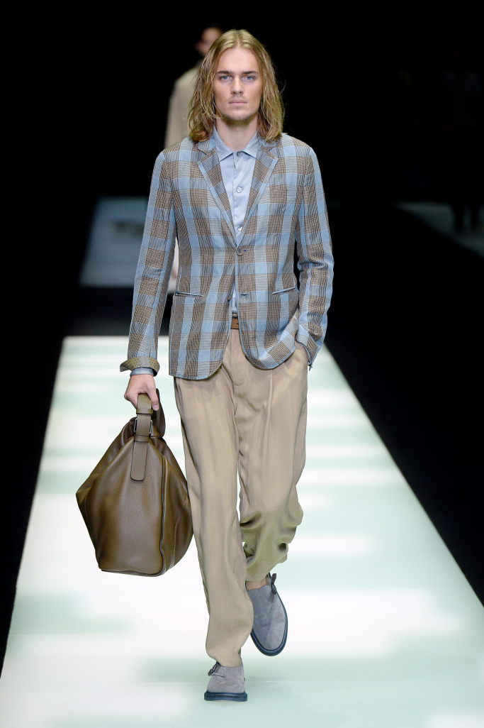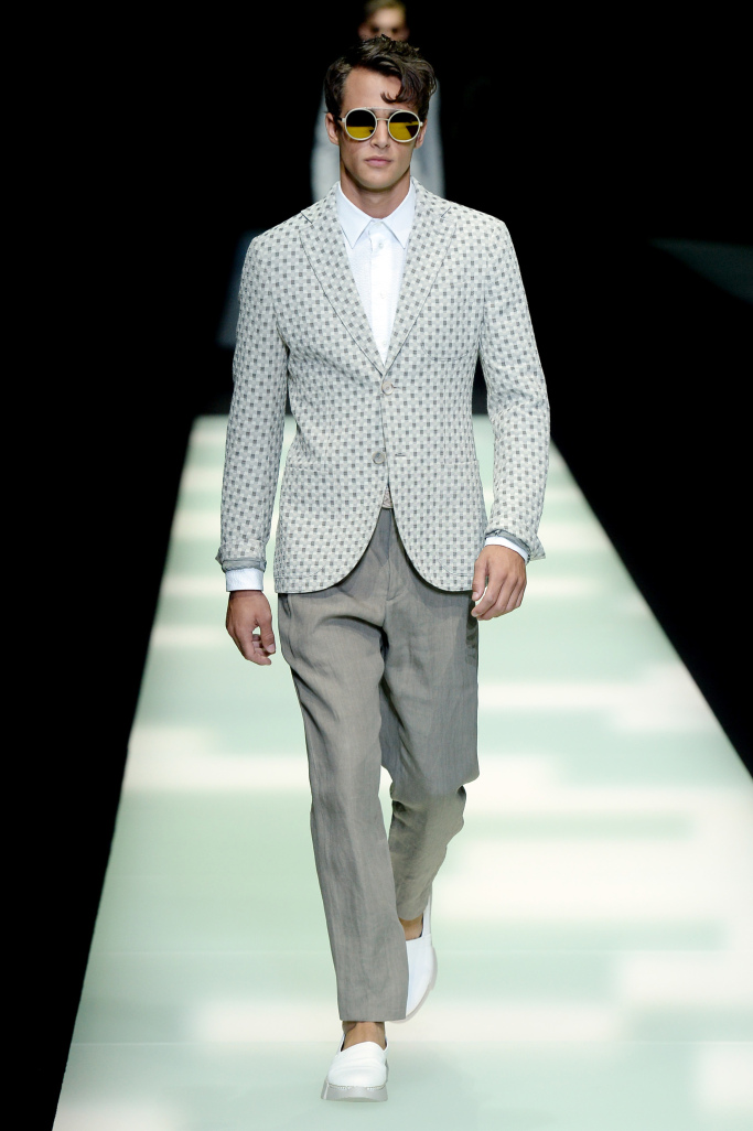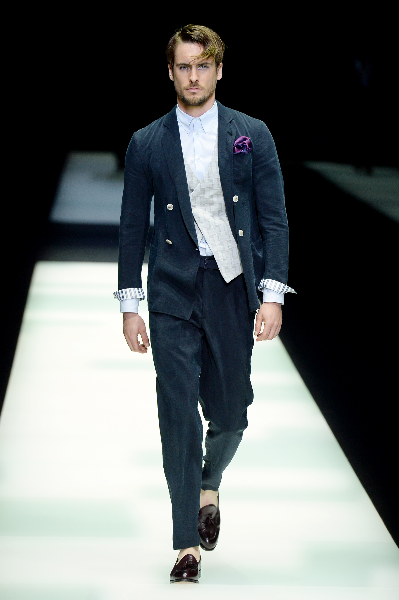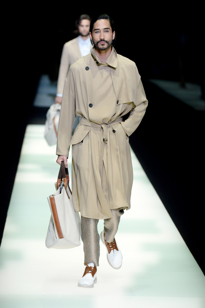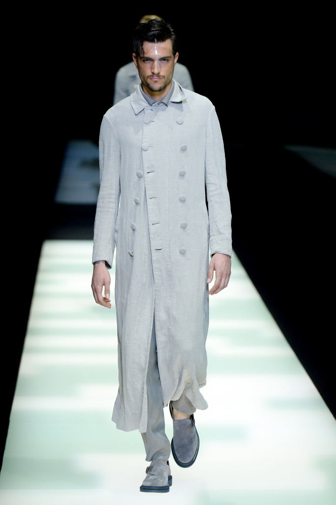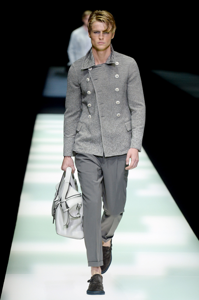 In a season when some of Milan’s biggest names in men’s wear either didn’t take part to opt for coed shows in September, or lost their rhythm and wobbled, Armani stuck to what he knows best — and sent it down the runway over and over again. The show opened with a long and elegant feather light coat in watery gray, and ended with a chic lineup of all-white suits, some of them in seersucker, others with two buttons or three buttons, shawl collars or narrow peaked lapels.