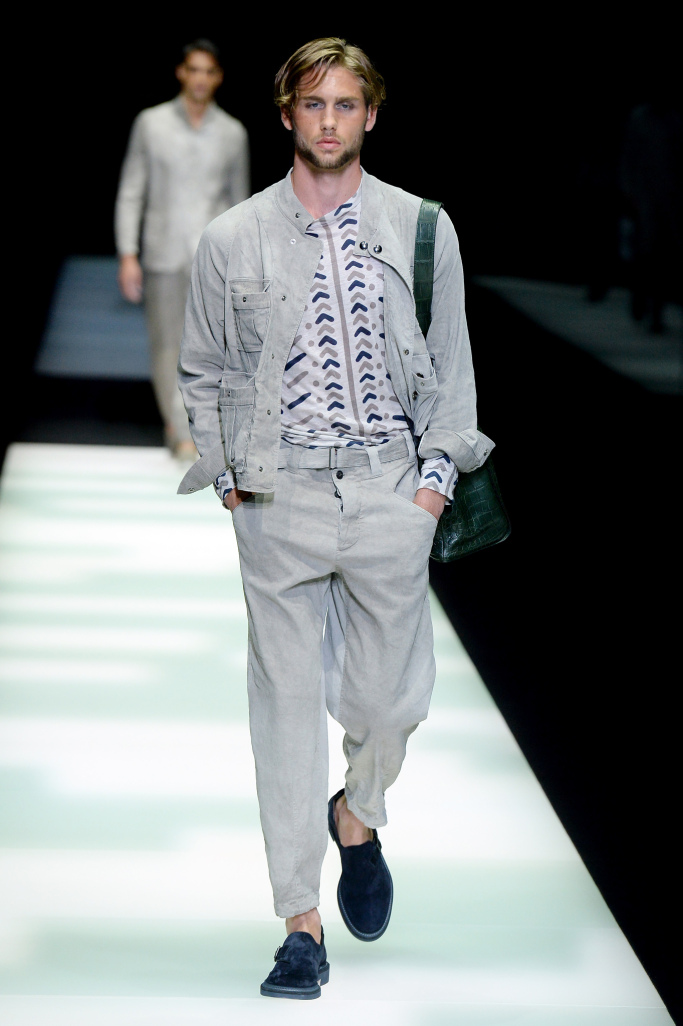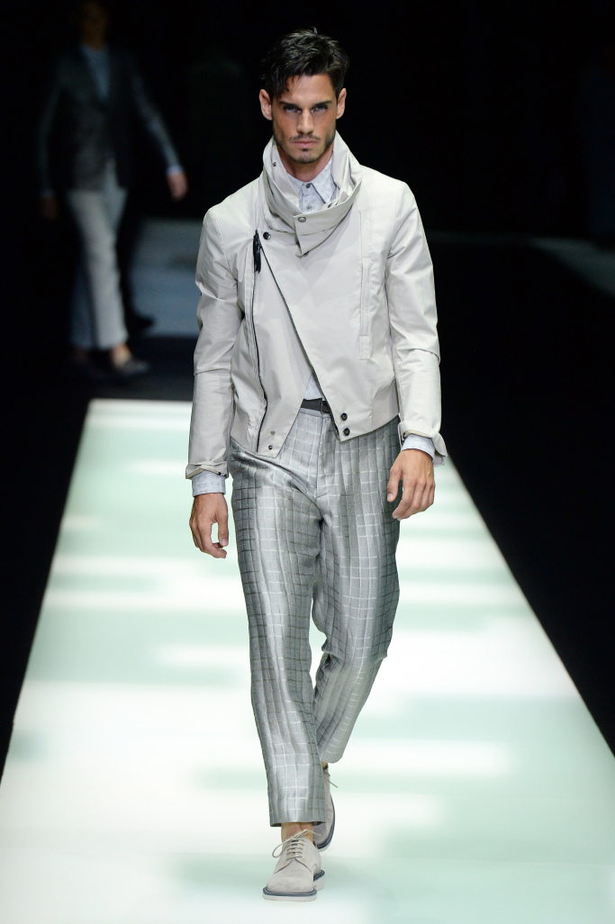 The phrase captured the spirit of the collection, which was signature Giorgio, with a subdued color palette — 50 shades of light gray — and many of the designer’s greatest hits. Carrot trousers, curve-hugging tailored jackets, languid workwear styles, and Far Eastern-inspired silhouettes all took a turn on the runway.