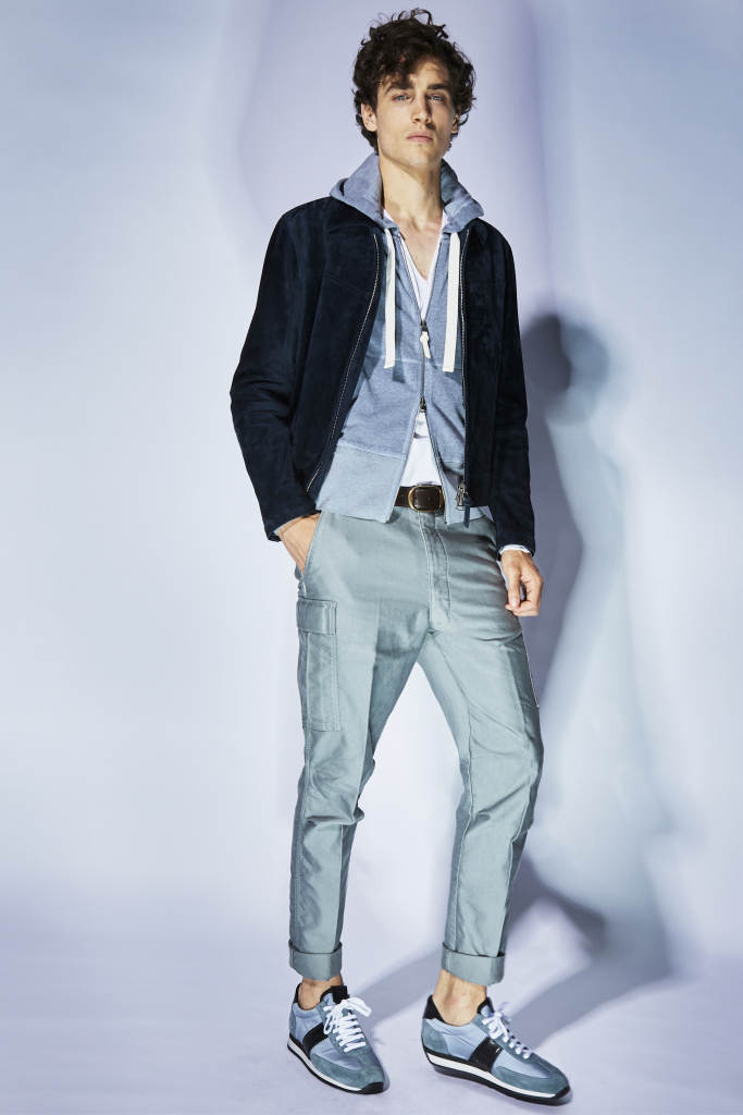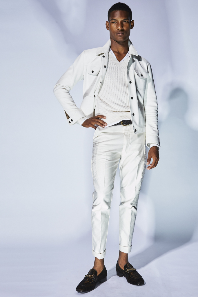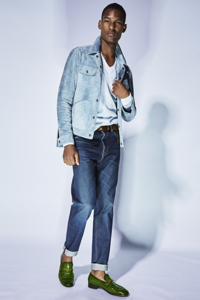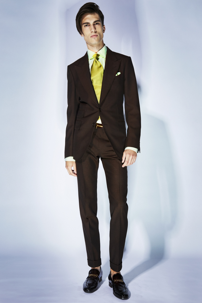 What’s a Tom Ford collection without a wild animal or two prowling around? There were pops of pony skin leopard and zebra for a bomber jacket and a pair of loafers with a chain at the front. The slip-on shoes also came in a bright leaf green, cornflower blue and in rich reptilian textures.