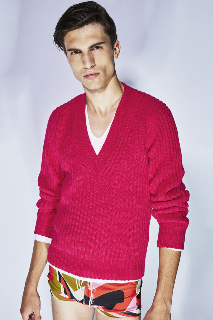 It’s a bright, bright sunshiny spring for Tom Ford, whose collection was filled with hot Mediterranean tones — bougainvillea pink, blue grotto blues, coral pink and a rich red the color of a Campari Orange cocktail.