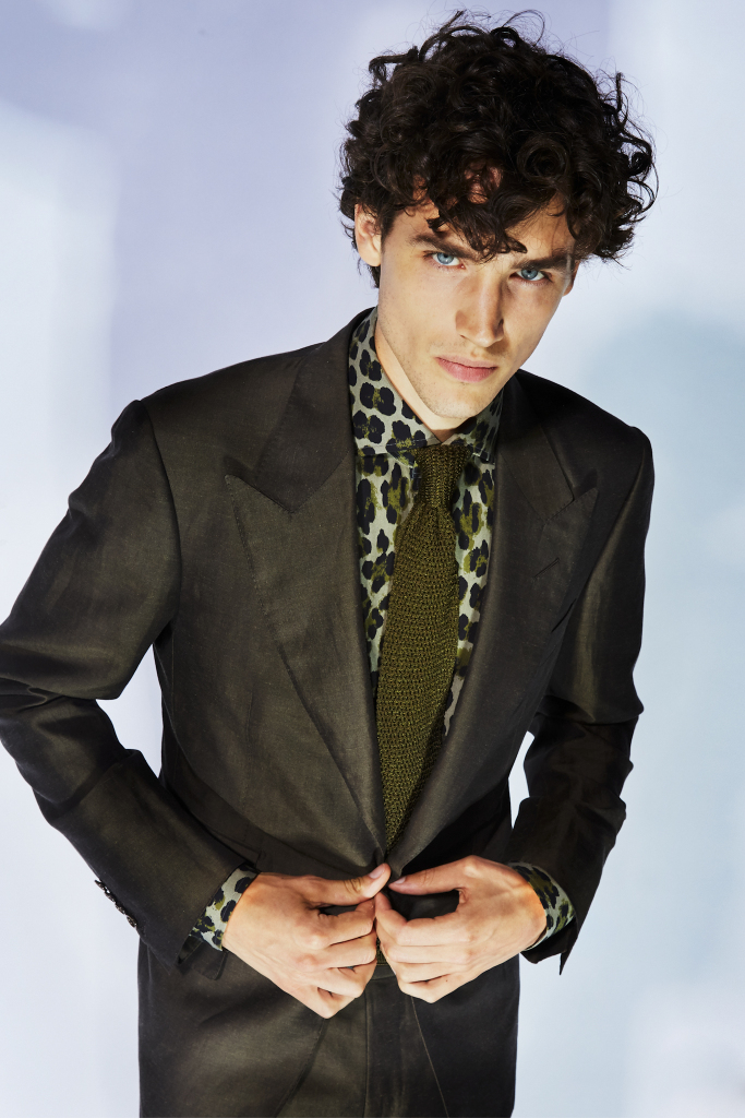 Linen suits with their wide peaked lapels were layered with tone-on-tone shirts and ties, in colors such as sage or bottle green. During a walk-through Ford recalled how, in Seventies department stores, tonal shirts and ties were often sold together in transparent plastic boxes. “It’s just like that — but with no plastic box,” the designer said.