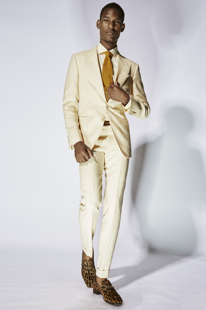 Ford is always looking to put a new twist on classic shapes, and that’s just what he did for this collection that was filled with skinny linen suits, suede jackets, denim and a lush lineup of zesty dinner jackets with shawl collars.