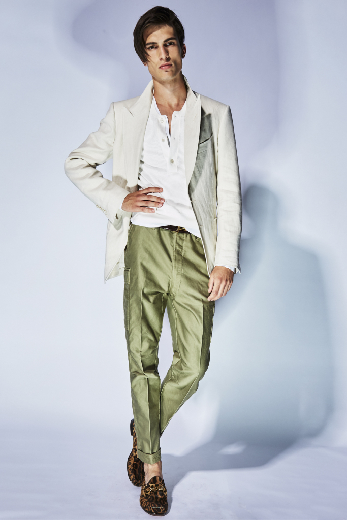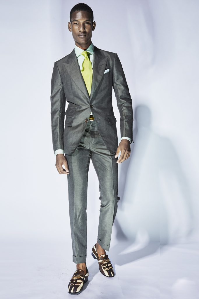 What’s a Tom Ford collection without a wild animal or two prowling around? There were pops of pony skin leopard and zebra for a bomber jacket and a pair of loafers with a chain at the front. The slip-on shoes also came in a bright leaf green, cornflower blue and in rich reptilian textures.