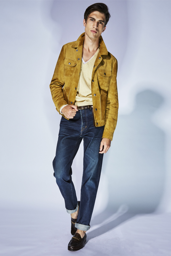 Ford is always looking to put a new twist on classic shapes, and that’s just what he did for this collection that was filled with skinny linen suits, suede jackets, denim and a lush lineup of zesty dinner jackets with shawl collars.