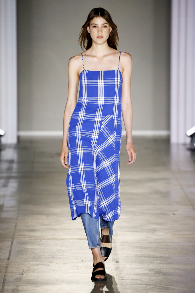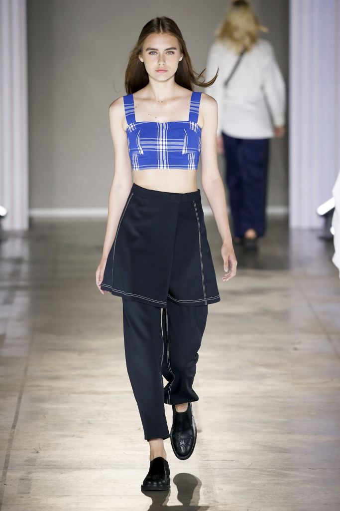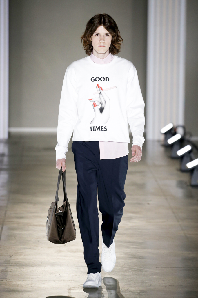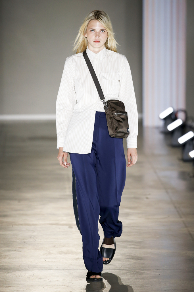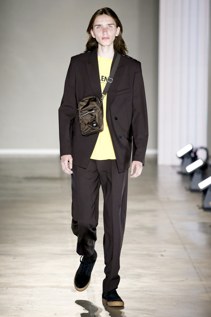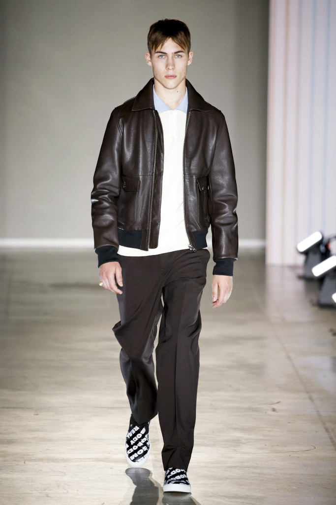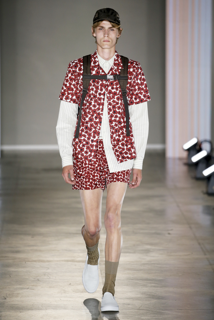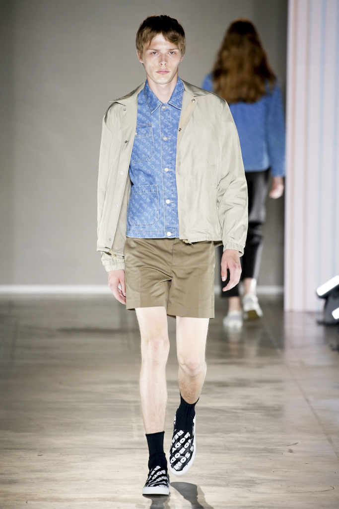 Karl-Oskar Olsen and Brian SS Jensen delivered a street-savvy show that was filled with wearable city staples. They included an orange anorak, a leather blouson, washed denim front-pocket jackets, and deconstructed tailored suits for a contemporary take on the classic business uniform. While the overall look was clean and simple, a touch of eccentricity came through via the bright child-like floral pattern of a short-sleeved shirt with coordinated pants.