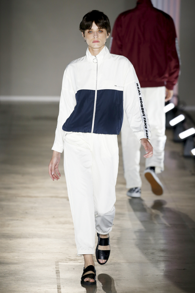The “Talented Mr. Ripley” quote “It’s better to be a fake somebody than a real nobody” inspired a pattern splashed on some of the pieces of Wood Wood’s urban collection. The graphic appeared on a Fifties-inspired boxy shirt, as well as on the side bands running down the legs of a color-blocked nylon tracksuit.