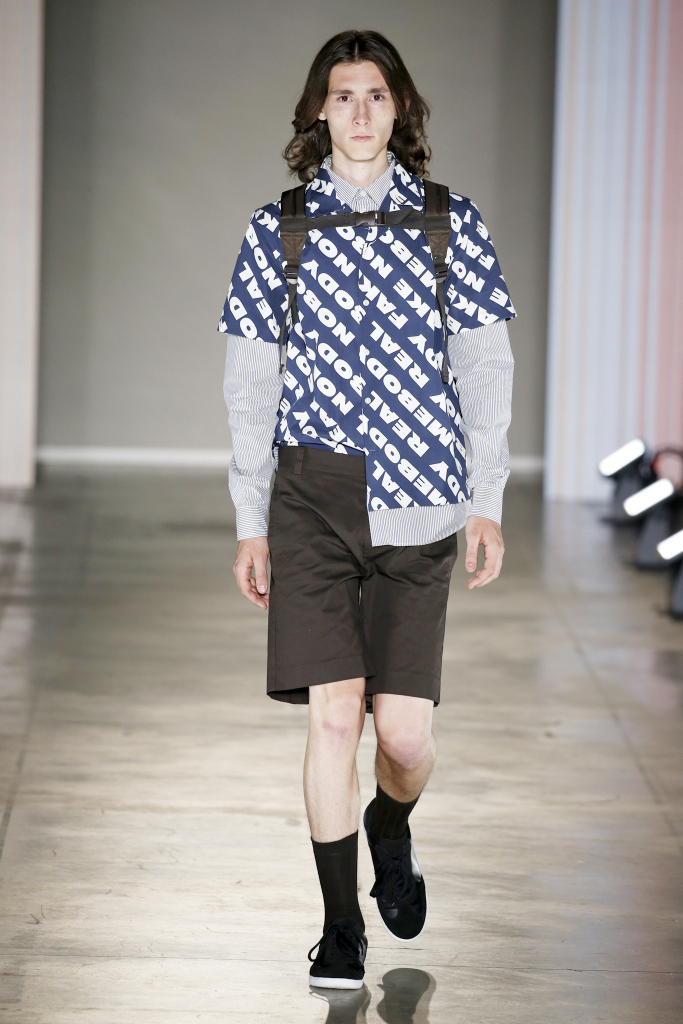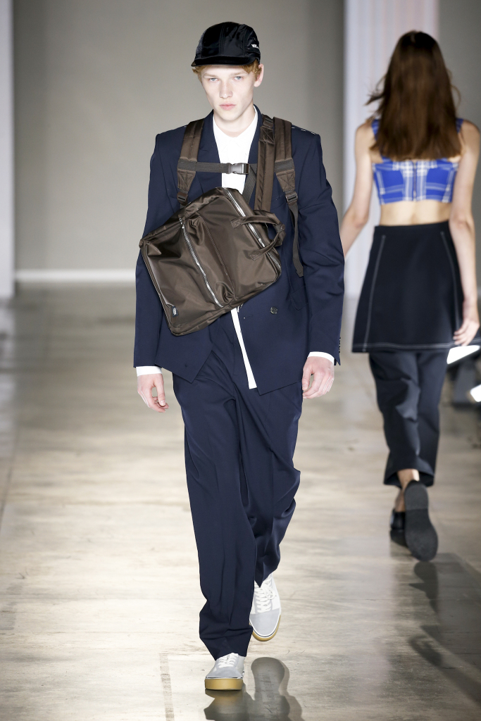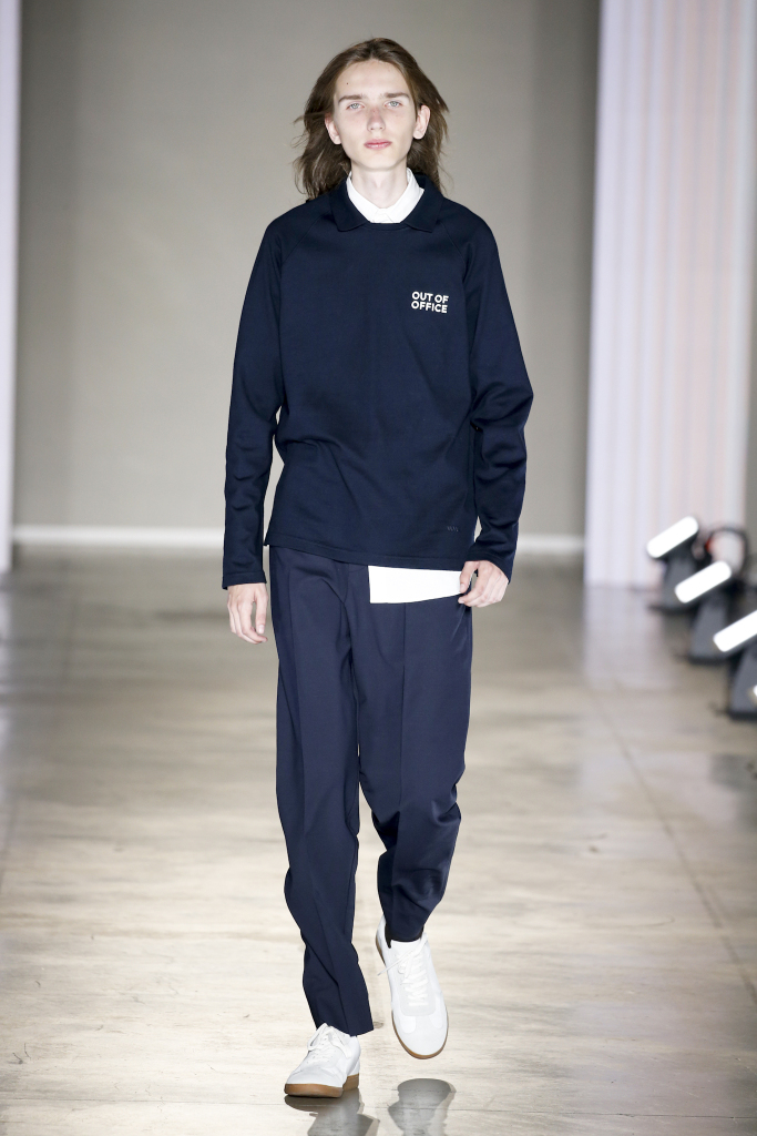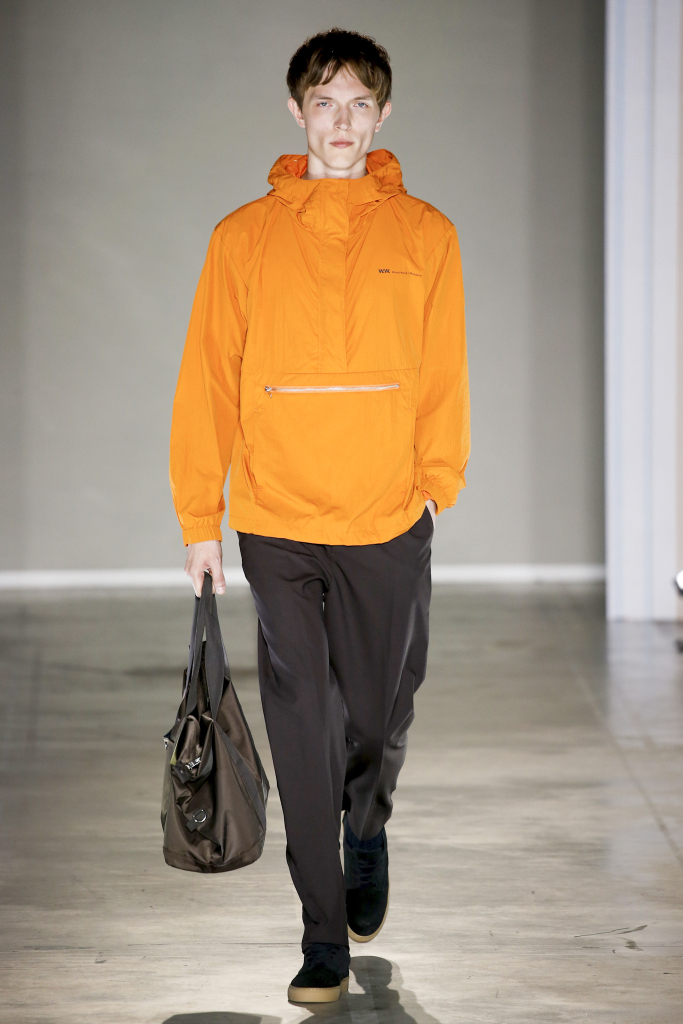 Karl-Oskar Olsen and Brian SS Jensen delivered a street-savvy show that was filled with wearable city staples. They included an orange anorak, a leather blouson, washed denim front-pocket jackets, and deconstructed tailored suits for a contemporary take on the classic business uniform. While the overall look was clean and simple, a touch of eccentricity came through via the bright child-like floral pattern of a short-sleeved shirt with coordinated pants.