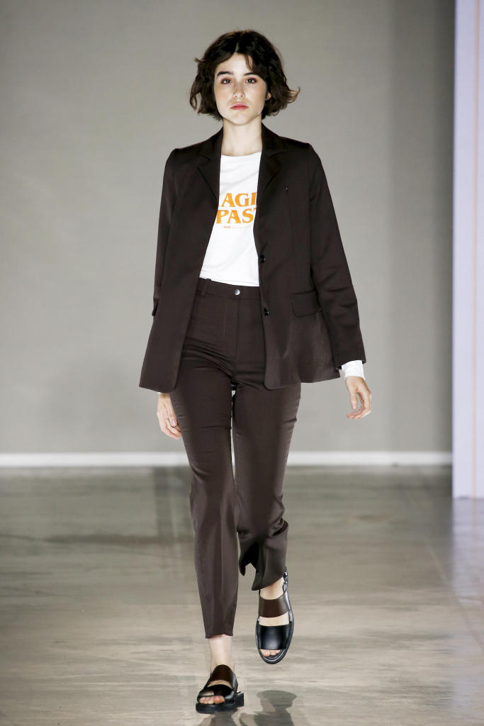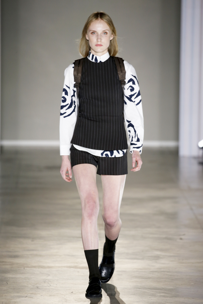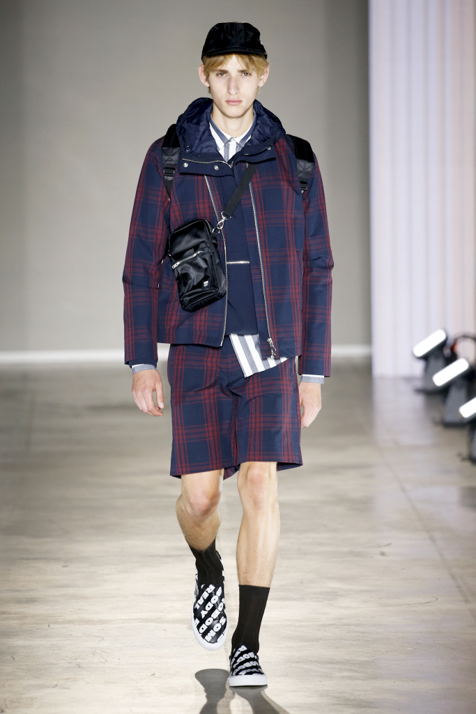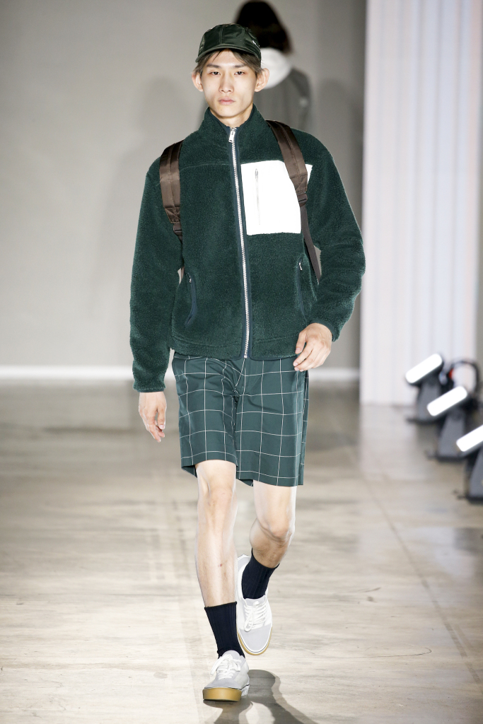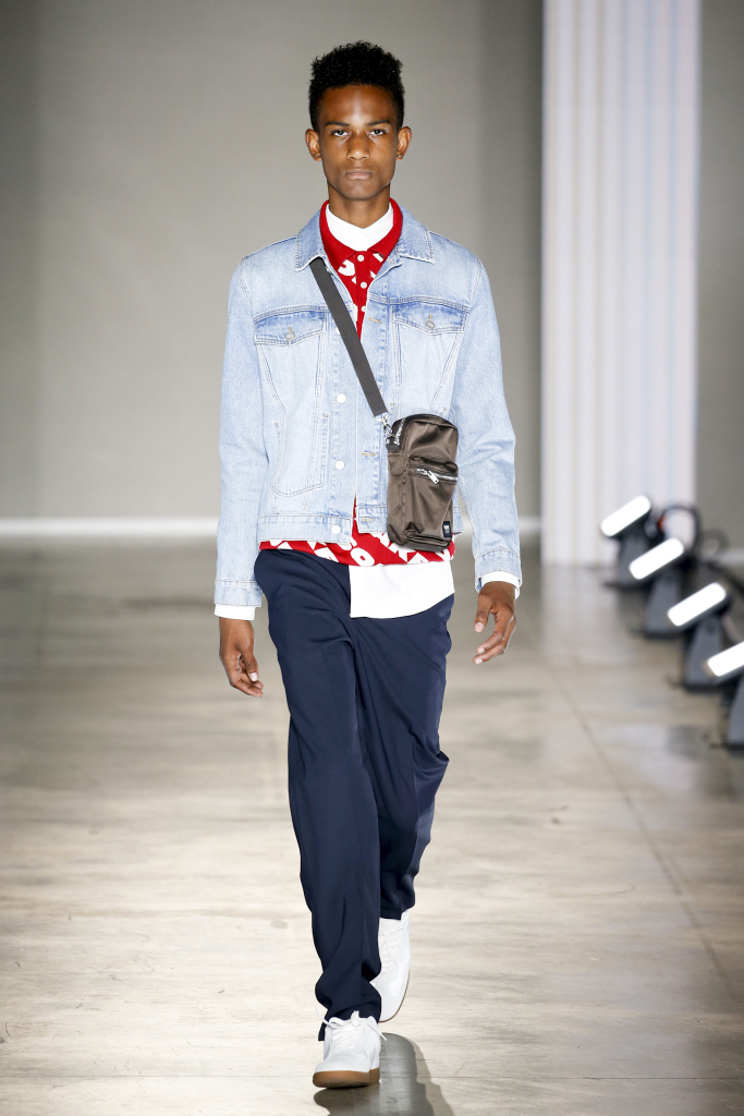 Karl-Oskar Olsen and Brian SS Jensen delivered a street-savvy show that was filled with wearable city staples. They included an orange anorak, a leather blouson, washed denim front-pocket jackets, and deconstructed tailored suits for a contemporary take on the classic business uniform. While the overall look was clean and simple, a touch of eccentricity came through via the bright child-like floral pattern of a short-sleeved shirt with coordinated pants.