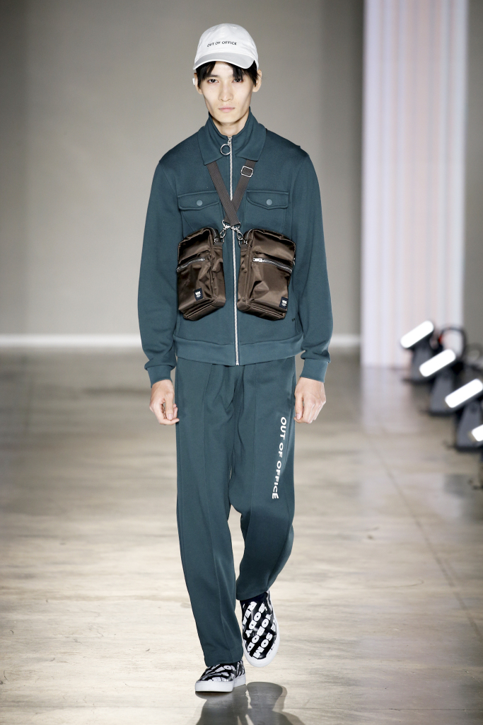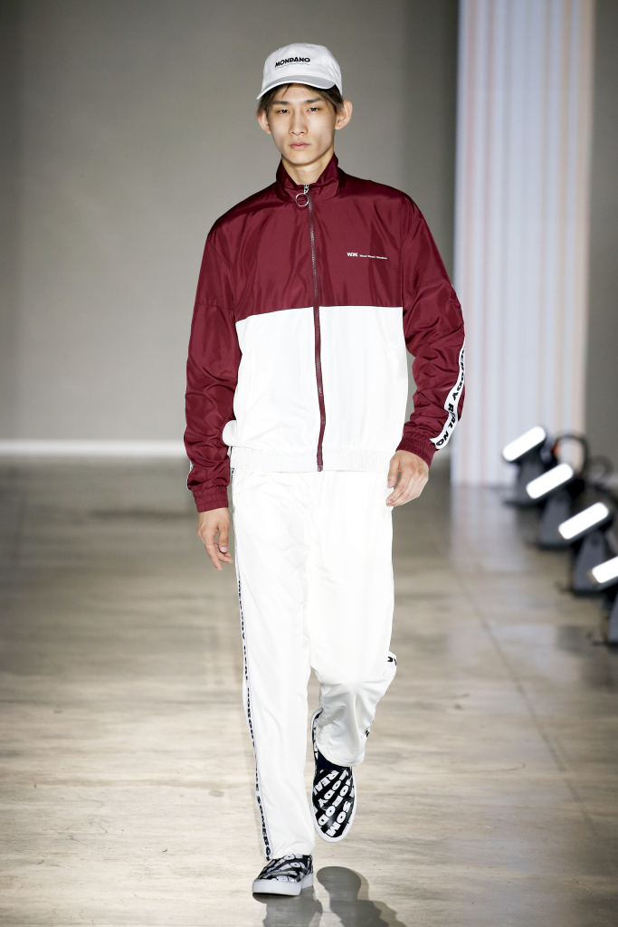 The “Talented Mr. Ripley” quote “It’s better to be a fake somebody than a real nobody” inspired a pattern splashed on some of the pieces of Wood Wood’s urban collection. The graphic appeared on a Fifties-inspired boxy shirt, as well as on the side bands running down the legs of a color-blocked nylon tracksuit.