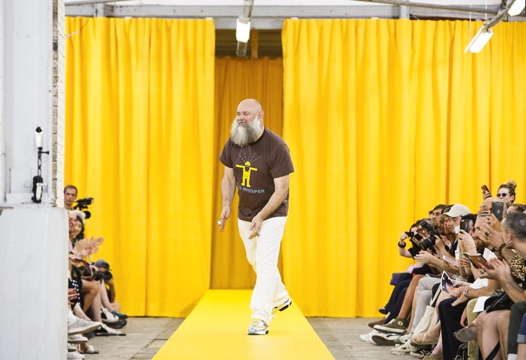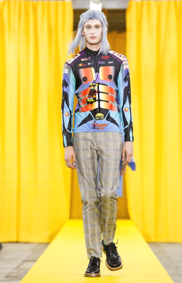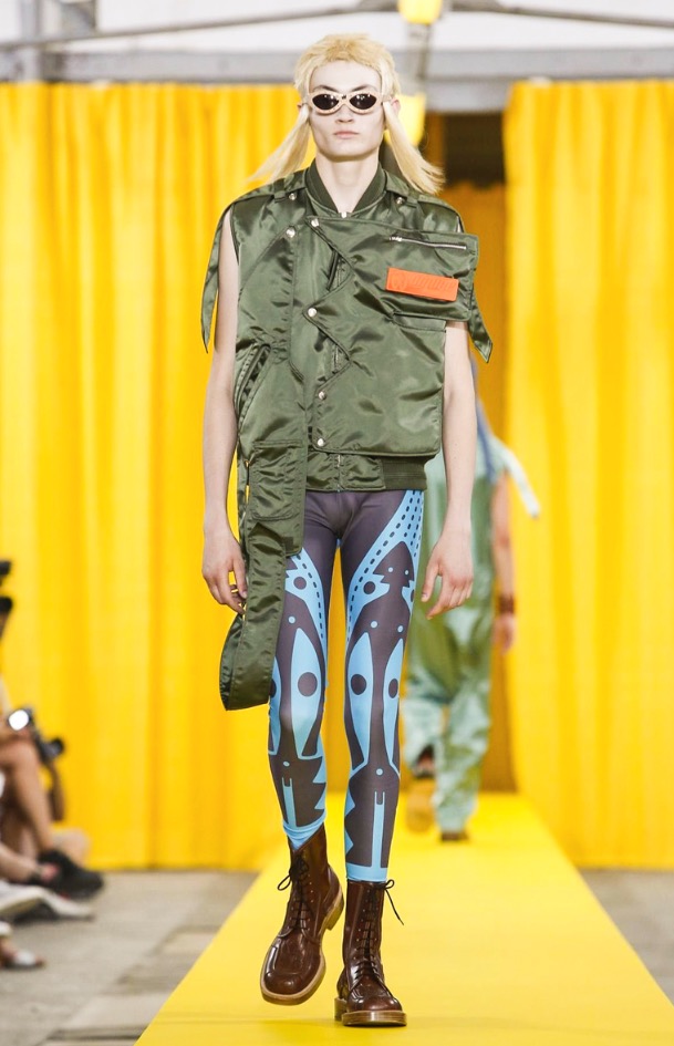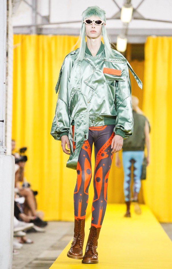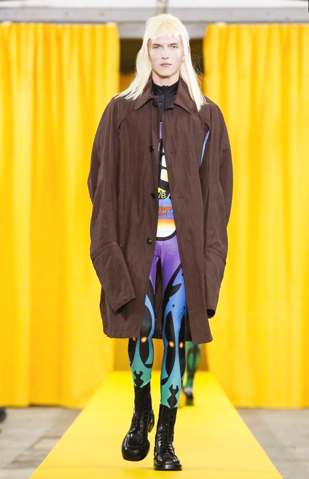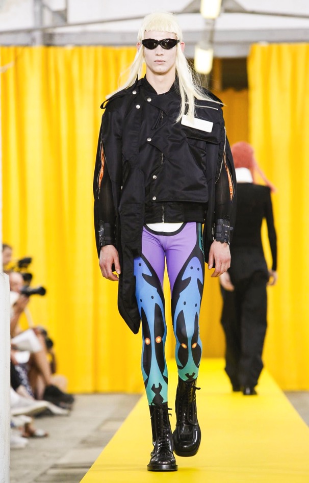That seemed prevalent also in his collection’s silhouettes, which overall were simpler and more streamlined than in recent seasons. That’s not to say they were devoid of Van Beirendonck’s signature twists, like sports leggings in a riot of patterns popping out from under tailored shorts and a mélange of unexpected fabrics or deconstructed pieces, but even these had fewer dangling bits wafting off.