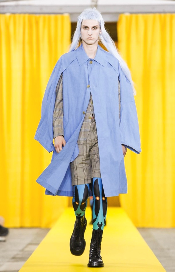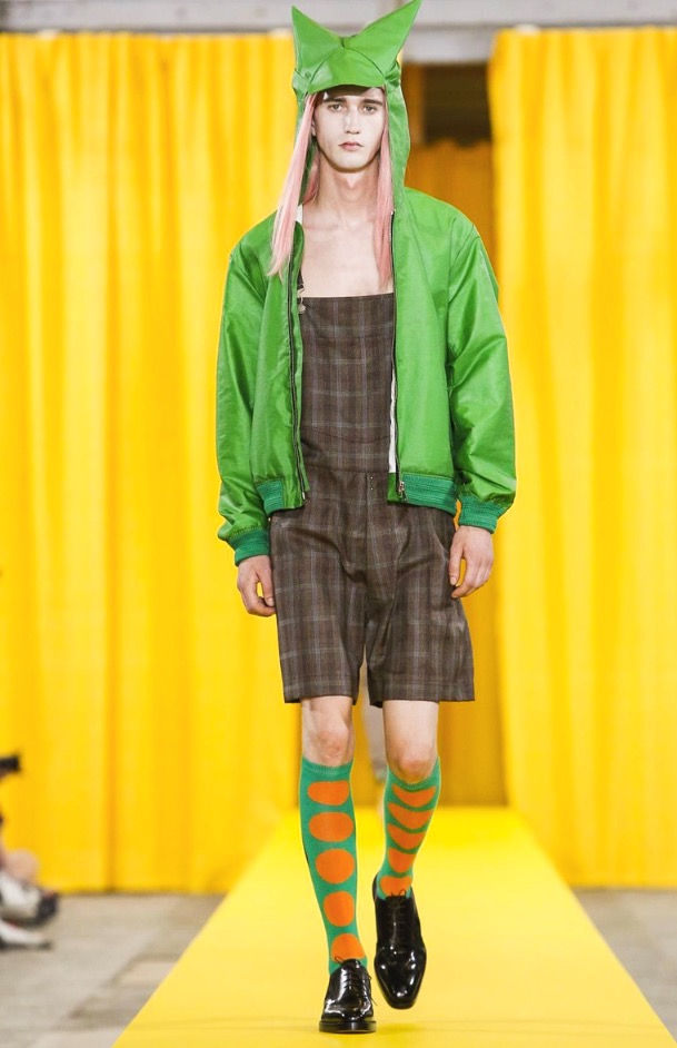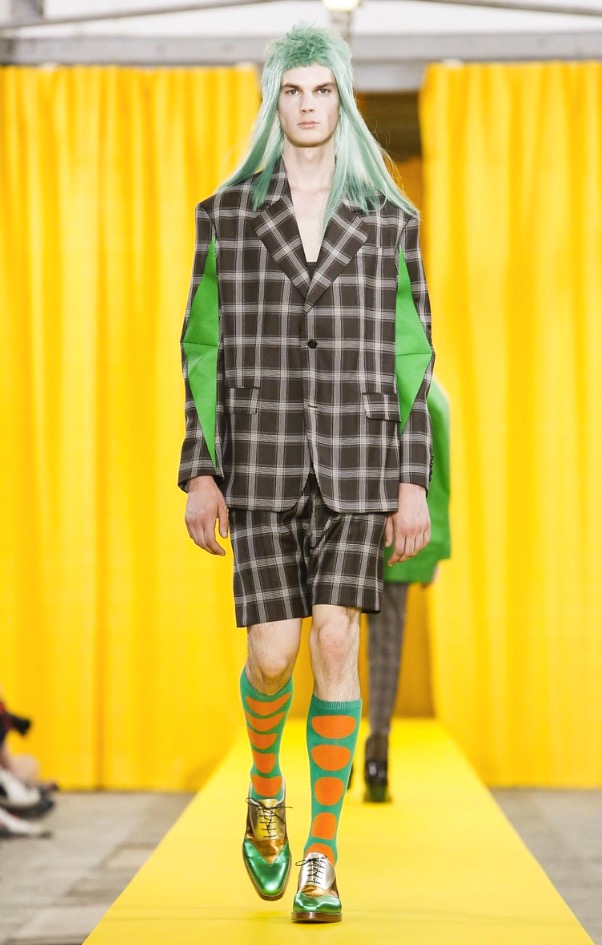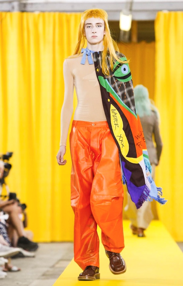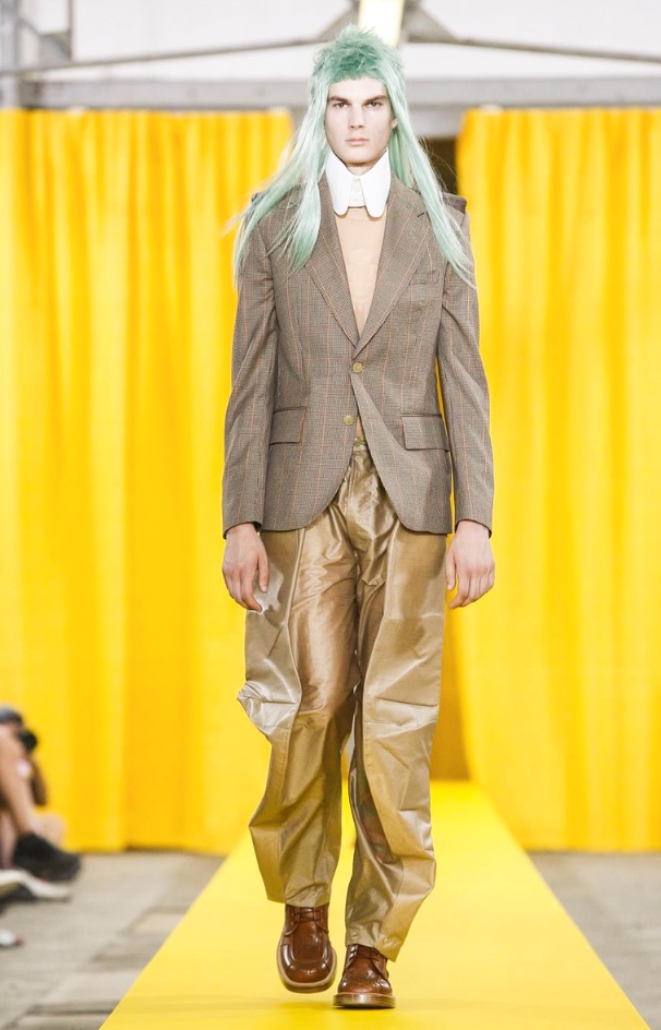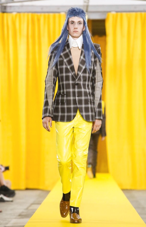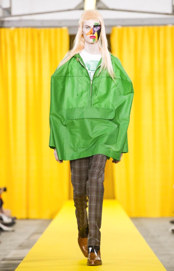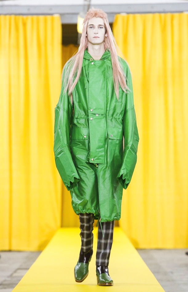 The designer’s deft sartorial hand was apparent throughout the collection, from the well-crafted, cartoony raincoats in green or orange with oversized sleeves and slouchy metallic pants to the assortment of more tailored pieces, such as checkered trousers and blazers.