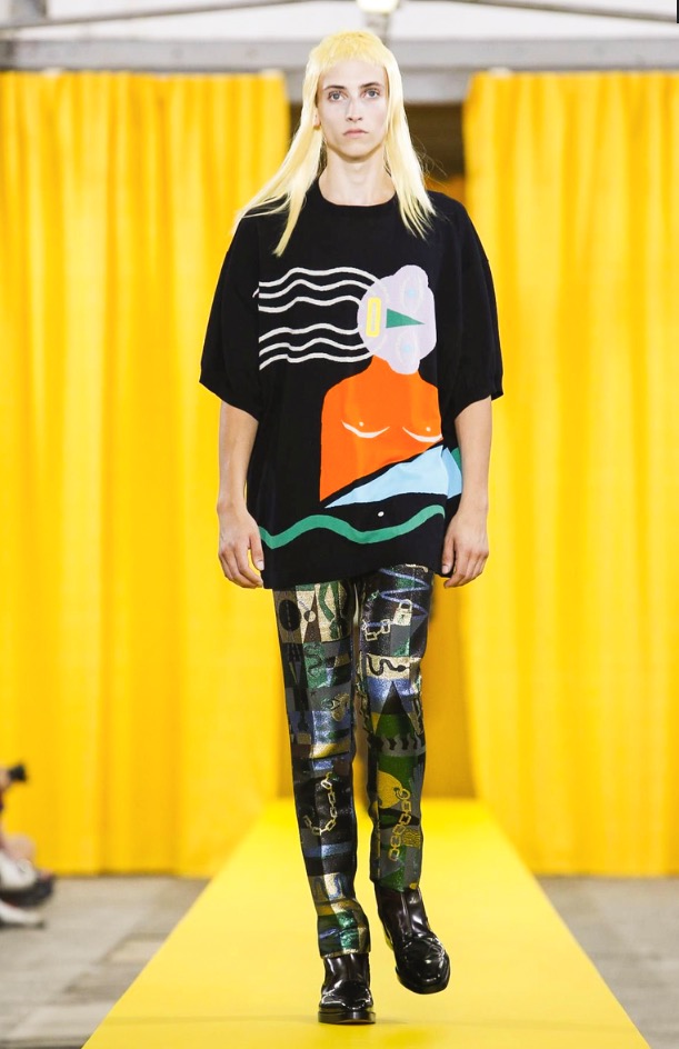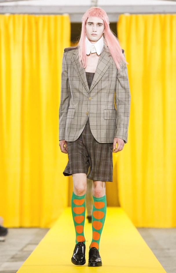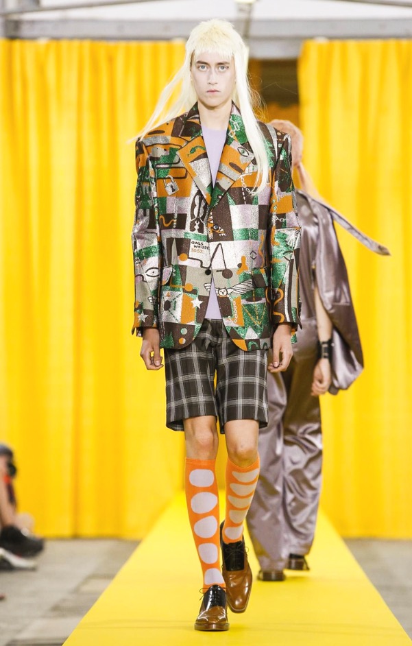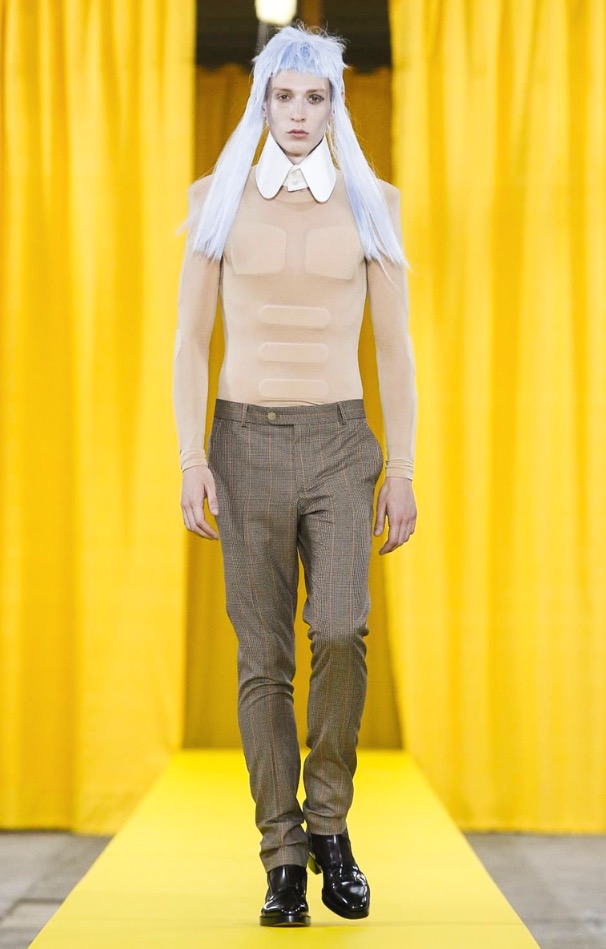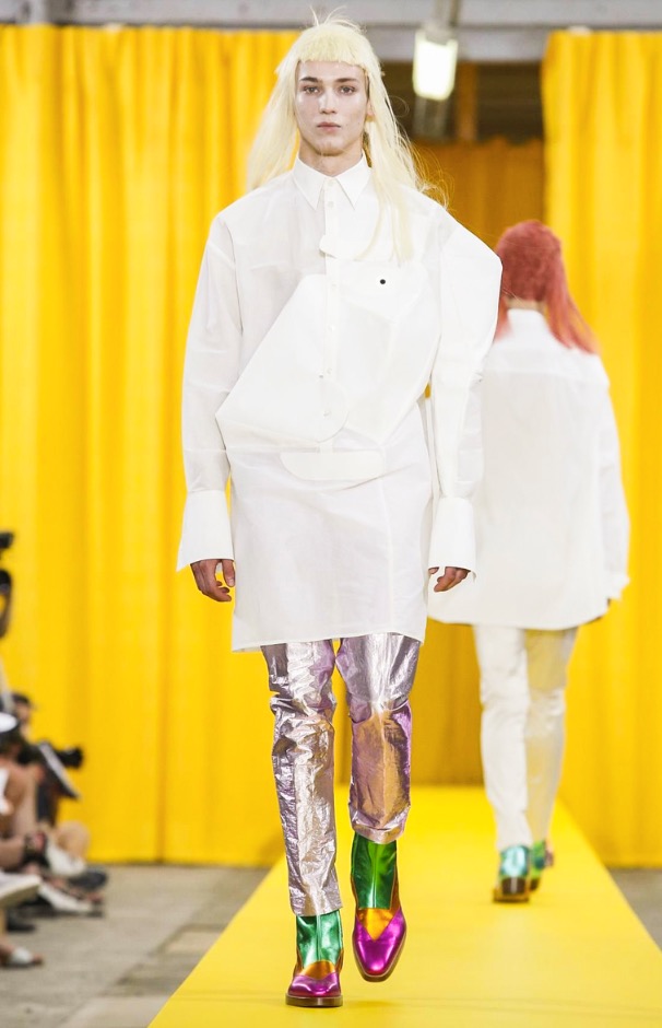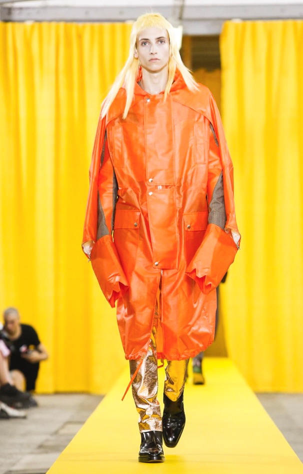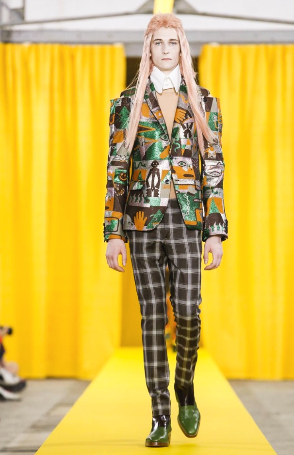 The designer’s deft sartorial hand was apparent throughout the collection, from the well-crafted, cartoony raincoats in green or orange with oversized sleeves and slouchy metallic pants to the assortment of more tailored pieces, such as checkered trousers and blazers.