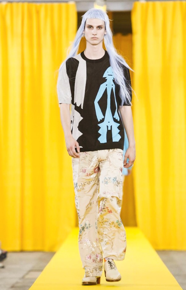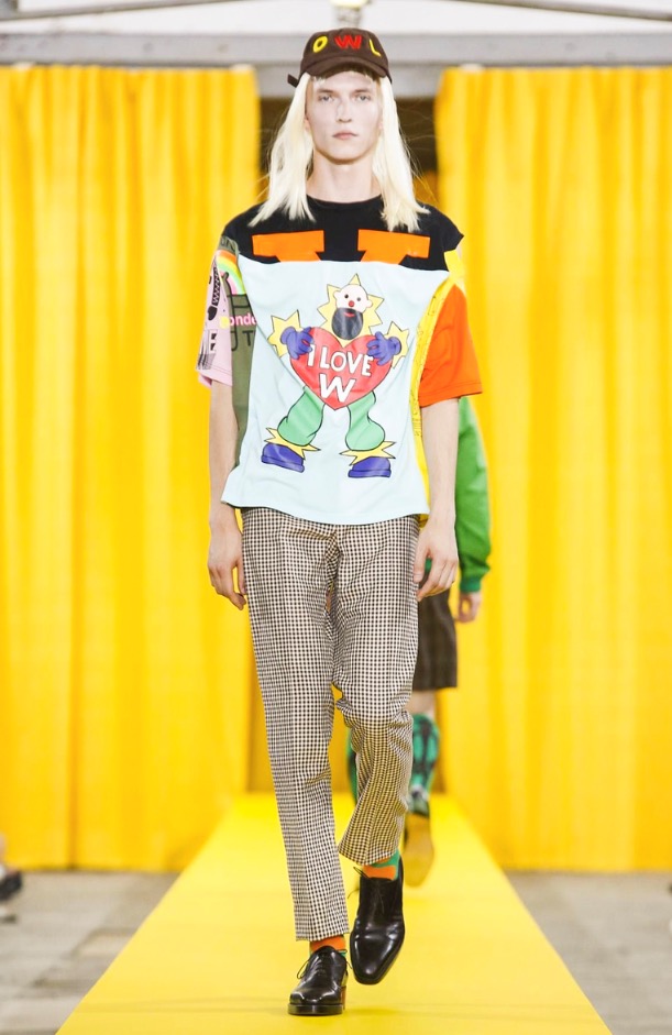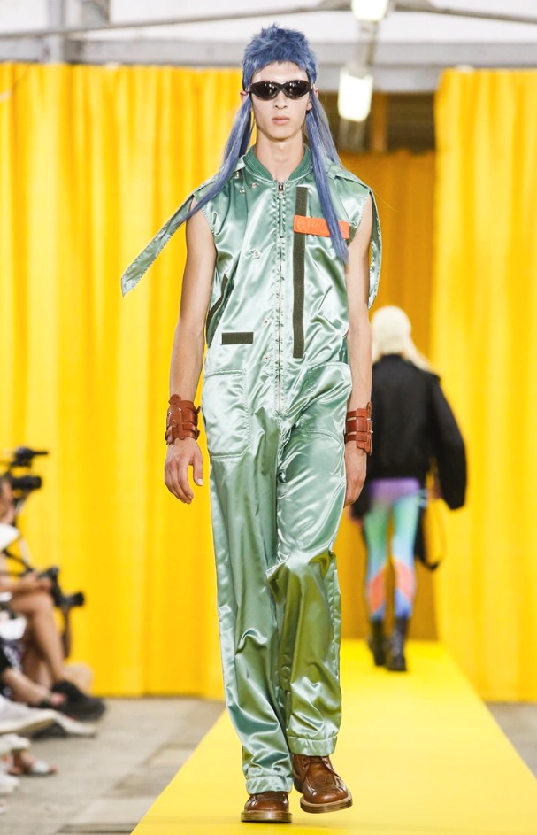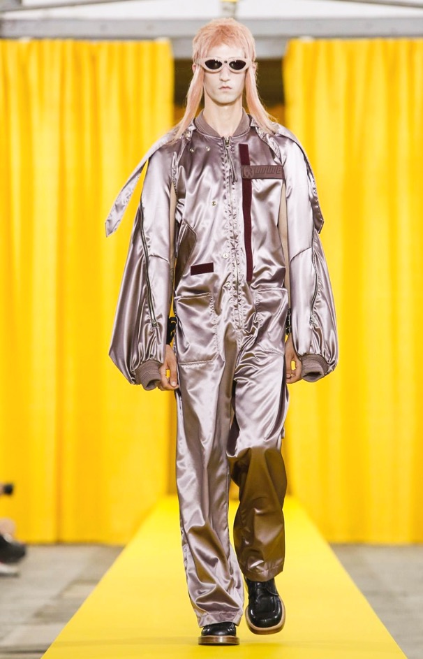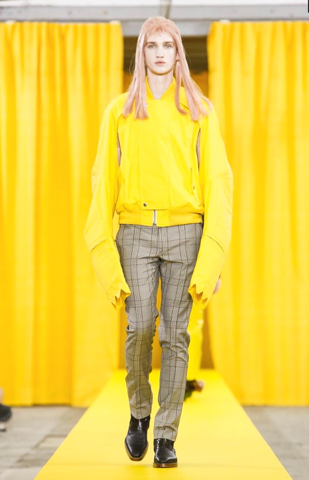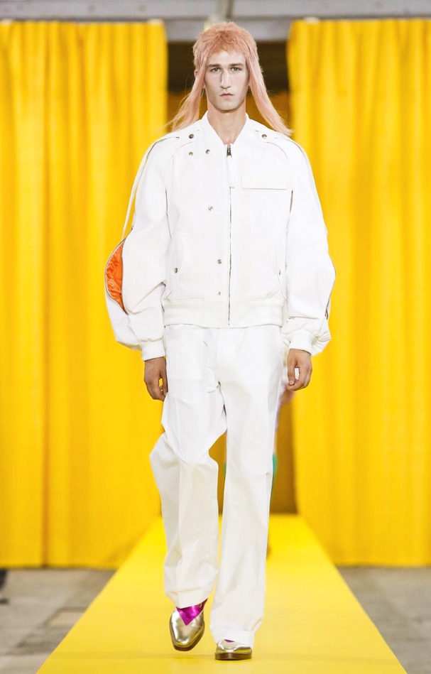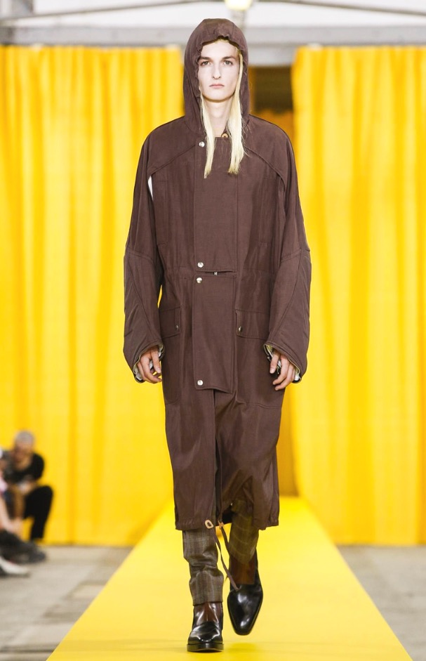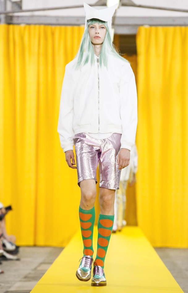 The designer’s deft sartorial hand was apparent throughout the collection, from the well-crafted, cartoony raincoats in green or orange with oversized sleeves and slouchy metallic pants to the assortment of more tailored pieces, such as checkered trousers and blazers.