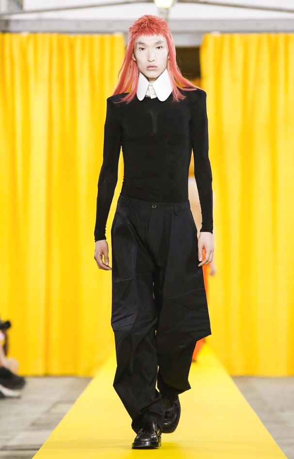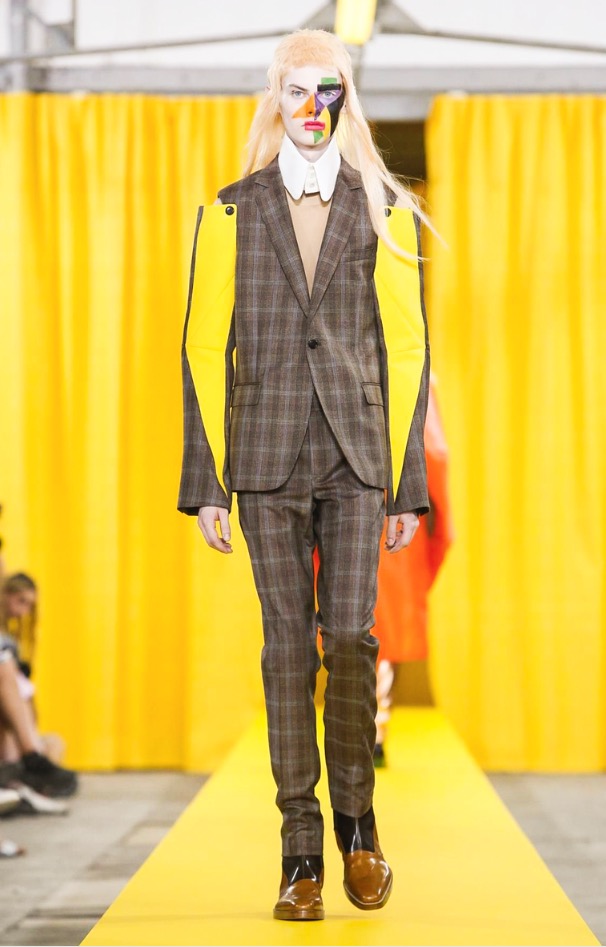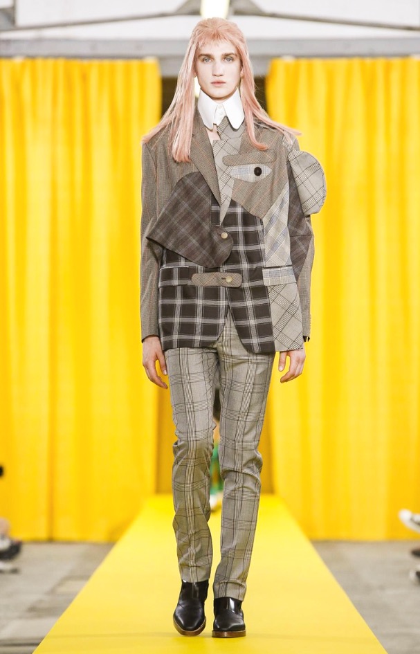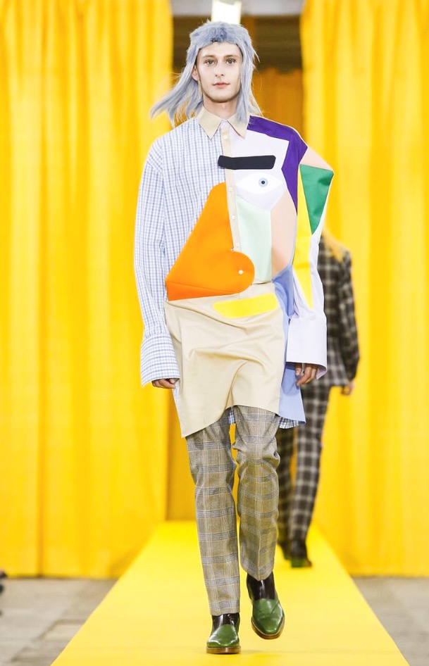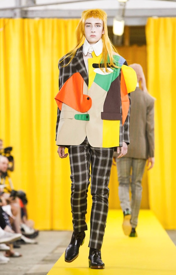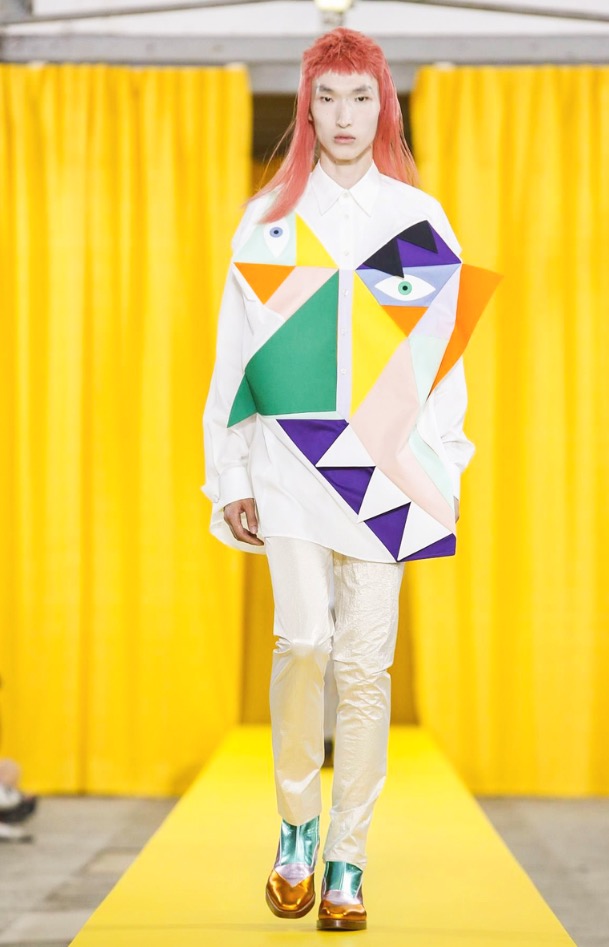 Among the most eye-catching looks was the quirky series of jackets and shirts fronted with a patchwork of fabrics creating asymmetric, geometric faces. What did they express — anger? Pensiveness? That was open to interpretation, just like the collection’s overriding theme.