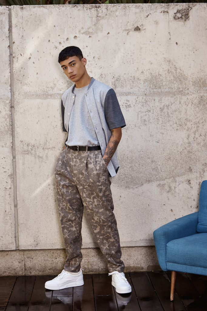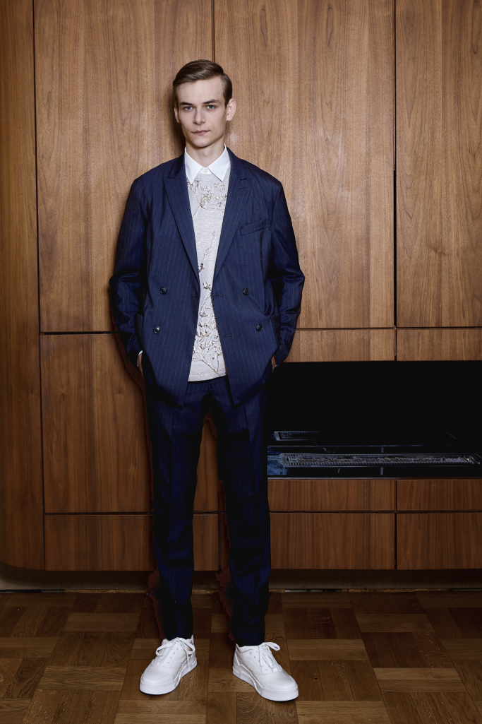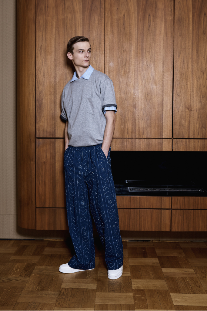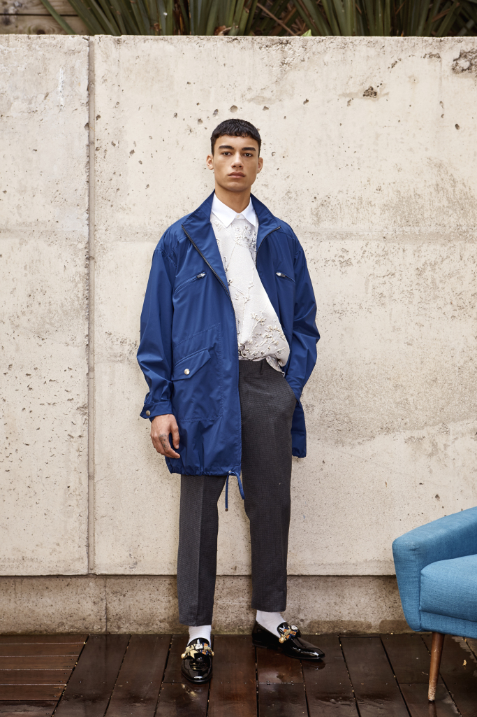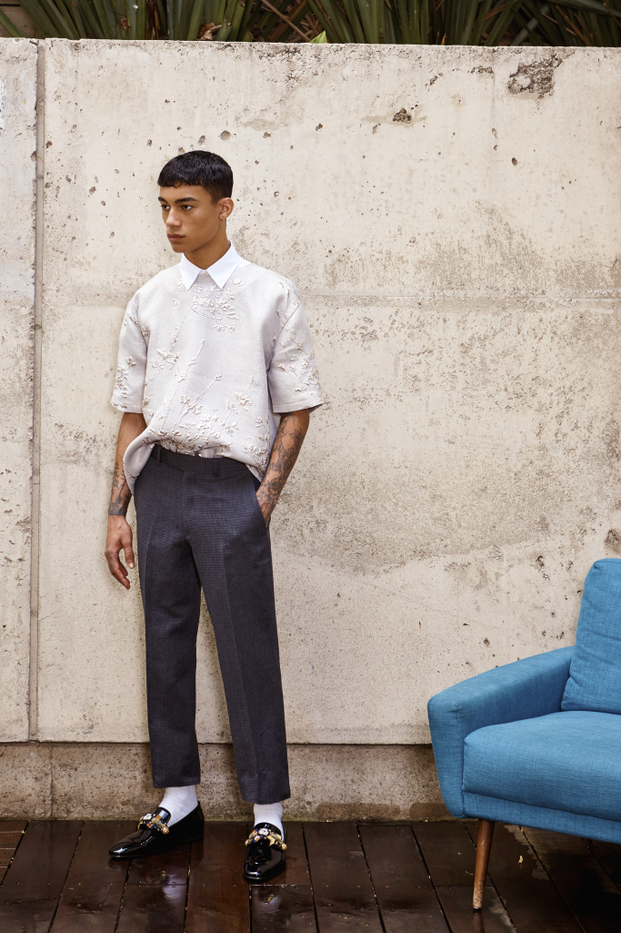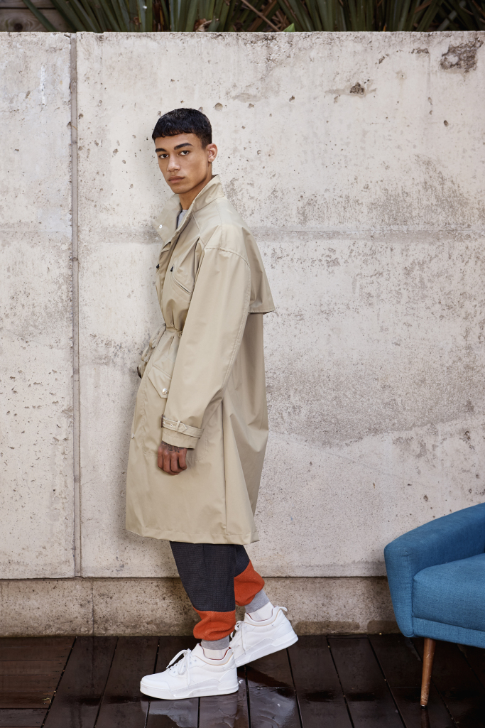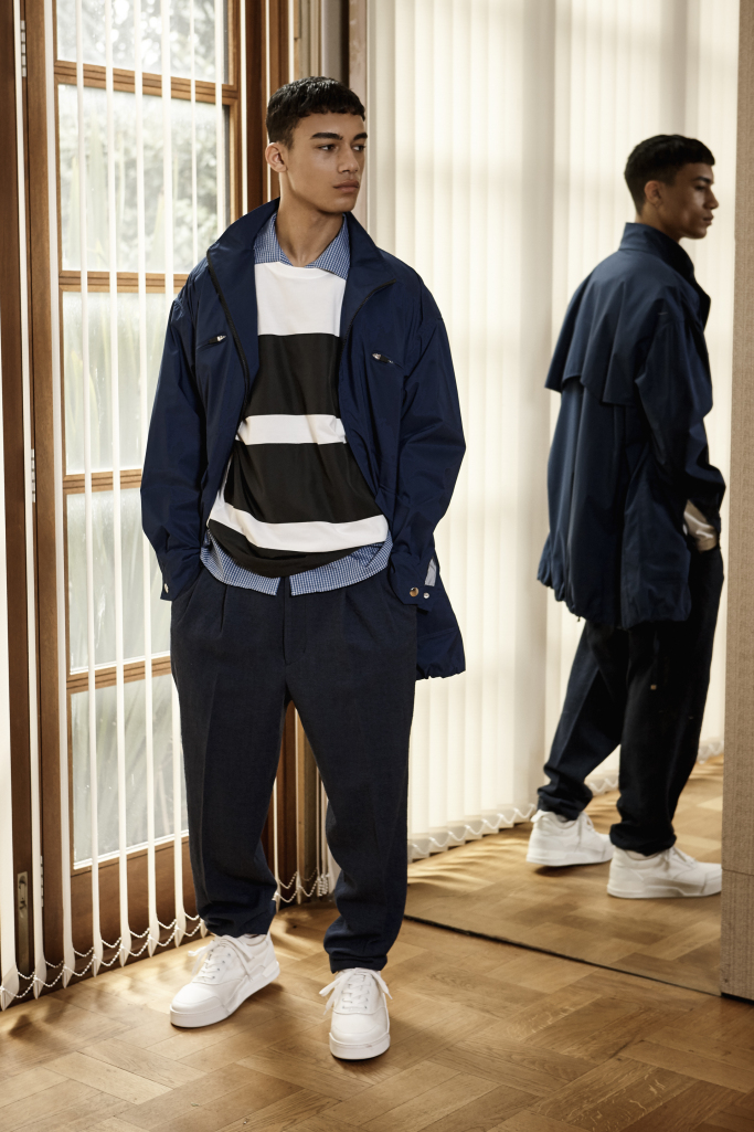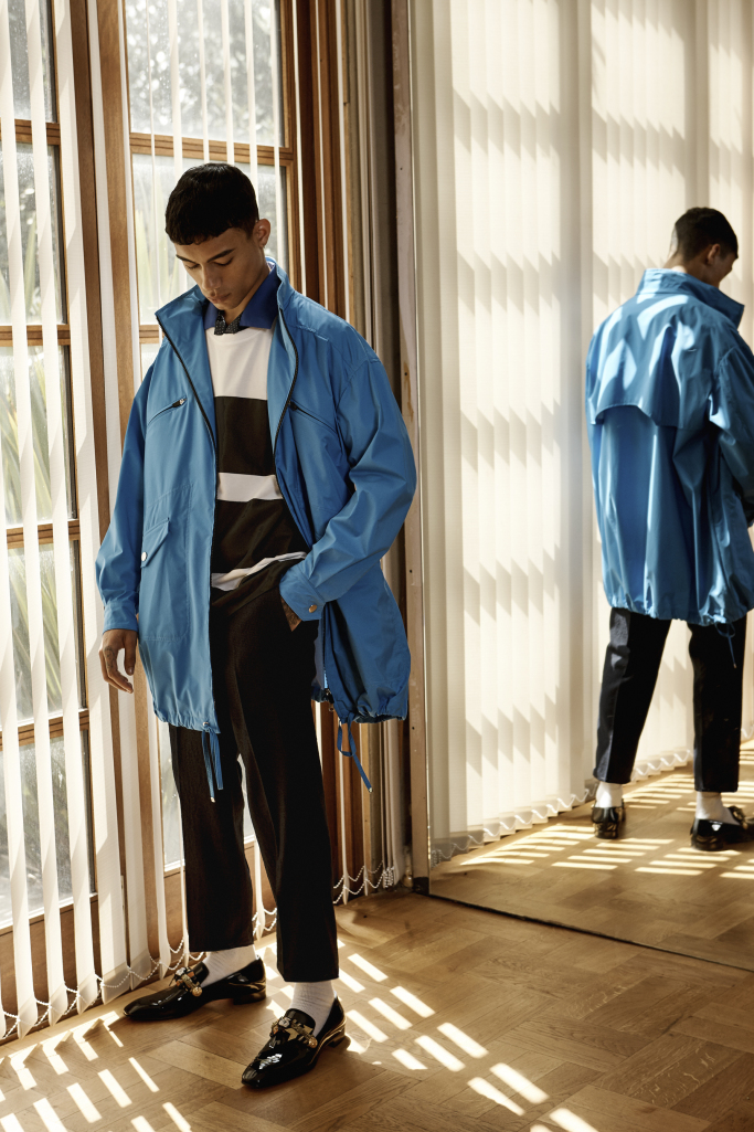 And there are plenty of those details in the spring collection. One of the label’s loosely tailored, high-waist suits features seams on the outside of the garments that are finished off with chi chai, a Japanese overlocking micro-stitch. Indeed, the majority of the collection is manufactured in Japan, Casely-Hayford noted. There are also pieces such as a roomy, silk T-shirt shaped top, with a silver branch design “debossed” into its surface, an effect the designer likens to an “engraved textile.” And a trenchcoat and cagoule hybrid in a breezy, three-layered waterproof fabric is intricately designed, so that it cinches at the waist but leaves volume at the back of the coat. There are also women’s looks in the same palette of fabrics, most of which Casely-Hayford produces on a made-to-order basis.
