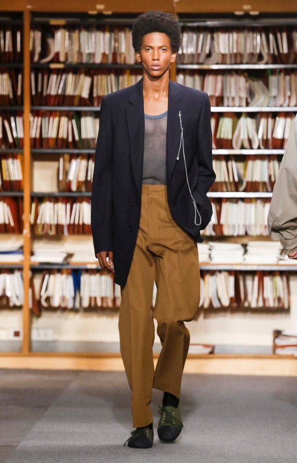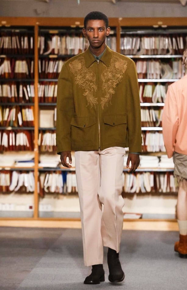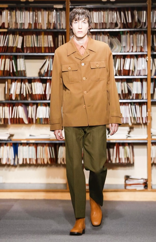 Reining back his recent plays on oversize volumes, Van Noten juxtaposed pastel shades with dense earth tones on sporty yet formal silhouettes. Long blazers, belted trenchcoats and buttoned-up shirts had a slightly retro tinge, heightened by vintage-inspired tonal prints.