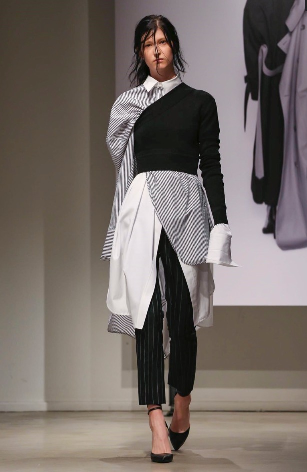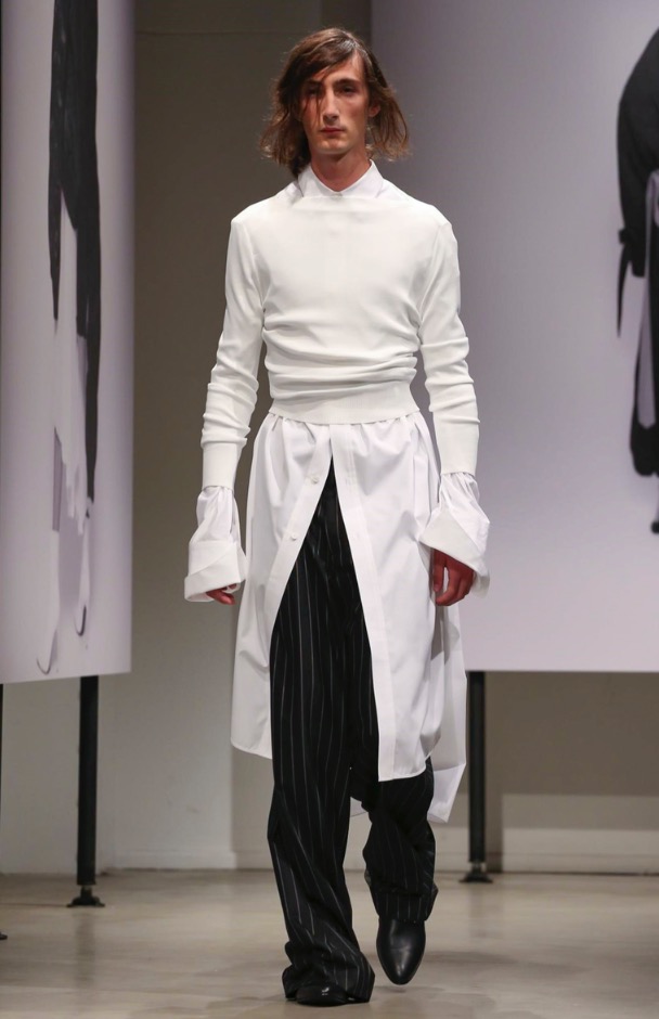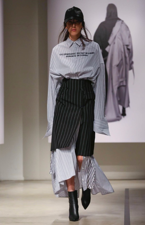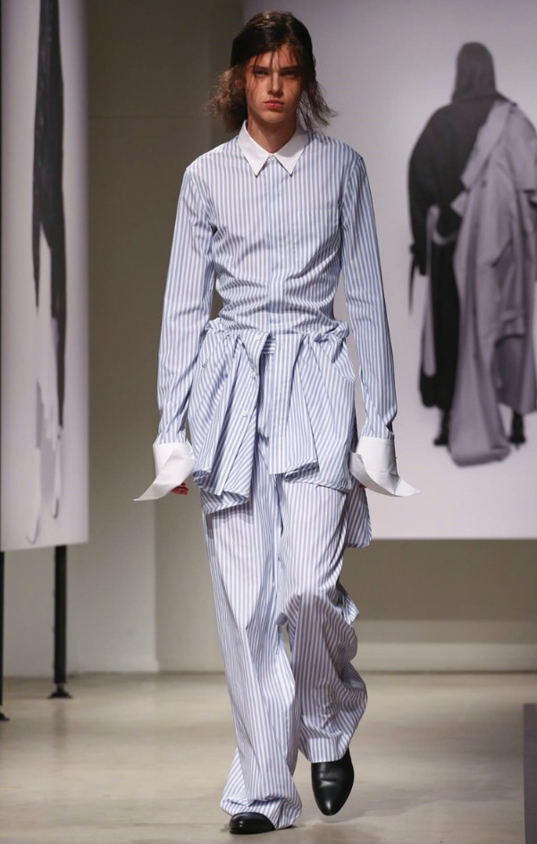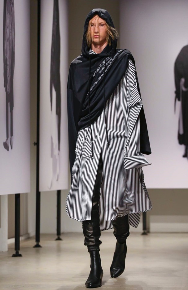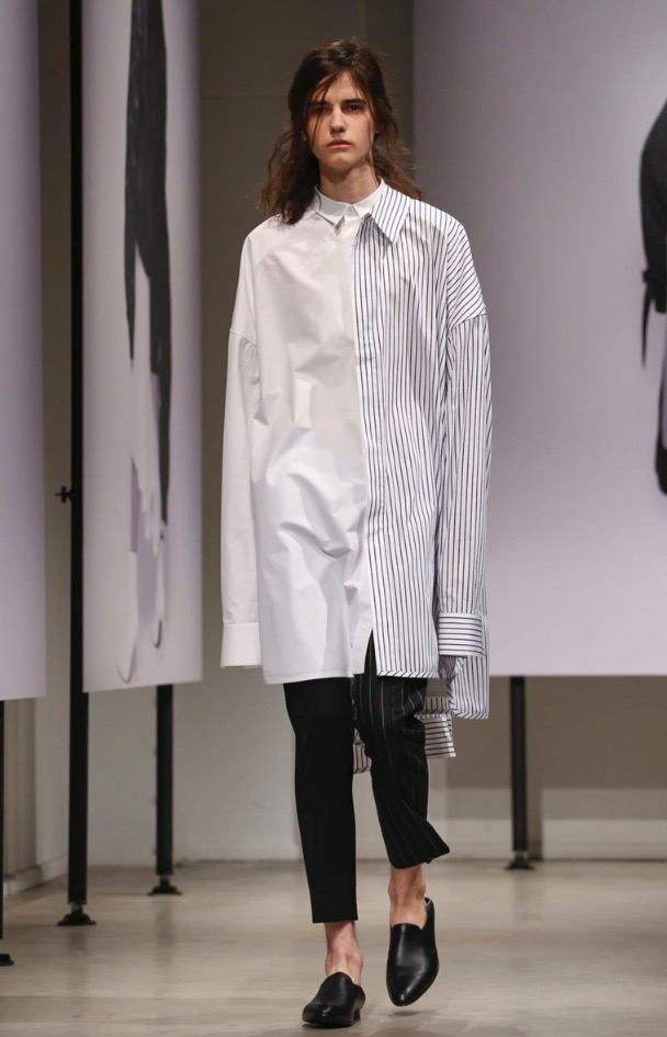 Having a black and white presences in the Spring/Sumer 2018 collection of Juun J. , for its parade in Paris, the maximum deconstruction of the garments finds a new way of translating shirt in oversize items that show diplomatic stripes shaped In modernist looks that play with the male silhouette.