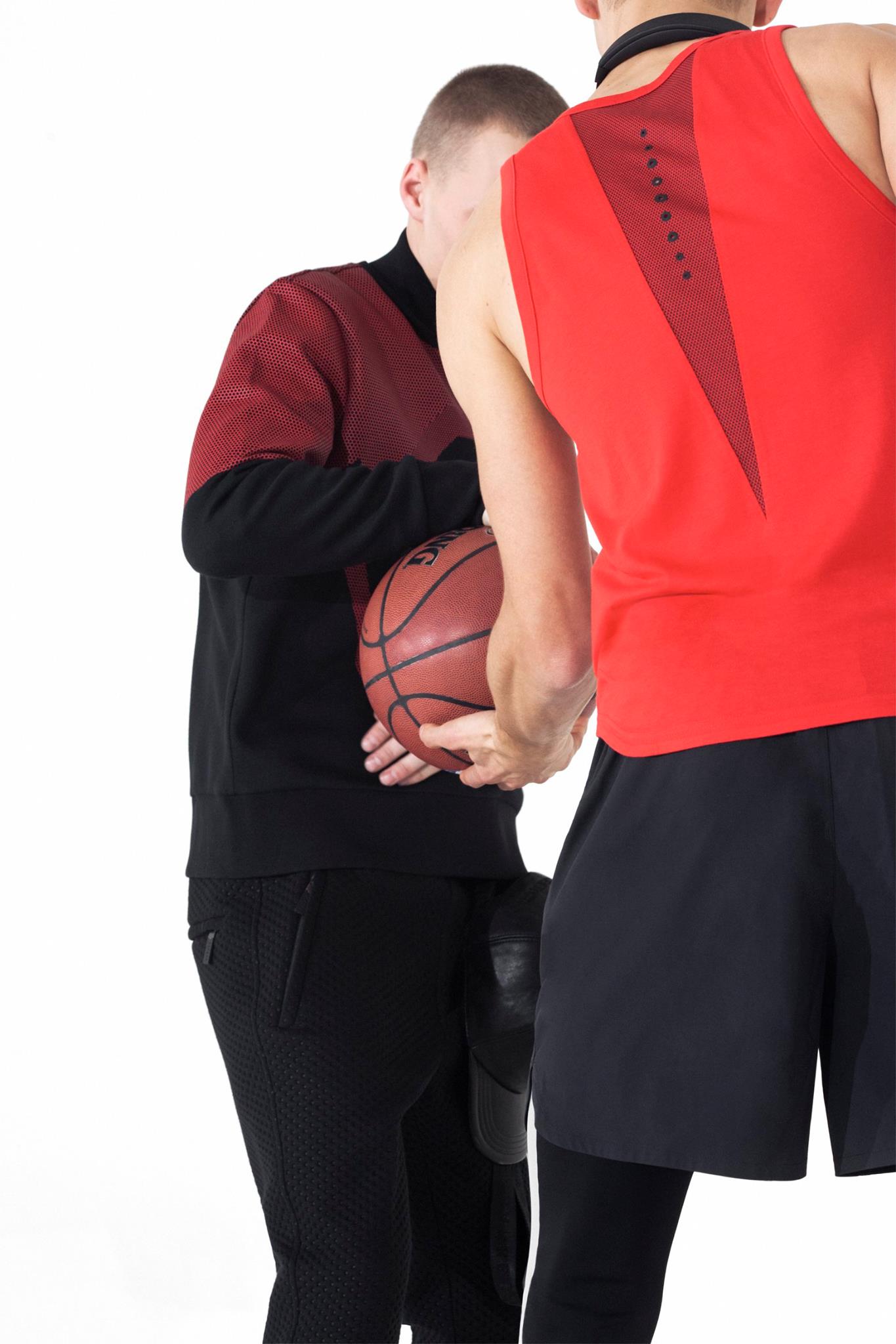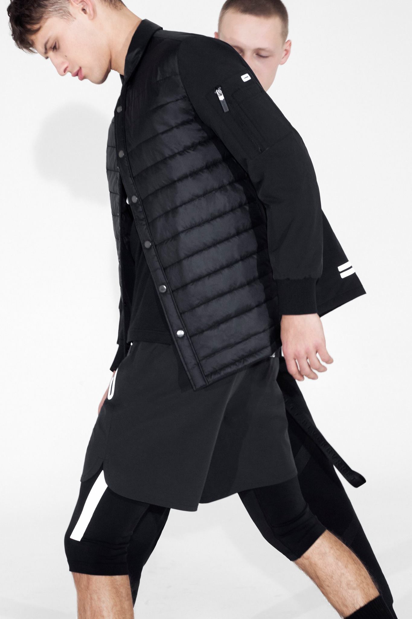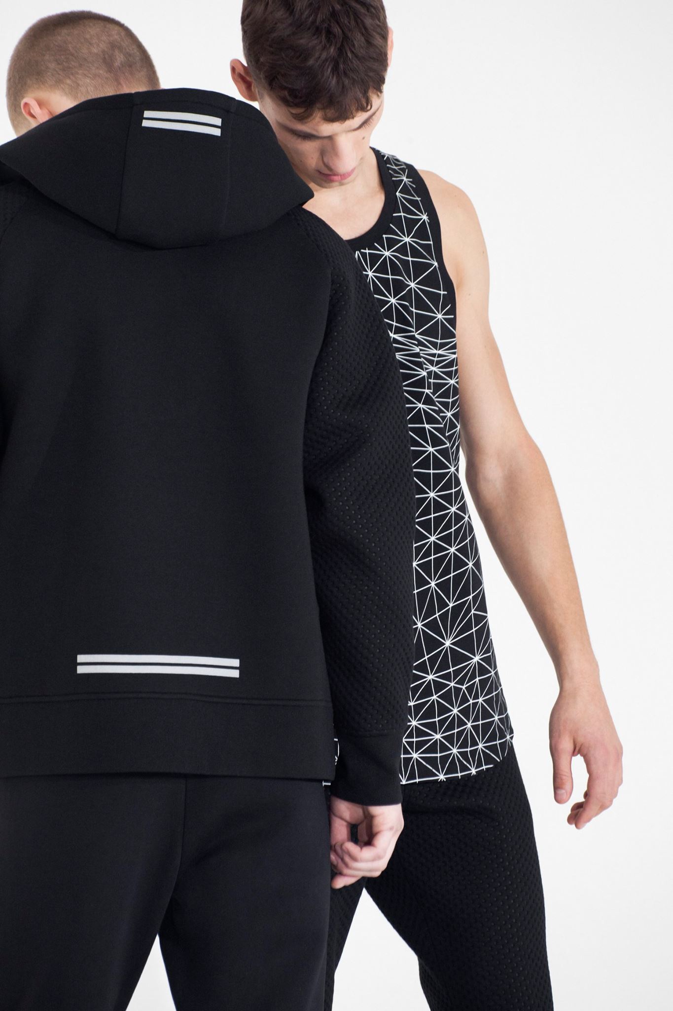 Sartorial pinstripes inspire multi-stitched sweatshirts, while intricate ribs inlays add a tactile interest to zip-up tops. All over printed tees and vests feature ergonomic flat seams and a three-dimensional “net” motif, striking a balance of comfort and style.