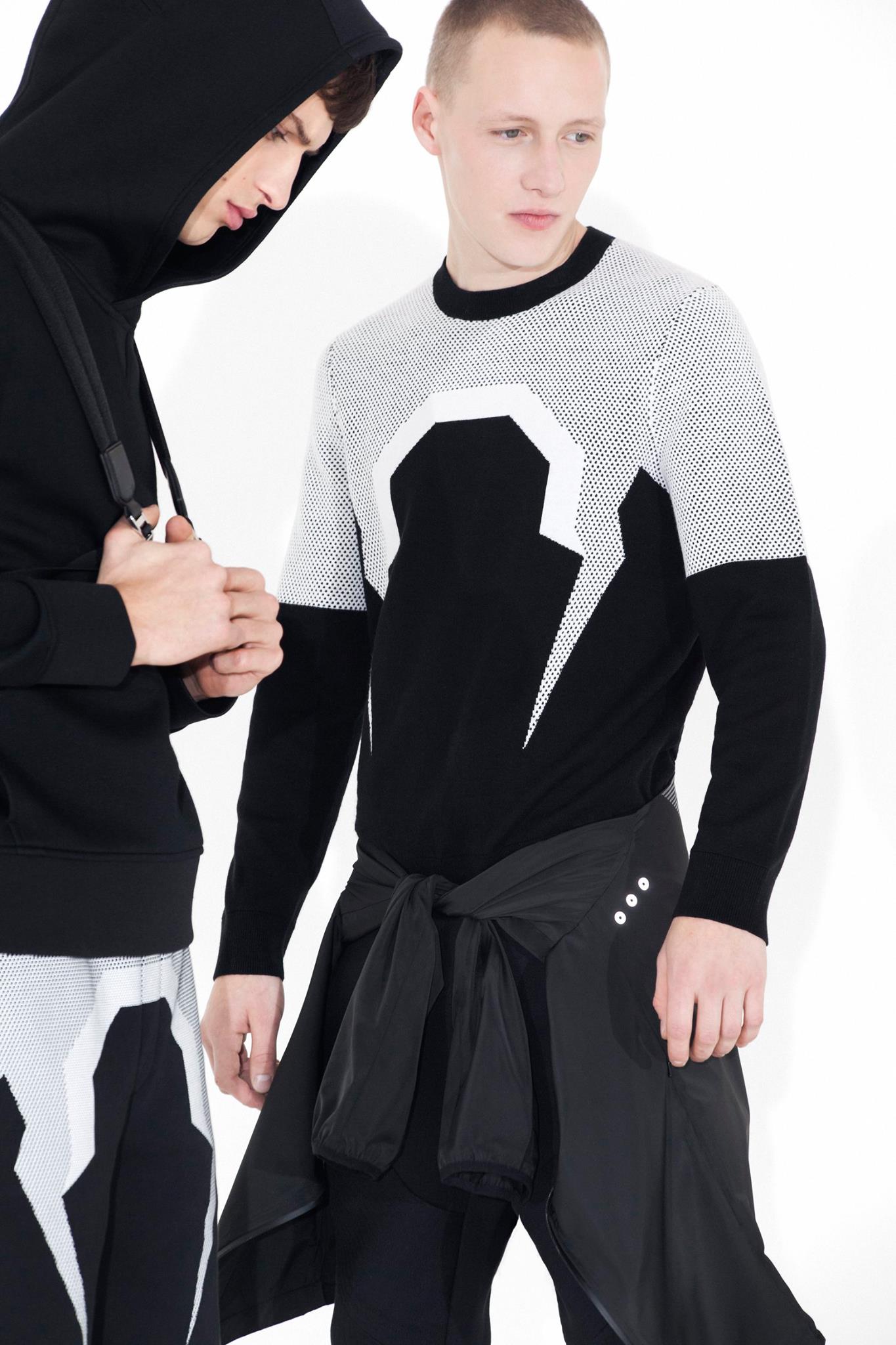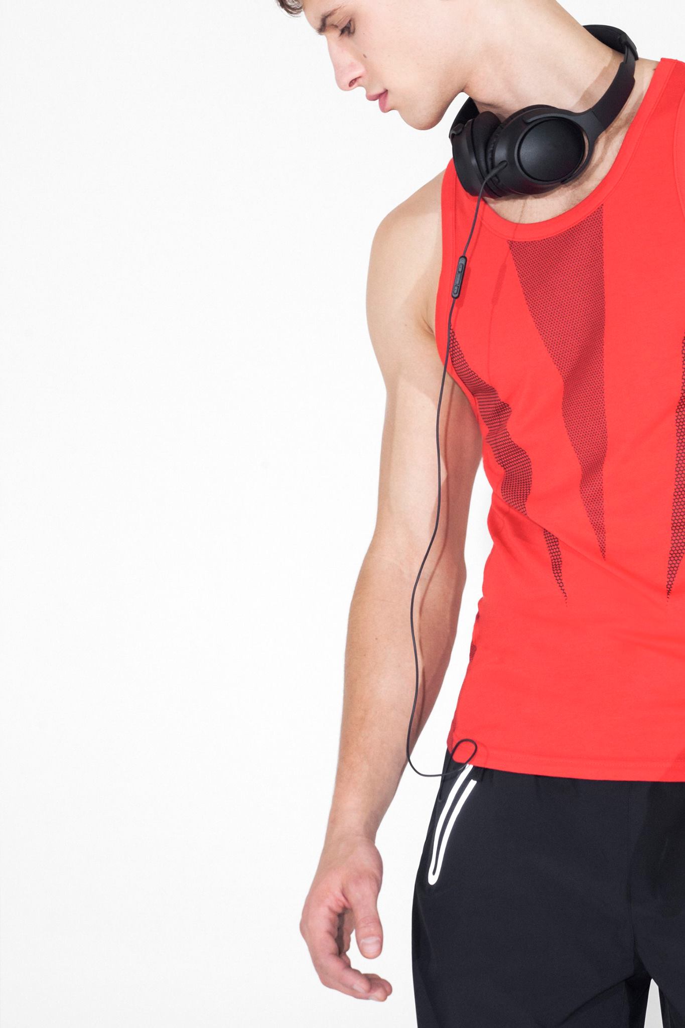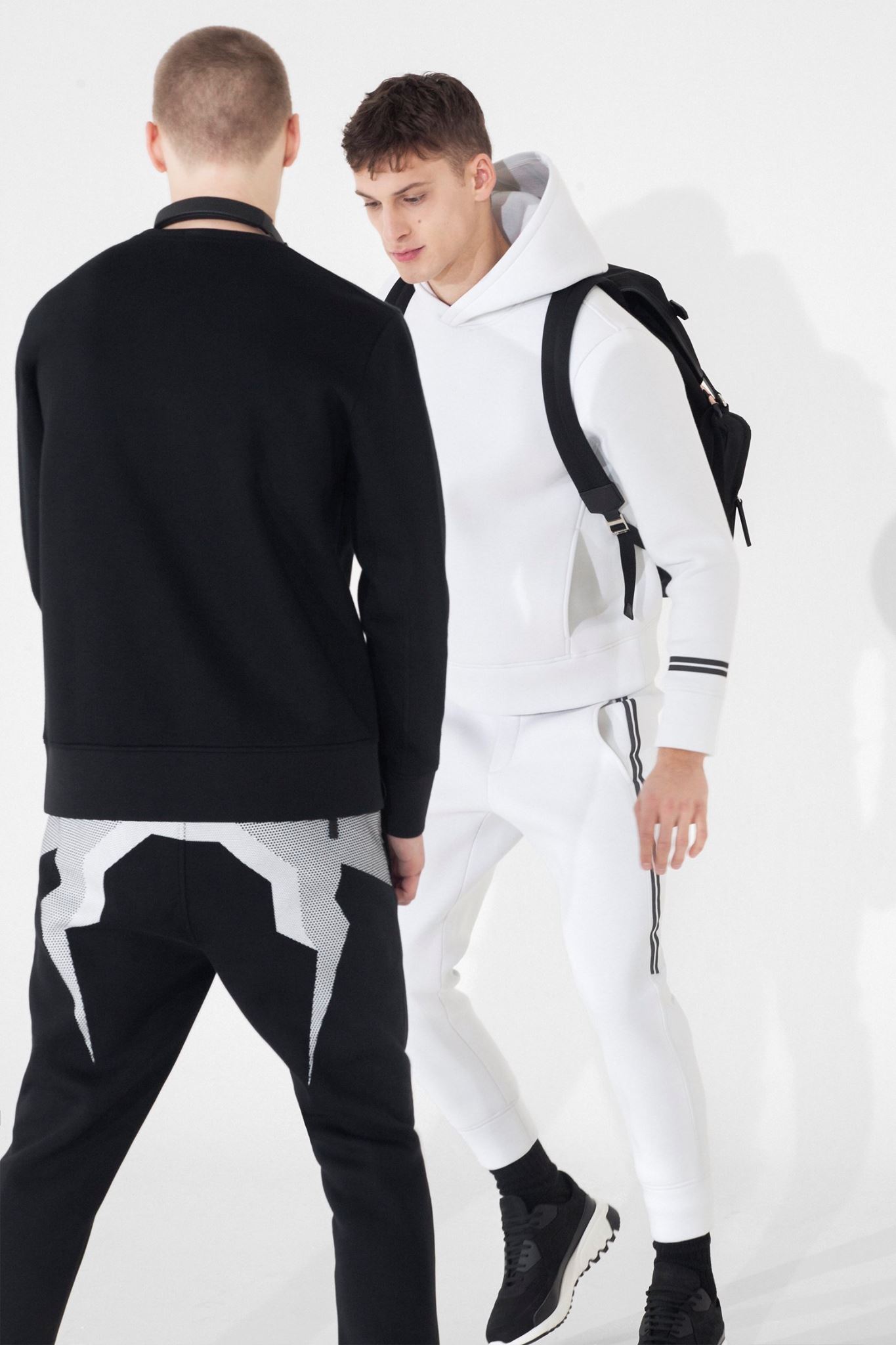 Sartorial pinstripes inspire multi-stitched sweatshirts, while intricate ribs inlays add a tactile interest to zip-up tops. All over printed tees and vests feature ergonomic flat seams and a three-dimensional “net” motif, striking a balance of comfort and style.