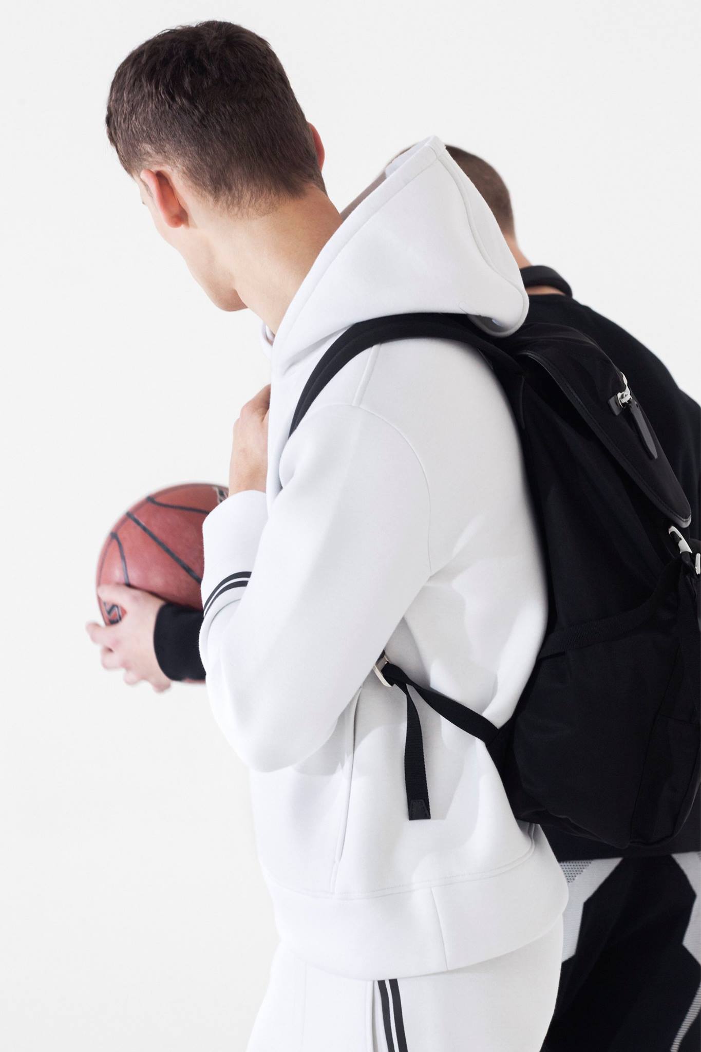 Diagonal cuts, built-in Kangaroo pockets and sealed zippers enhance the freedom of movement while preserving the purity of the design. Joggers in sweat-wicking fleece allow a breathable warmth during workouts, while matching sports leggings and running shorts are meant to be layered to endure variable climatic conditions. Surfaces are either perforated or embossed – always textured.