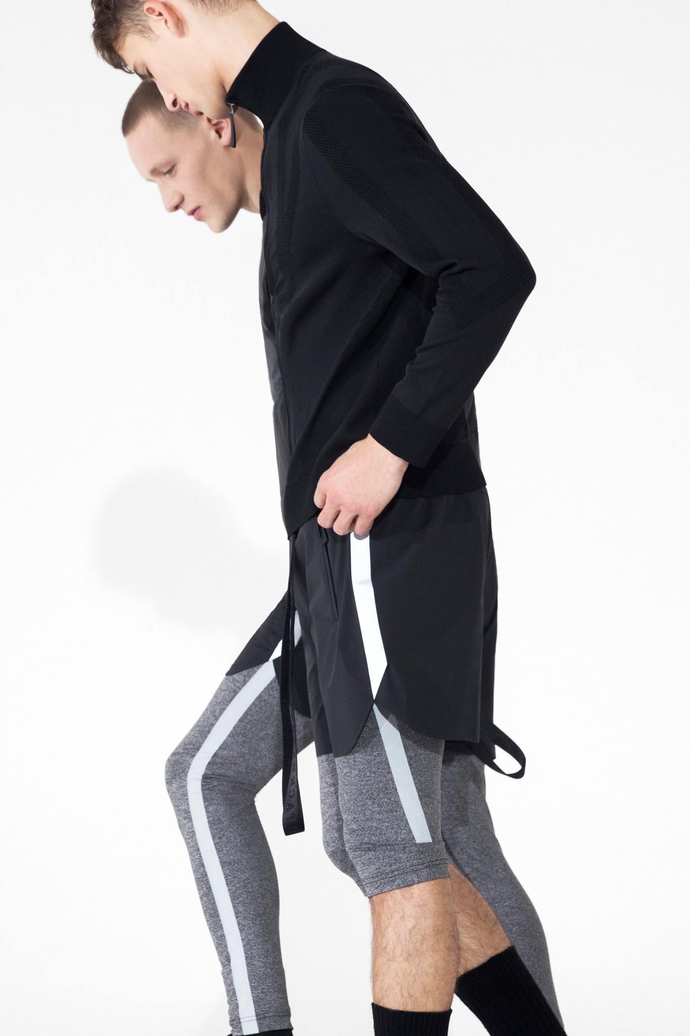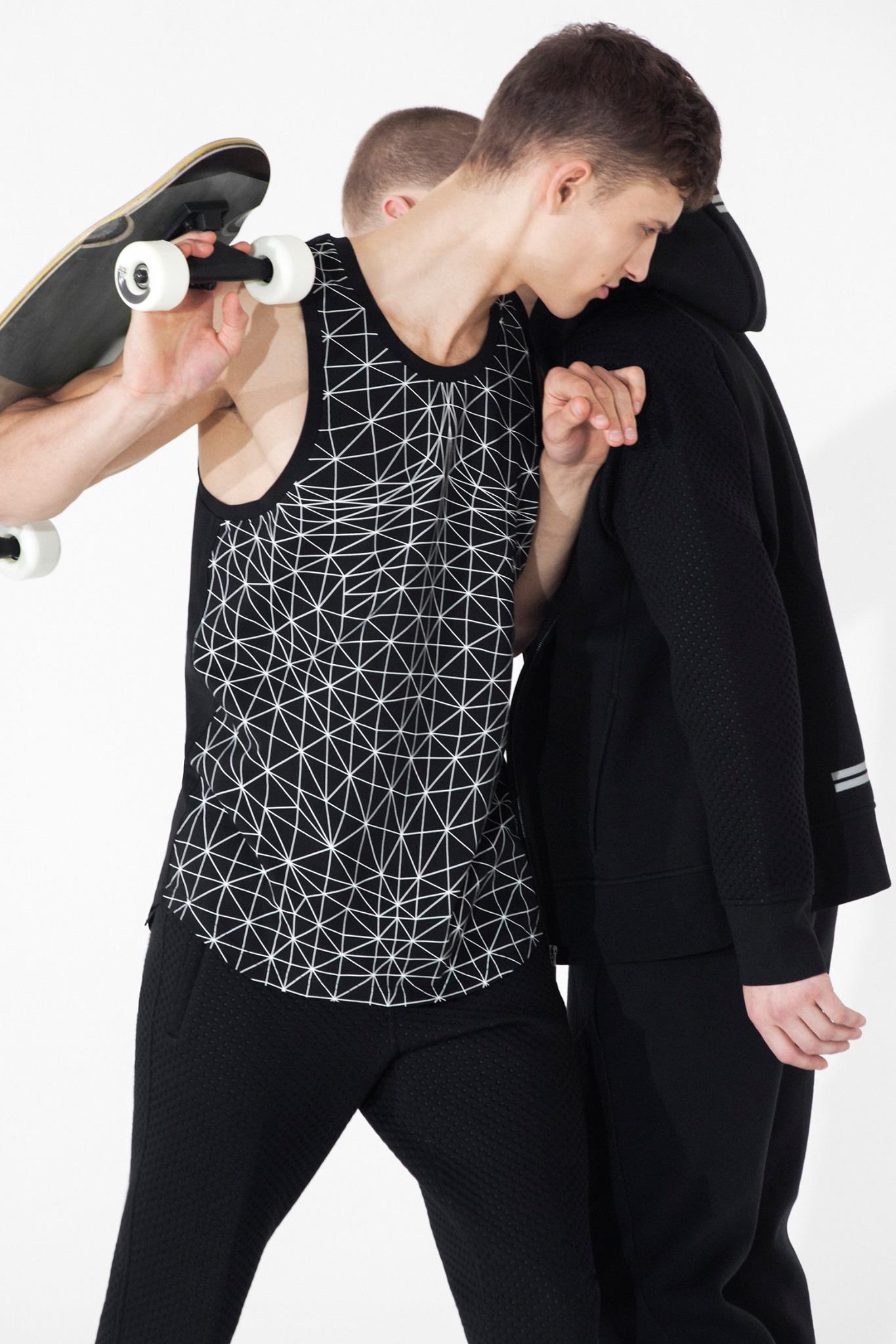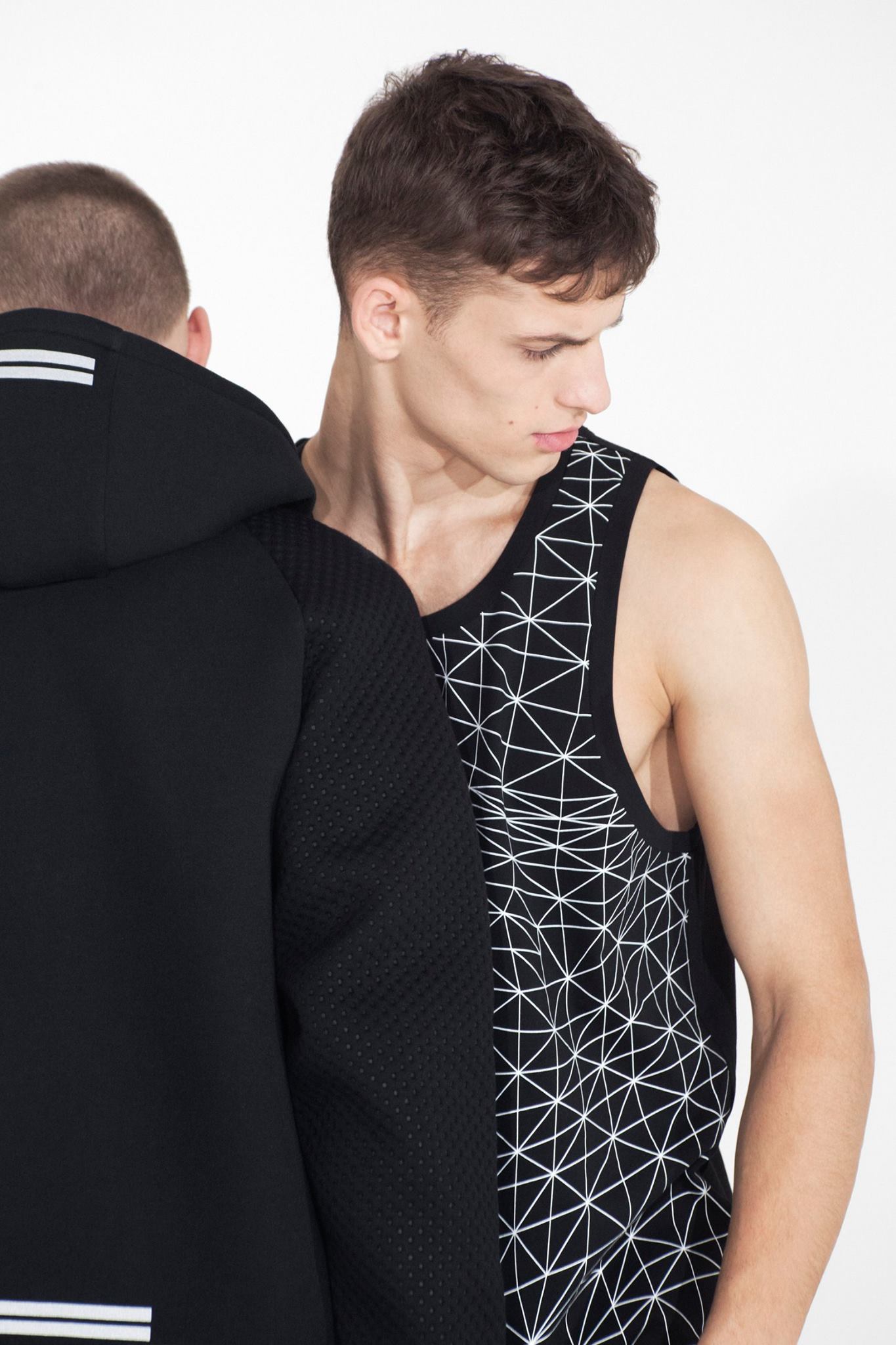 Sartorial pinstripes inspire multi-stitched sweatshirts, while intricate ribs inlays add a tactile interest to zip-up tops. All over printed tees and vests feature ergonomic flat seams and a three-dimensional “net” motif, striking a balance of comfort and style.