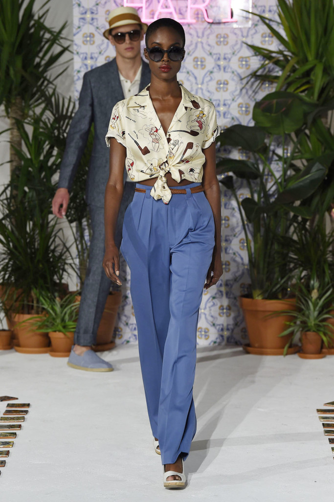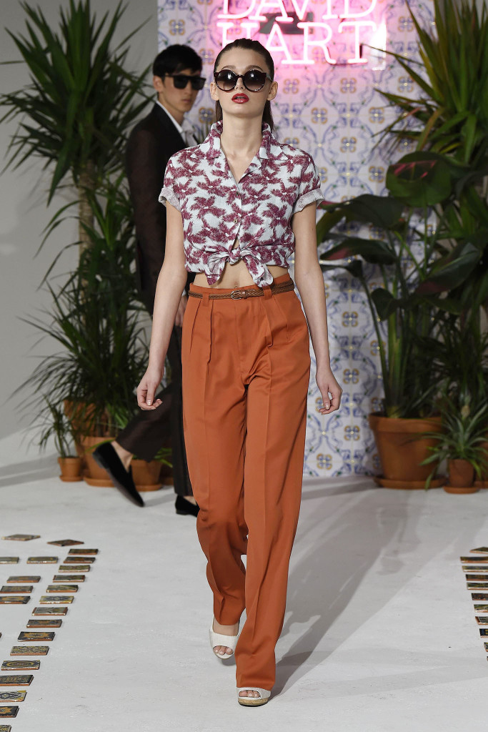 Hart showcased two women’s looks at his presentation — “My background was in women’s wear,” the designer said, “so it was fun to show [a complement] to the David Hart guy.” The girls wore Hollywood high-waisted pleated trousers with tied-up Cuban-printed shirts.