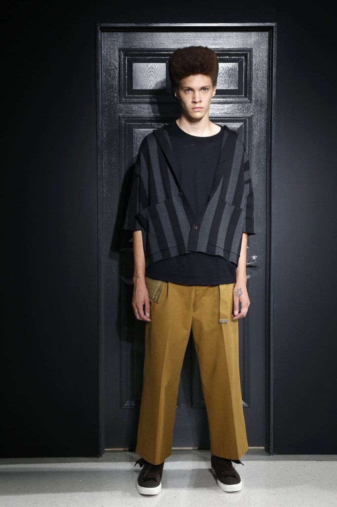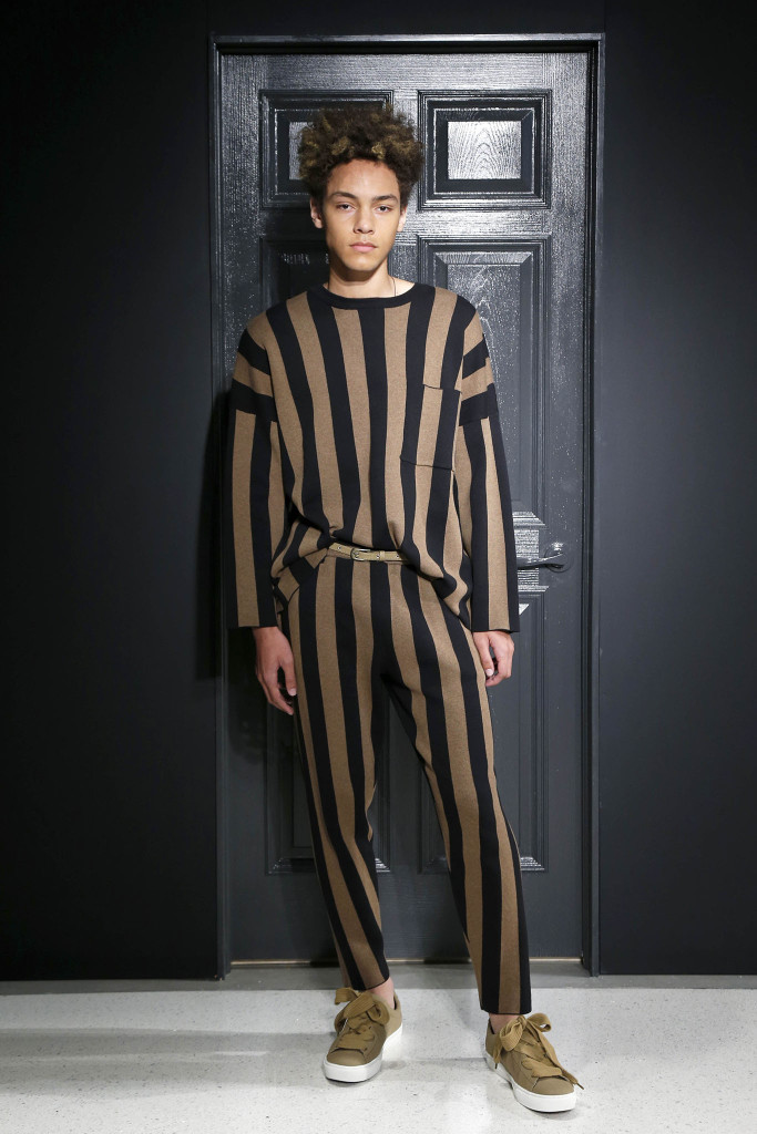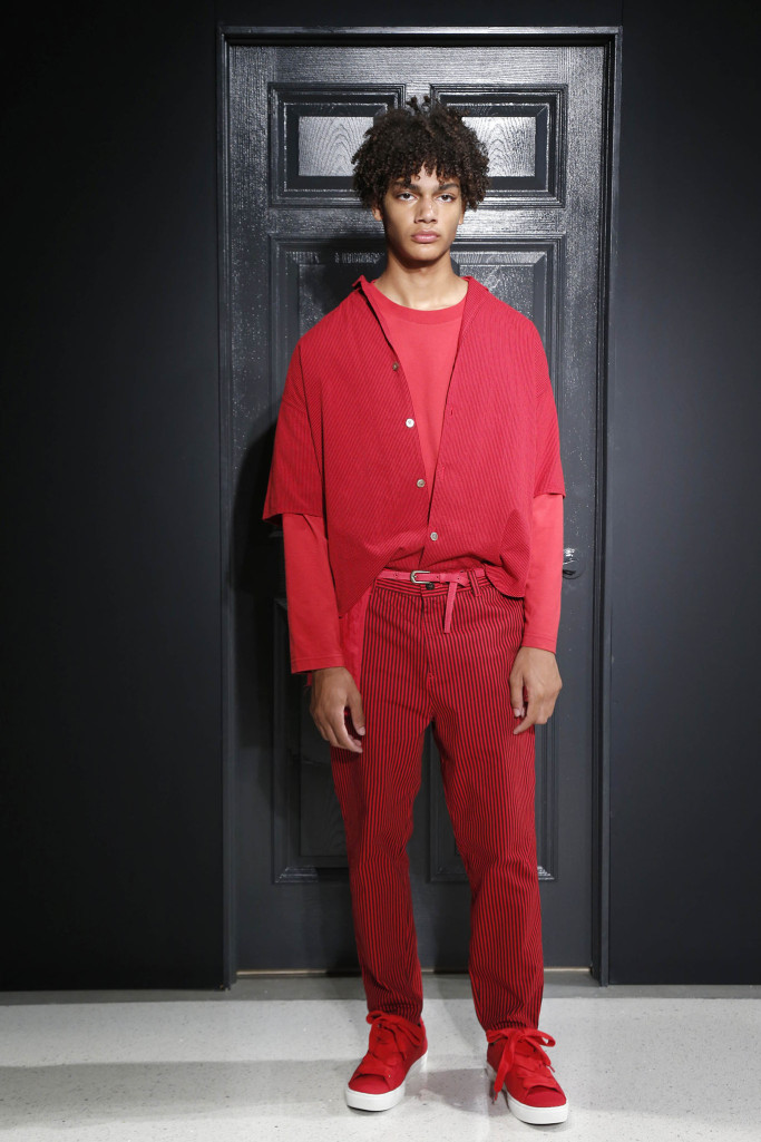 Geller’s signature rich palette was Gustav’s most directional and unique message. Some of those colors included deep mustards, concrete green and bright red. Geller’s bold striped patterns from his main line also made a guest appearance here in pants and bomber jackets — the only graphic statement of the offering.