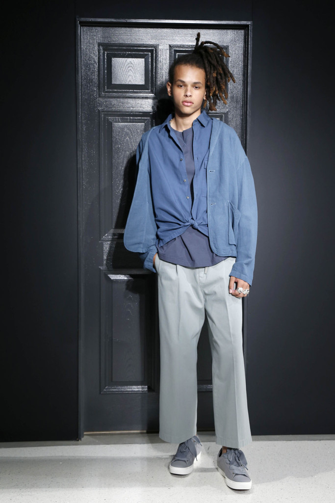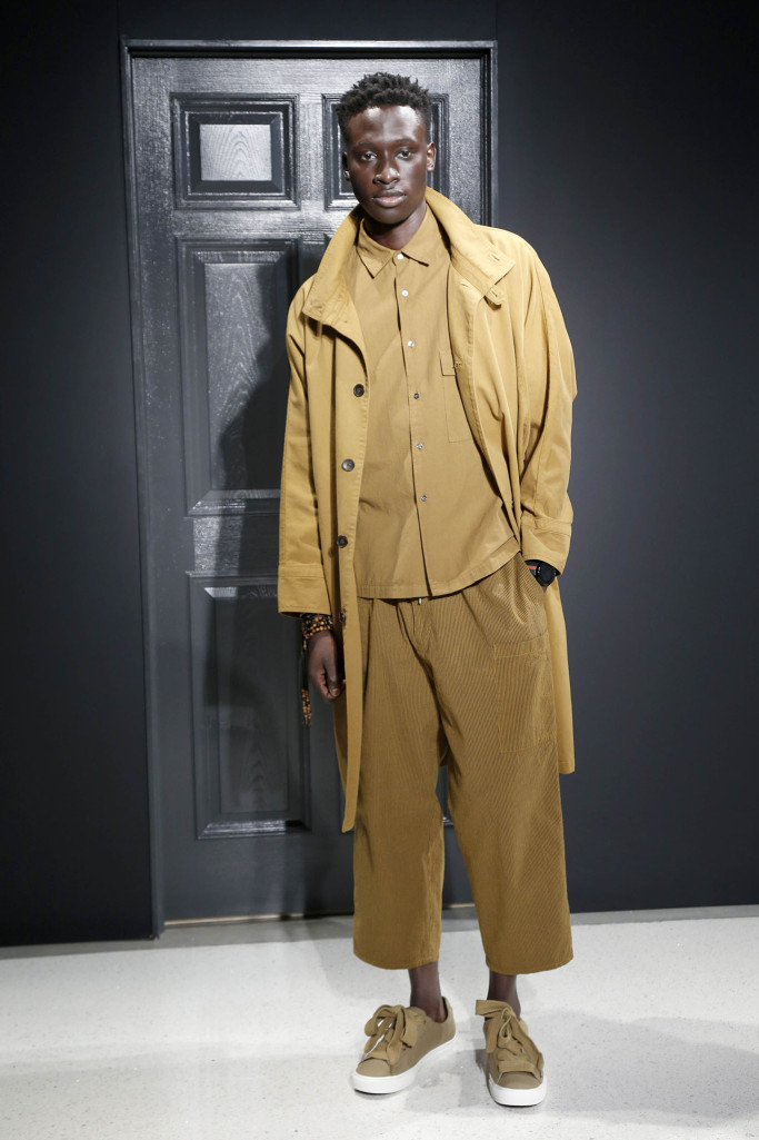 The cohesive lineup consisted of an array of tonal outfits that read like minimalistic uniforms. Geller’s long history visiting Japan was clearly reflected not only in the use of Japanese textiles but in the workwear references and more avant-garde silhouettes — very characteristic of that area of the world.