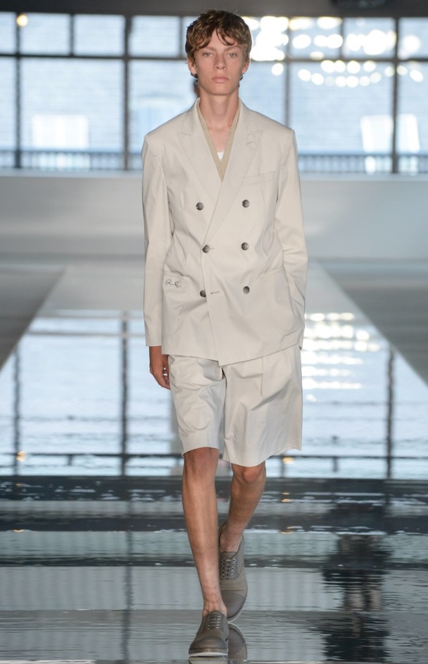 The tailored clothing offering, a mainstay for the Boss brand, included completely unconstructed blazers in peak lapels, sometimes paired with shorts to enhance the leisurely attitude.