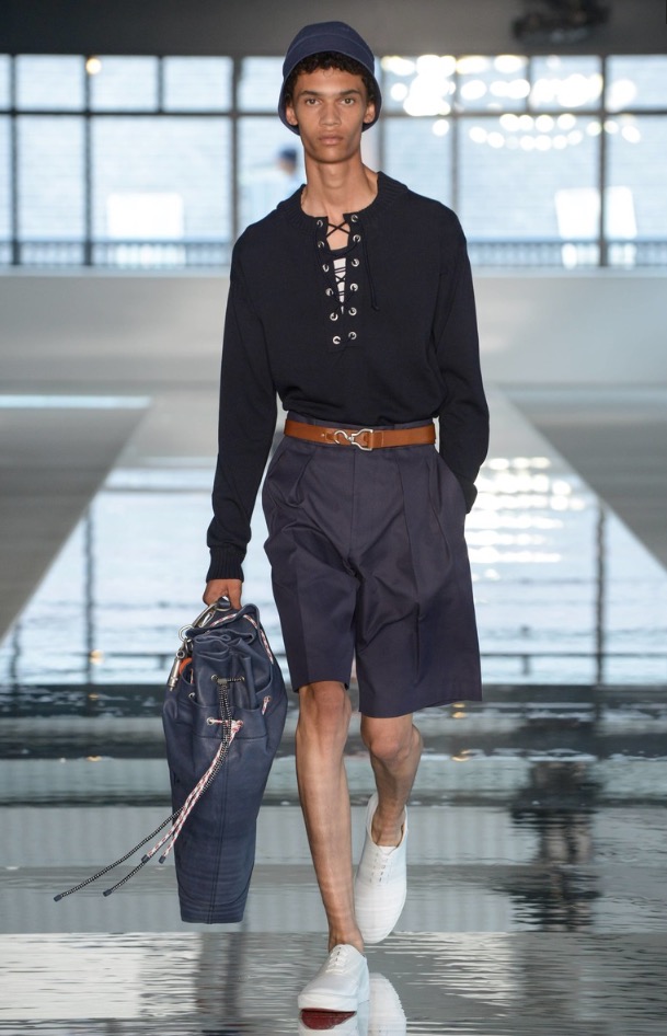 The nautical references, at times subtle, showed up in lace and rope details in an array of tops and were more overt in the flag prints that appeared on the backs of technical nylon jackets. Wilts also used the coordinates of the brand’s Columbus Circle store as embellishment on sack bags.