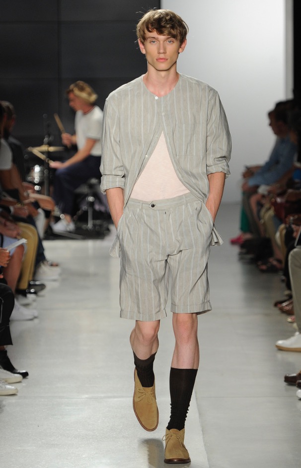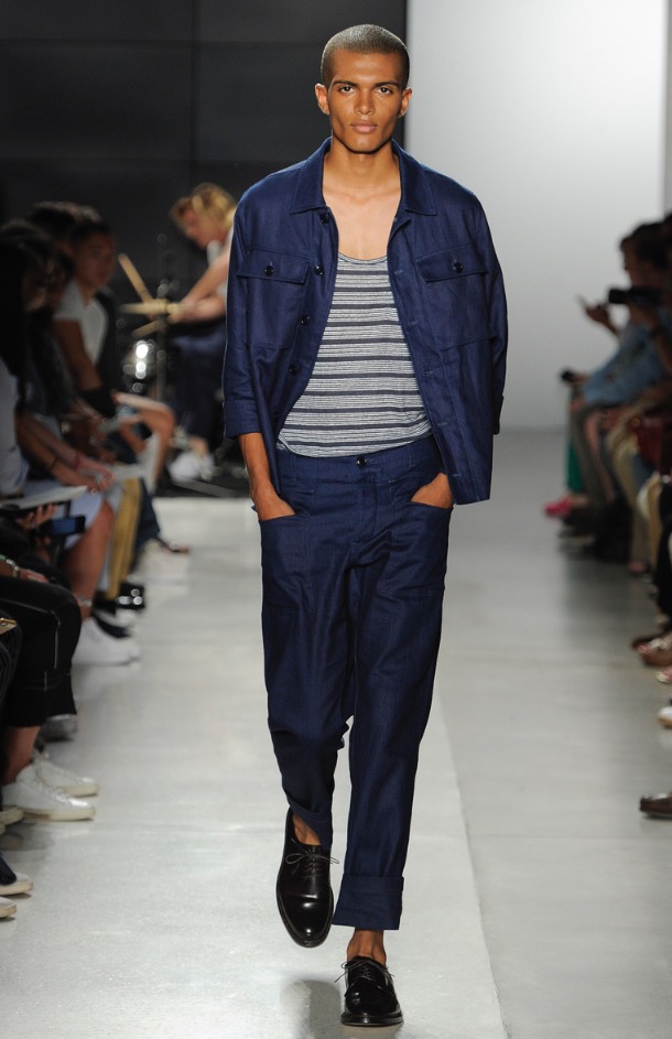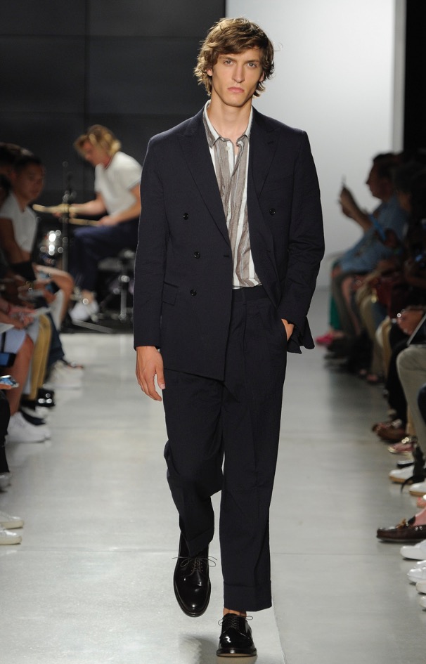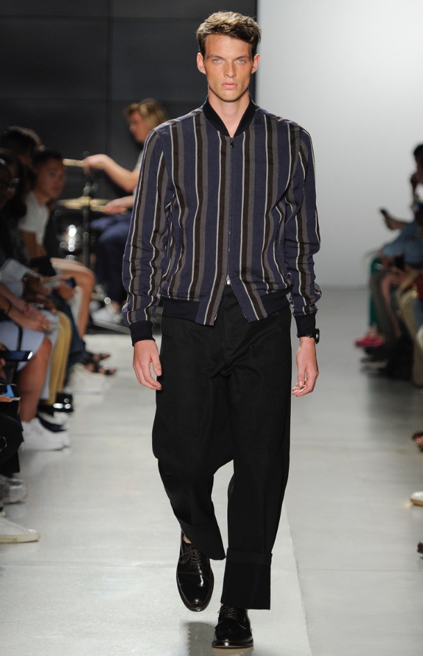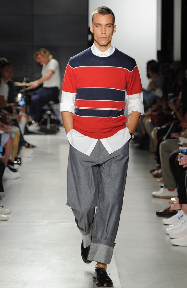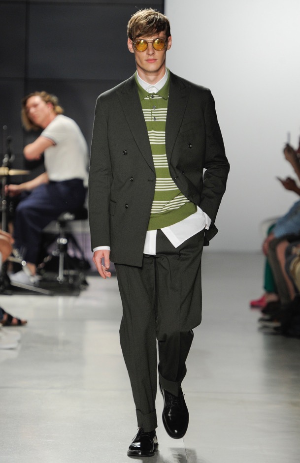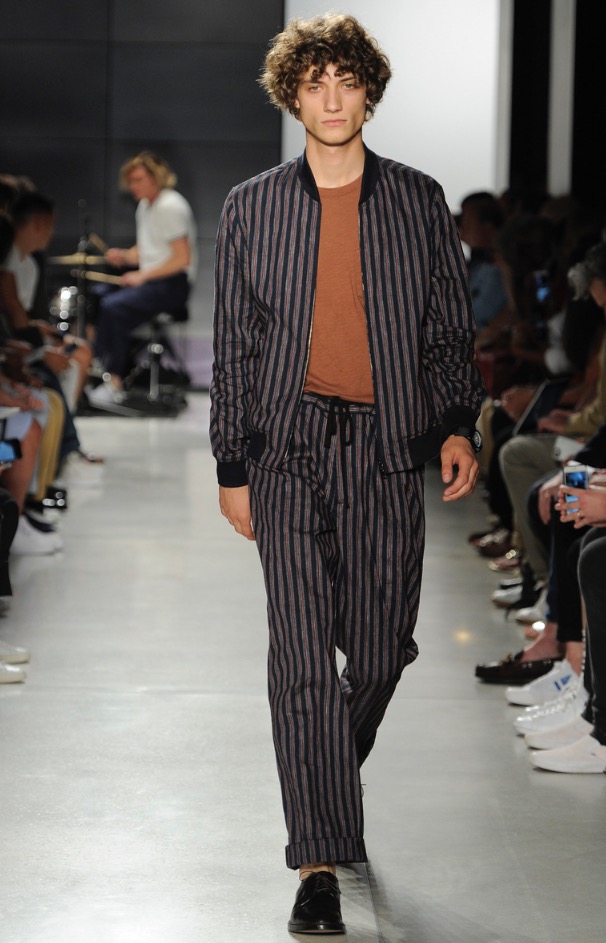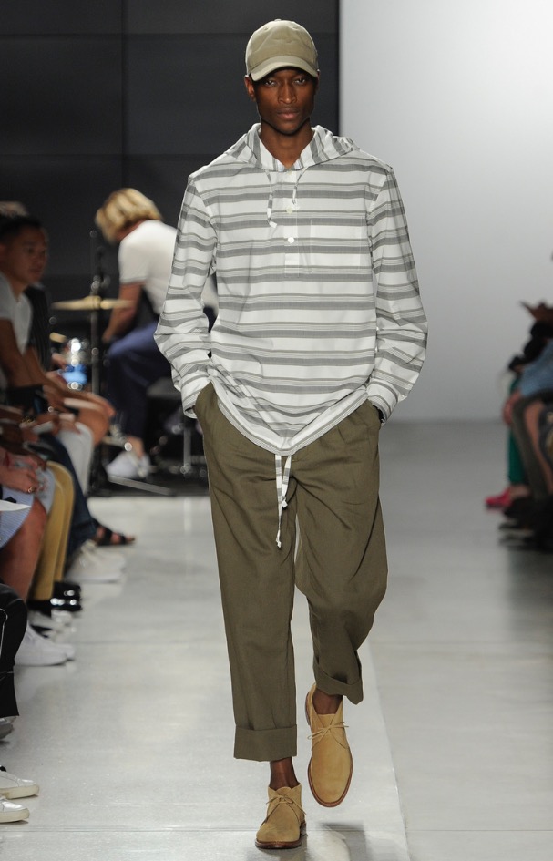 In a show that featured a musical performance from Lewis Del Mar, those eclectic references were visible in a suit fashioned after an old French burlap coffee-bean bag, Marrakech-inspired multistripes in linen bomber jackets and a Mexican Baja white and olive hoodie.