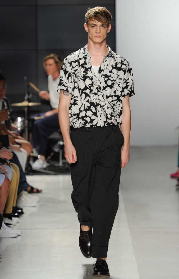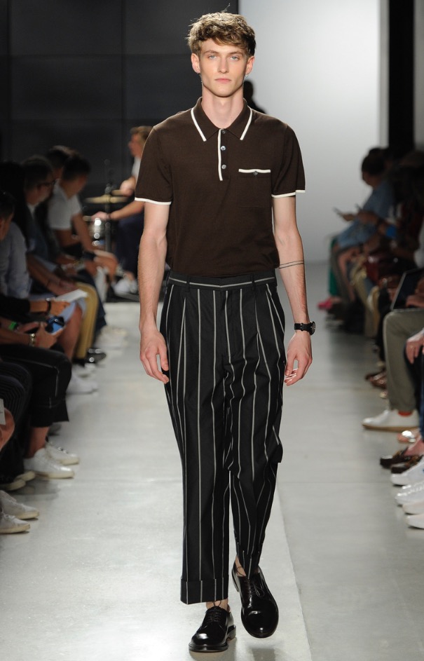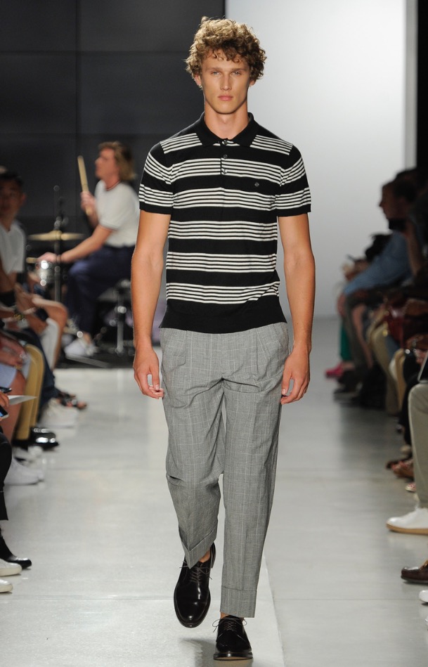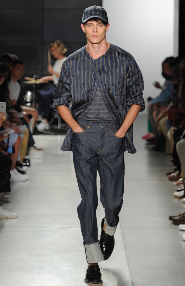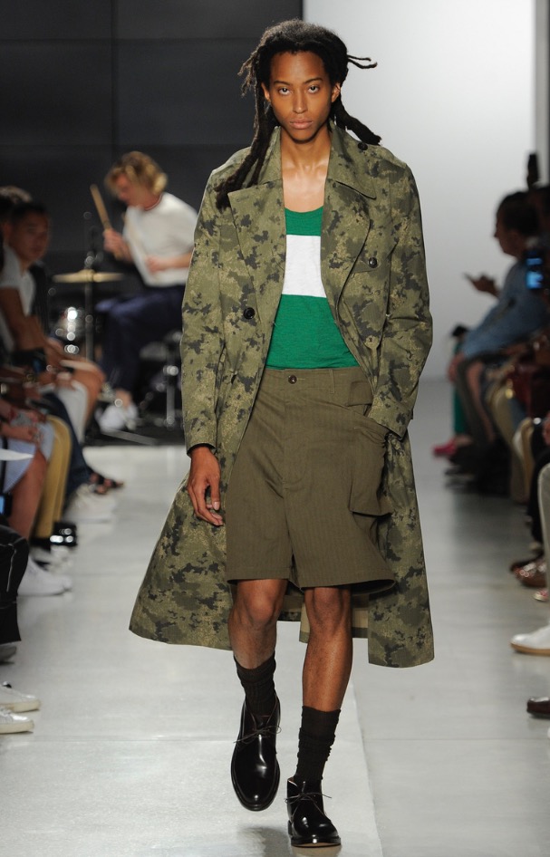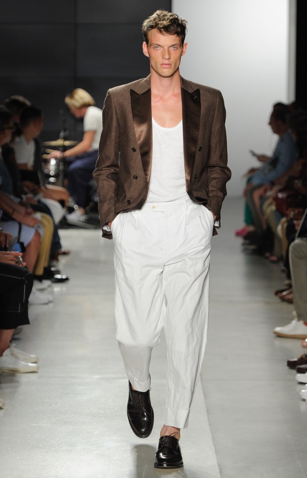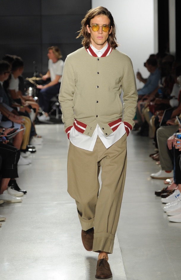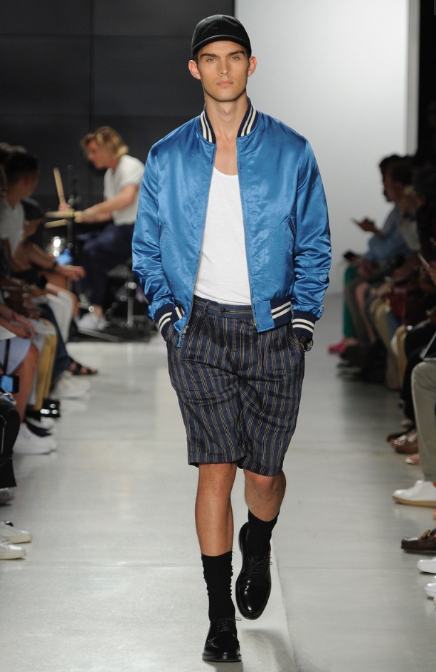 In a show that featured a musical performance from Lewis Del Mar, those eclectic references were visible in a suit fashioned after an old French burlap coffee-bean bag, Marrakech-inspired multistripes in linen bomber jackets and a Mexican Baja white and olive hoodie.