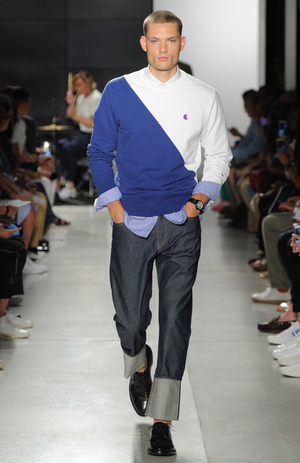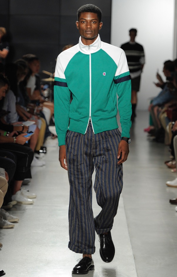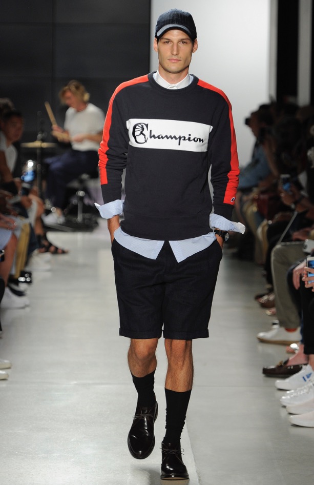 The designer also showcased his long-standing collaboration with Champion by “resurrecting a few classics,” such as a sweater with a diagonal color-blocked design and logo T-shirts worn under blazers and top coats.