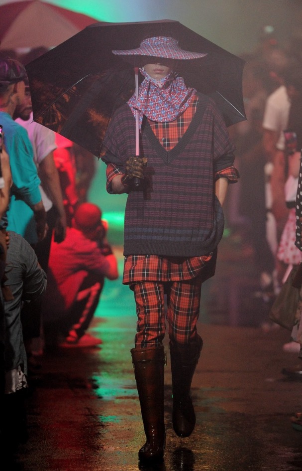 The opening look — a slouchy black rubber trenchcoat paired with matching rain boots, gardening hat and see-through umbrella with glow-in-the-dark shaft — set the tone for the cinematic collection.