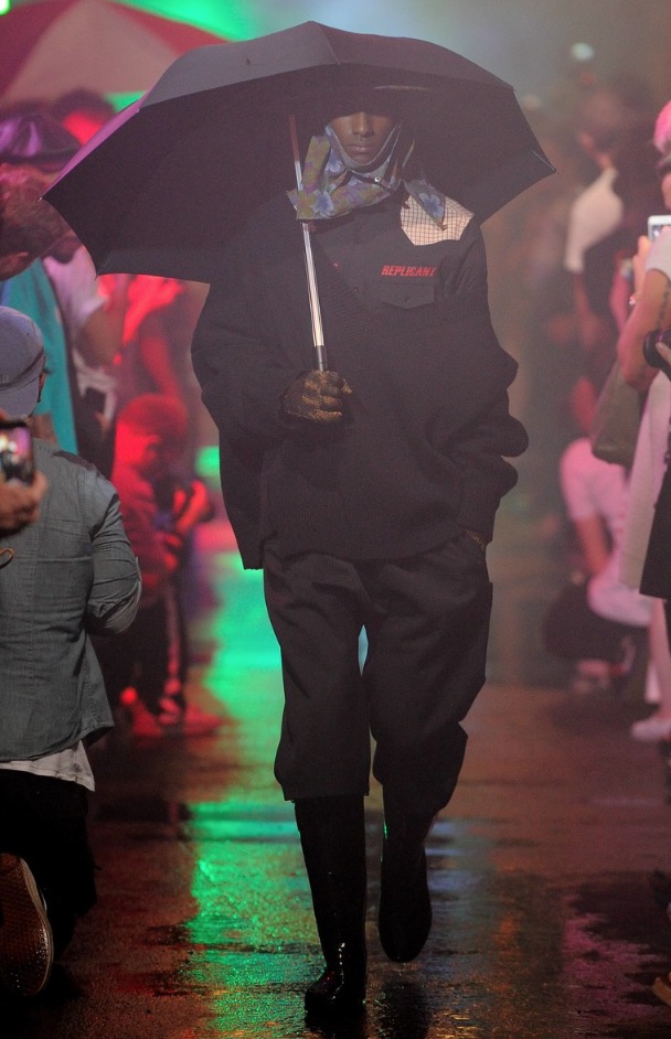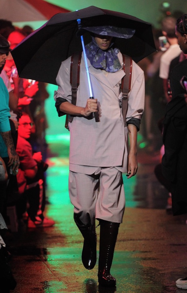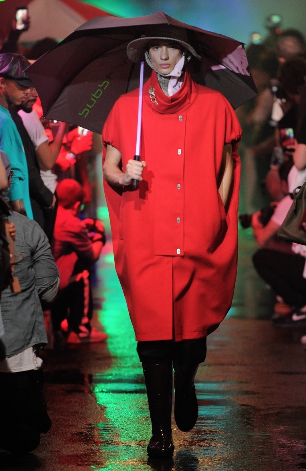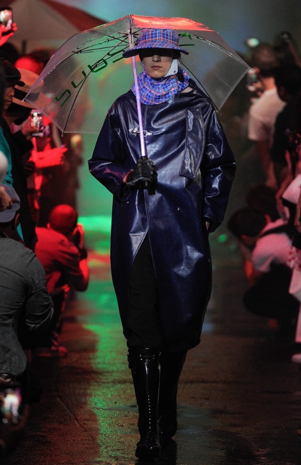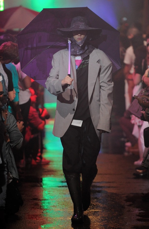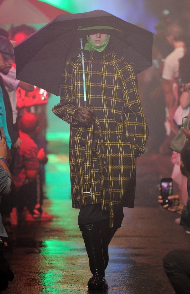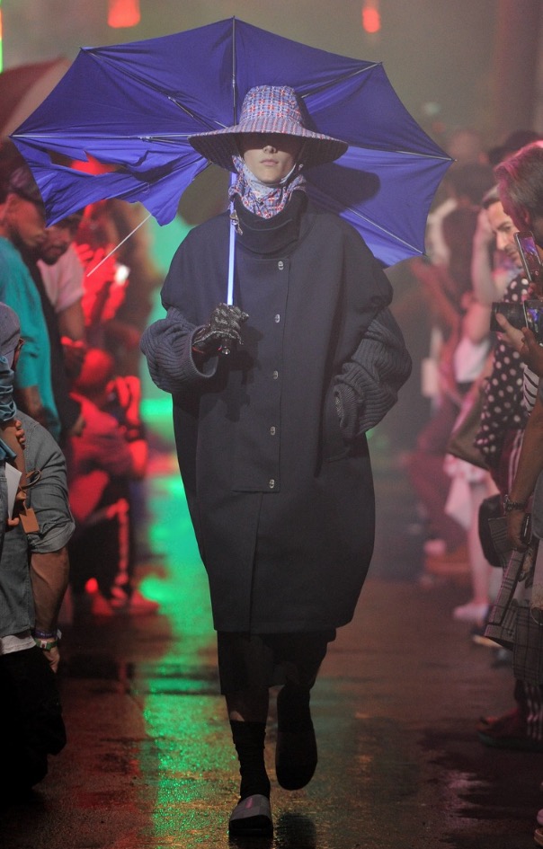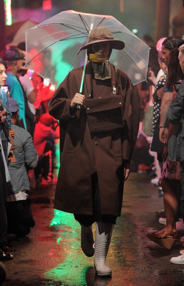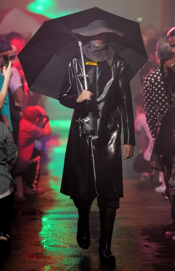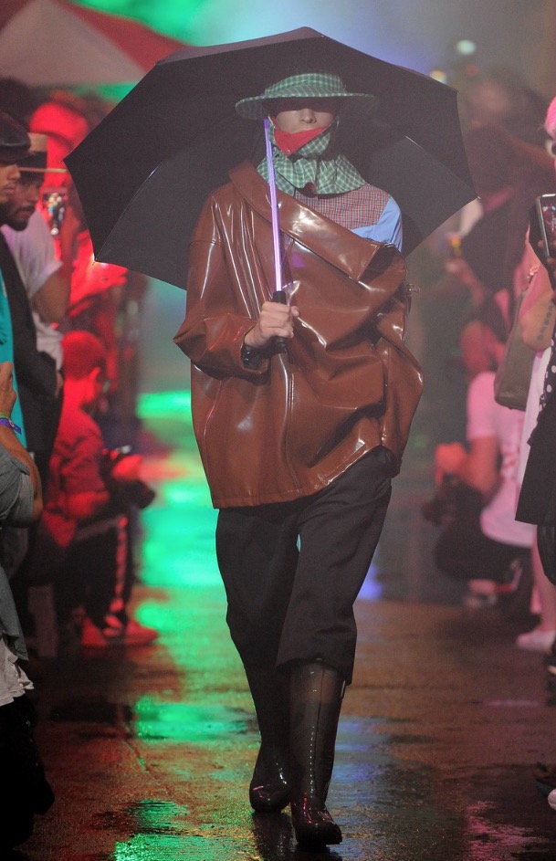 The opening look — a slouchy black rubber trenchcoat paired with matching rain boots, gardening hat and see-through umbrella with glow-in-the-dark shaft — set the tone for the cinematic collection.
