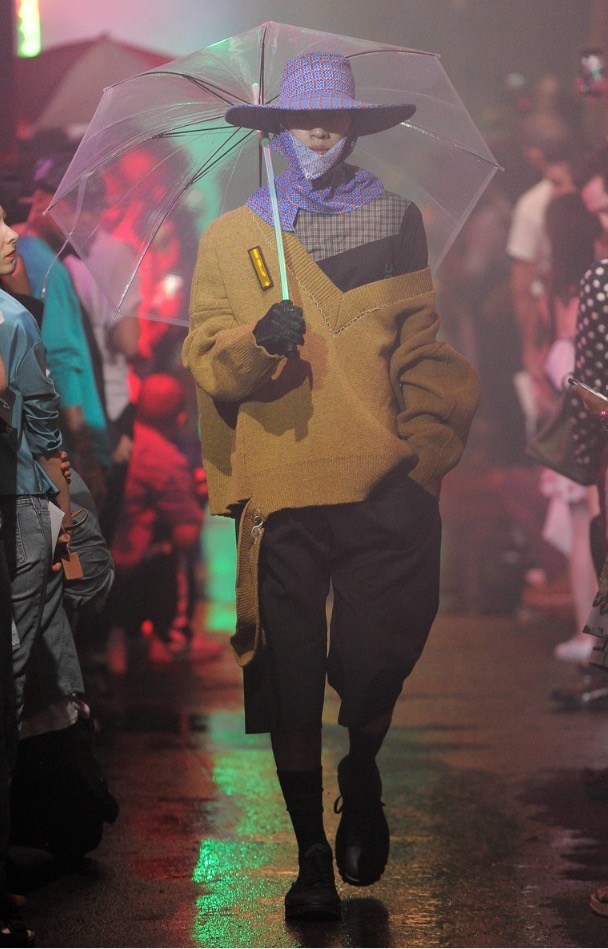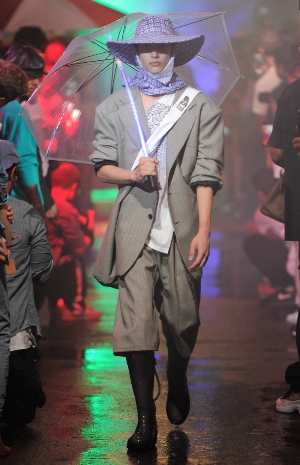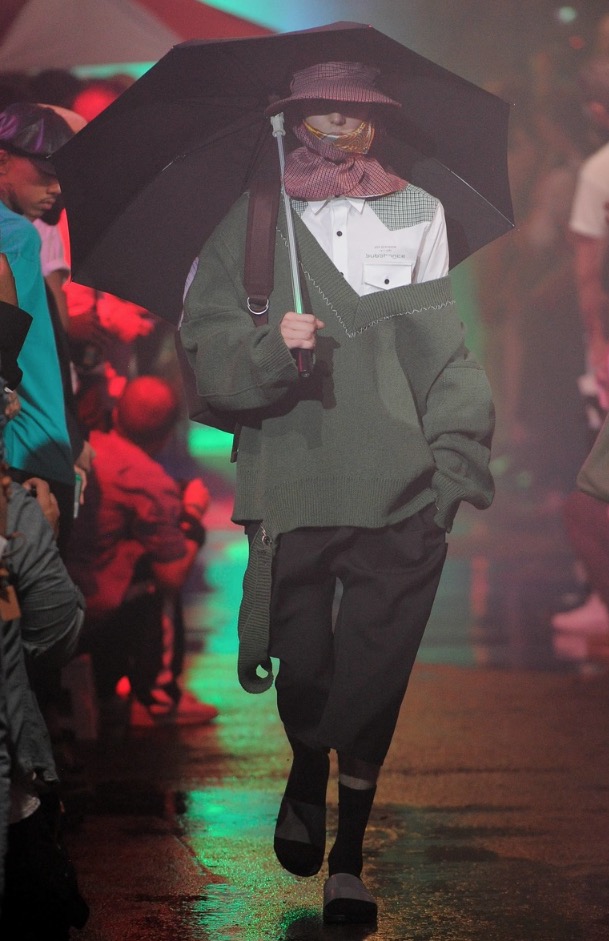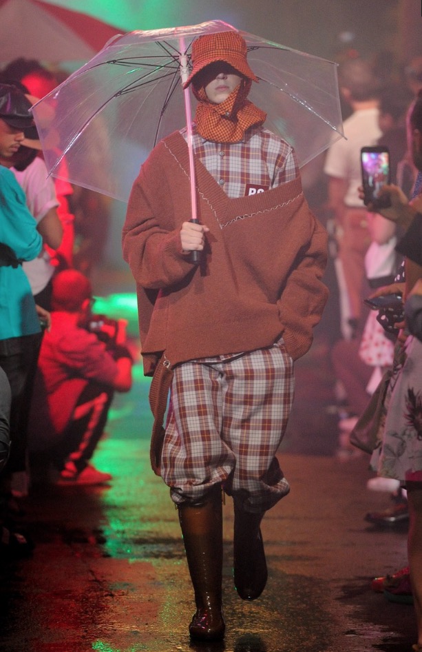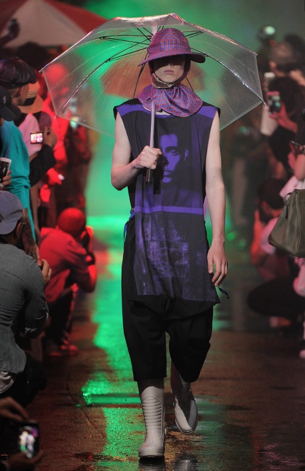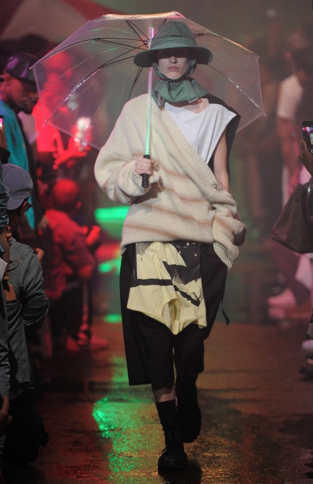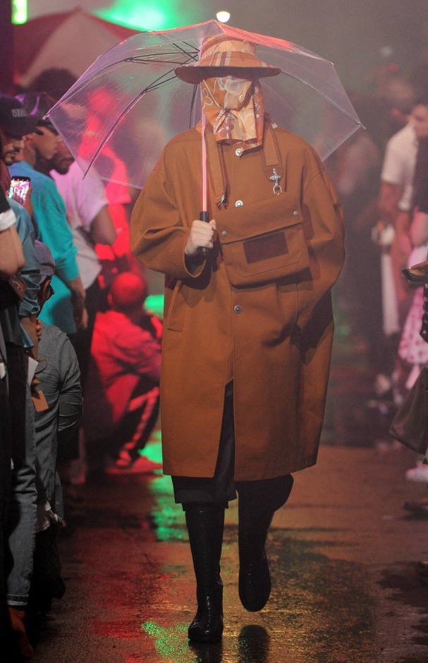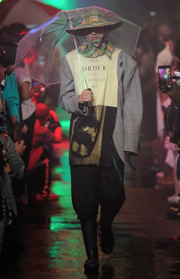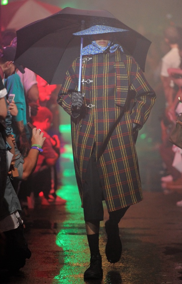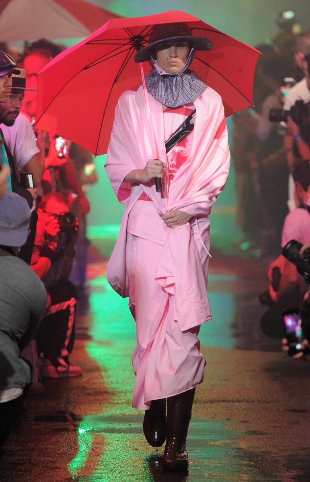 The opening look — a slouchy black rubber trenchcoat paired with matching rain boots, gardening hat and see-through umbrella with glow-in-the-dark shaft — set the tone for the cinematic collection.