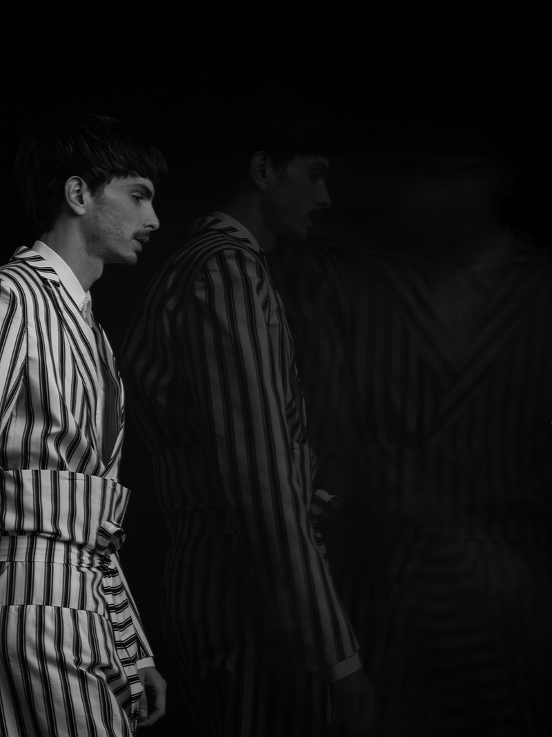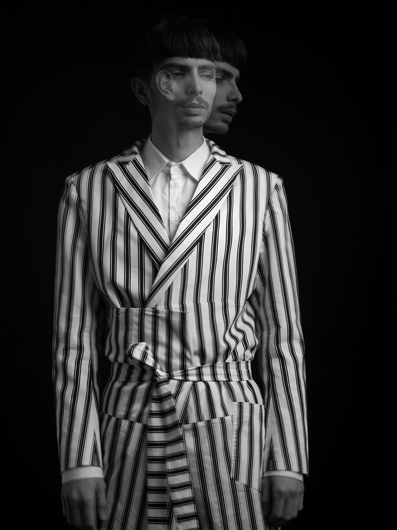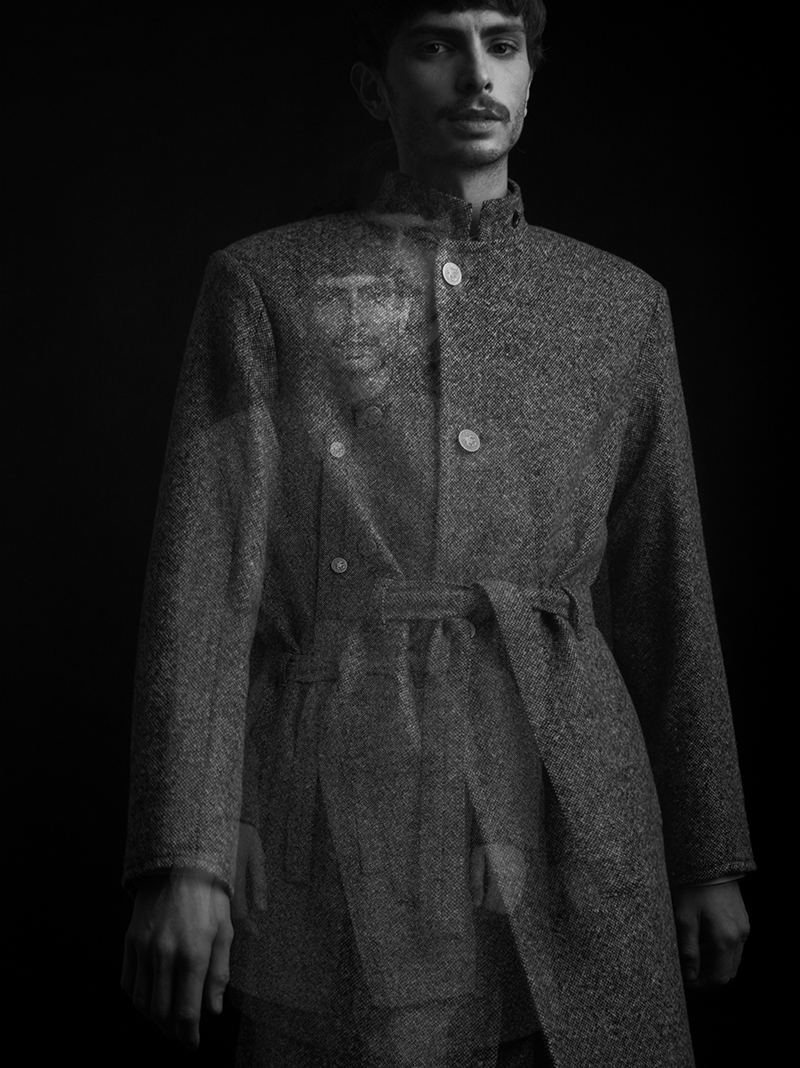 The starting point for ELIRAN NARGASSI‘s F/W 2017-18 collection is the marvel & simplicity of the human anatomy. Tracing the contours of the human body, turning it into graphic lines symmetrically following the body, along the clavicle, the shoulders, following the arms and down to the legs, while keeping emphasis on the body’s center. The tracing assignment is done using the classic inner finishes such as contrast satin bindings, commonly used in traditional tailoring, but using them on the exterior of the garment.