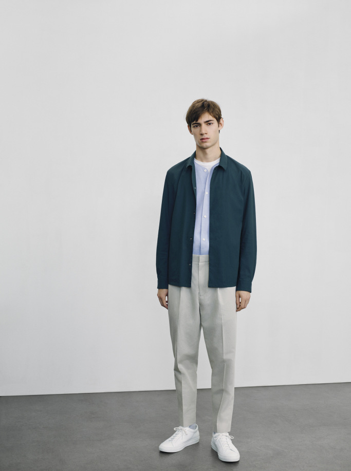 The tailored clothing offering had a subtle Fifties feel with the addition of the Gansevoort silhouette, a softly constructed suit with a natural shoulder and narrow pants. The new style came in a travel jersey and a technical nylon and polyester seersucker. Ultrathin anoraks worn under blazers enhanced the technical yet modern urban feel.