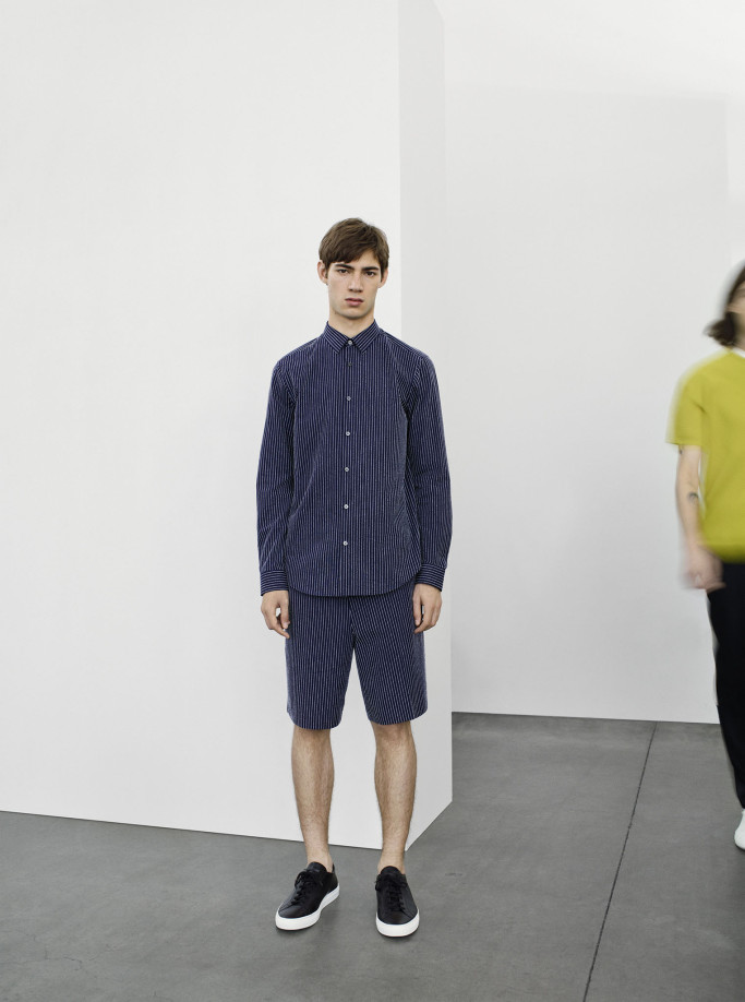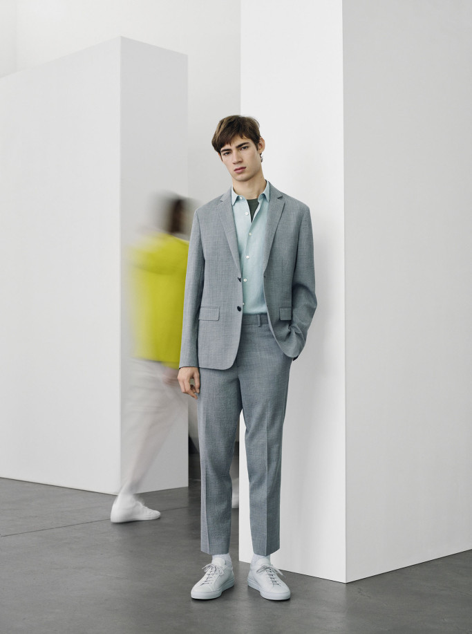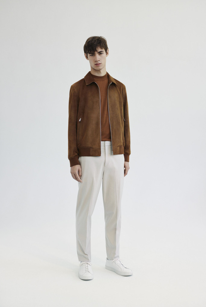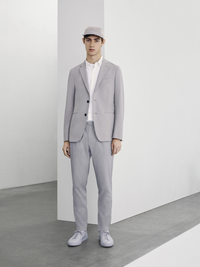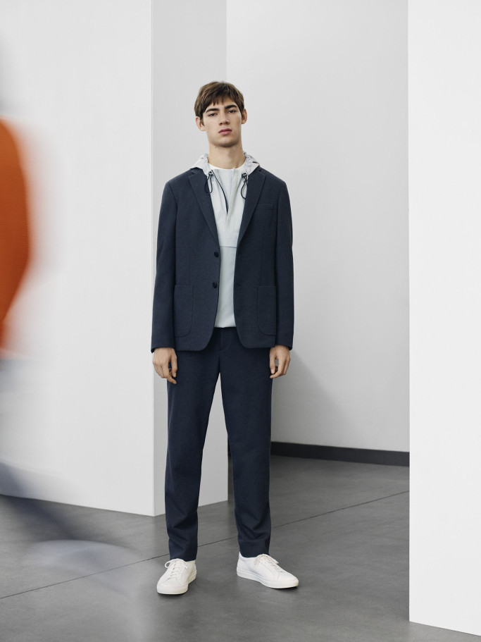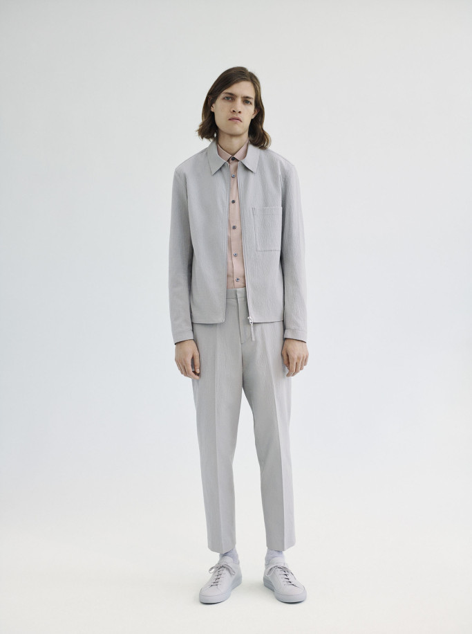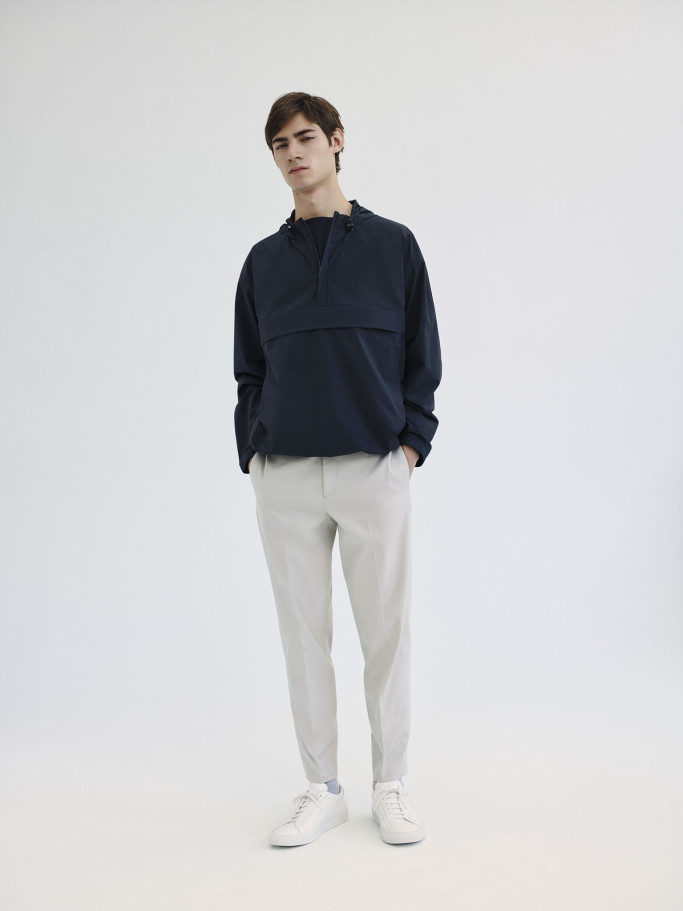 The tailored clothing offering had a subtle Fifties feel with the addition of the Gansevoort silhouette, a softly constructed suit with a natural shoulder and narrow pants. The new style came in a travel jersey and a technical nylon and polyester seersucker. Ultrathin anoraks worn under blazers enhanced the technical yet modern urban feel.