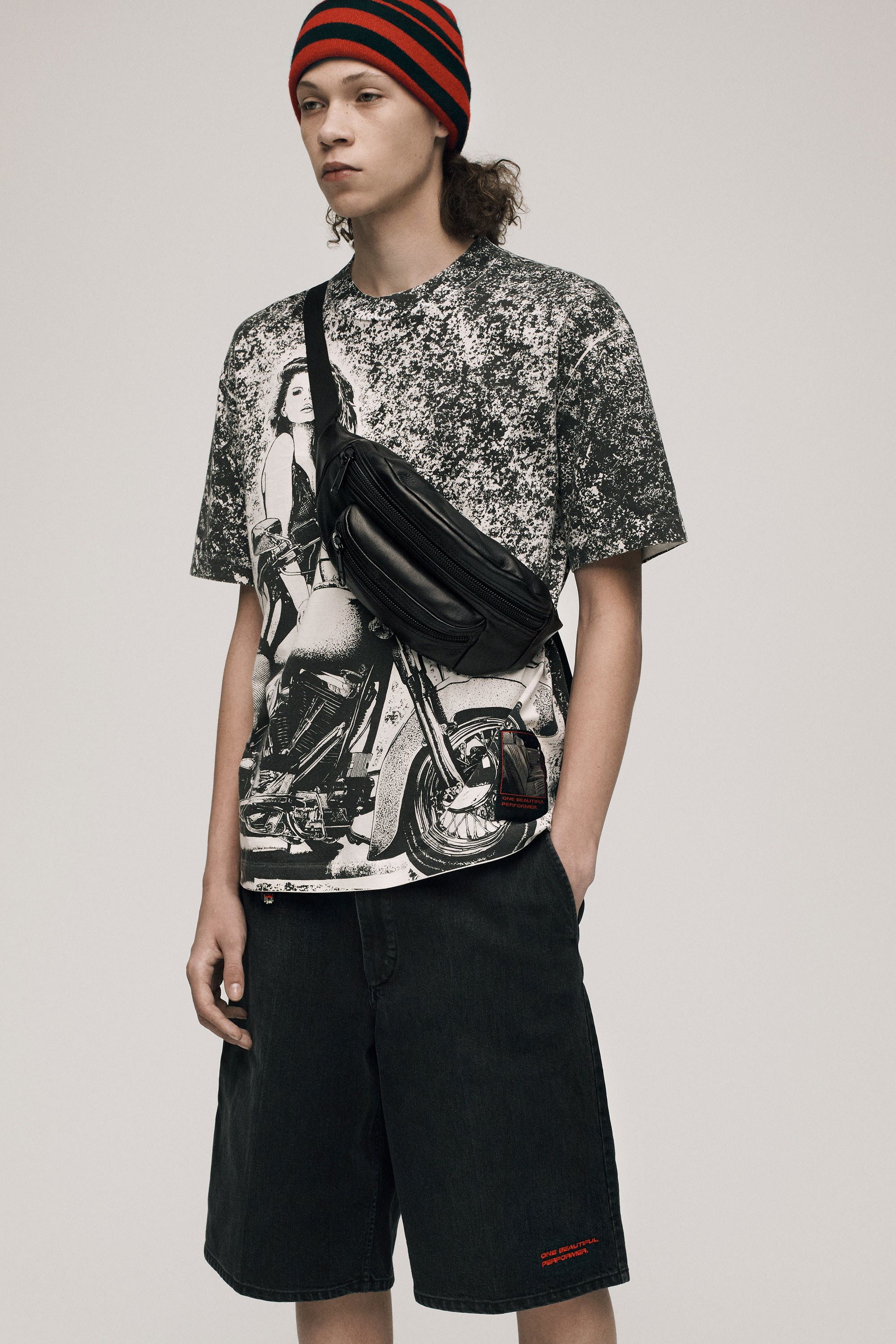 In 1983, Stephen King published what would go on to become one of his more iconic works, the automobile horror story Christine. What does this have to do with Alexander Wang Fall 2017? Wang was born in 1983, and he riffs on the nostalgic thrill of King’s killer car in his new men’s collection. Sleek ’80s automobiles appear as graphics, lightning bolts rip down sweatshirts and tees, and Wang’s logo has been reimagined in a metallic auto font. The automotive motif continues in other, more playful ways, like the babes-on-motorcycle embroideries that appear on shirts, the tone-on-tone checkerboard suiting fabric that’s been made into a jersey top and sport shorts, and the motocross trousers that work on guys and girls alike. Of course, this being Alexander Wang, the collection ventures to go there with a 1-800 number graphic advertising the grim reaper on the back of a jacket.