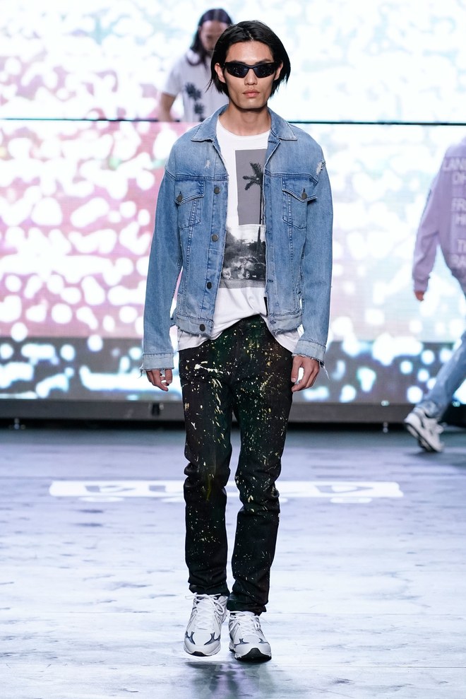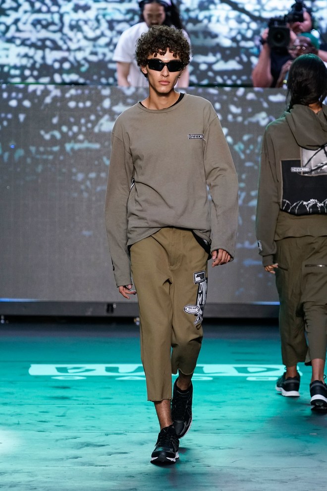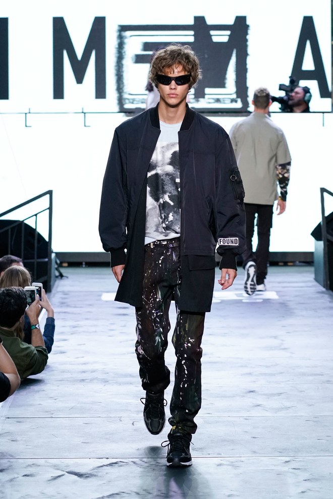 To get things going, a marching band hyped the crowd—as the line disbanded, Aoki hit the turntables and the first model exited. “This season started off with the idea of the world we’re living in right now. It’s chaotic, there’s mayhem. The collection is about trying to find hope inside it—paradise found, living in this dichotomous reality,” said the designer. Flak jackets, hoodies, and t-shirts—with cyborg palm trees, featuring standard fronds but with barbed-wire trunks—captured that intent. Some pieces had the phrase, “Land of the free, home of the brave,” patch-worked across the back. “That idea is missing now in the U.S.,” said Aoki. (Worth noting: He has brought his production and design studio over to the States—Las Vegas, in particular, where he lives—from Japan.)